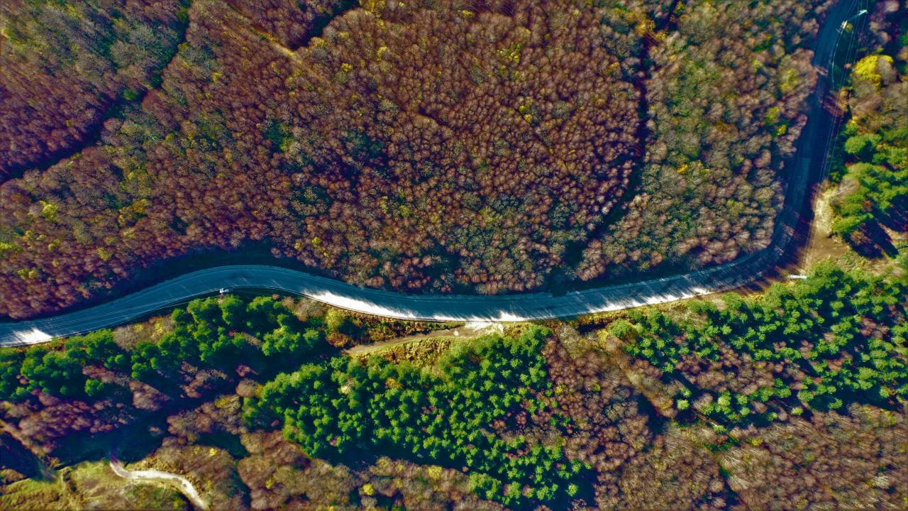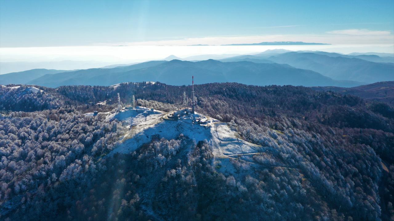 Zirvenin beyazı, ağaçların yeşil ve kahverengi görüntüsü güzel manzaralar oluşturuyor.