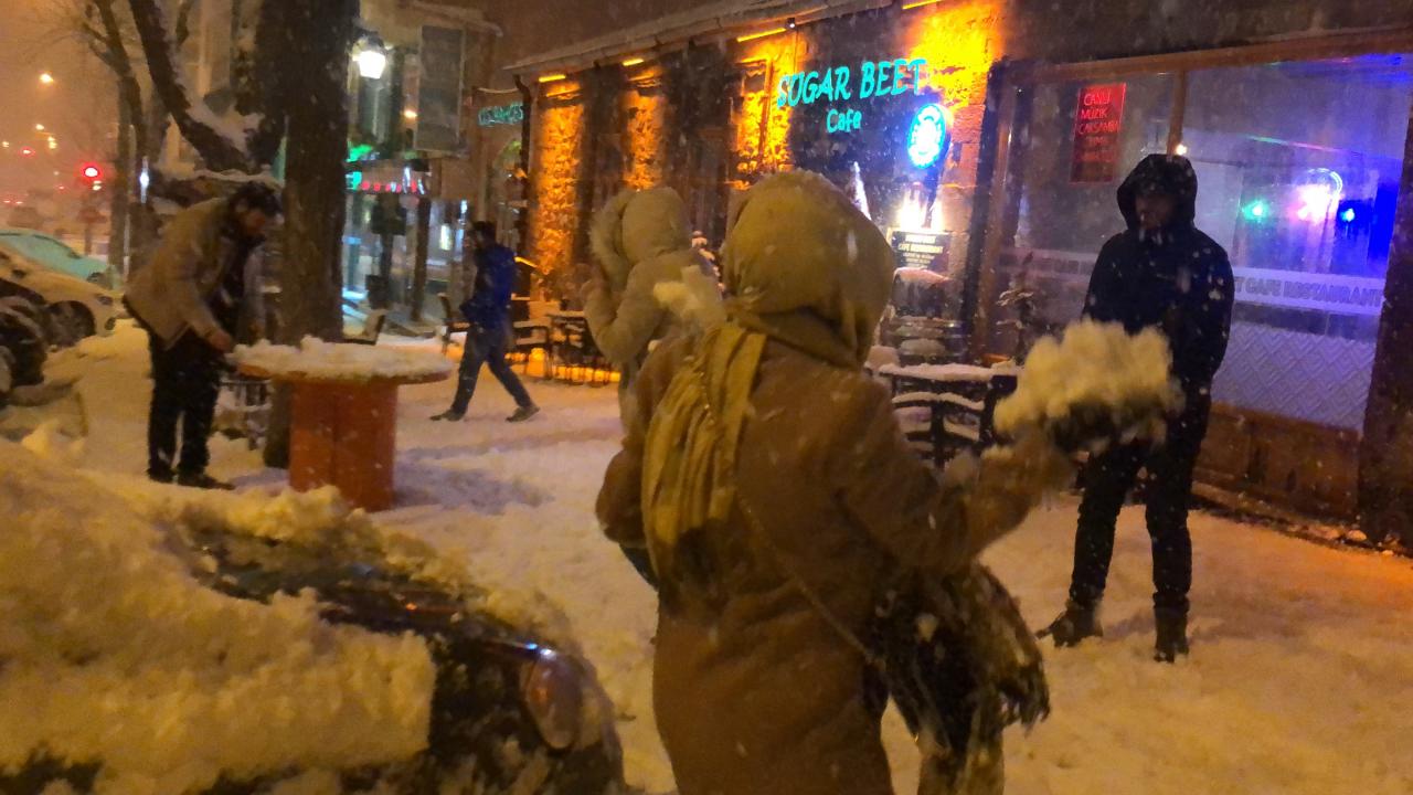 Kars’ta lapa lapa yağan kar, vatandaşları sokaklara döktü. Kar altında gençler gönüllerince kar topu oynadı, naylon poşetlerin üstüne oturarak kaydı.