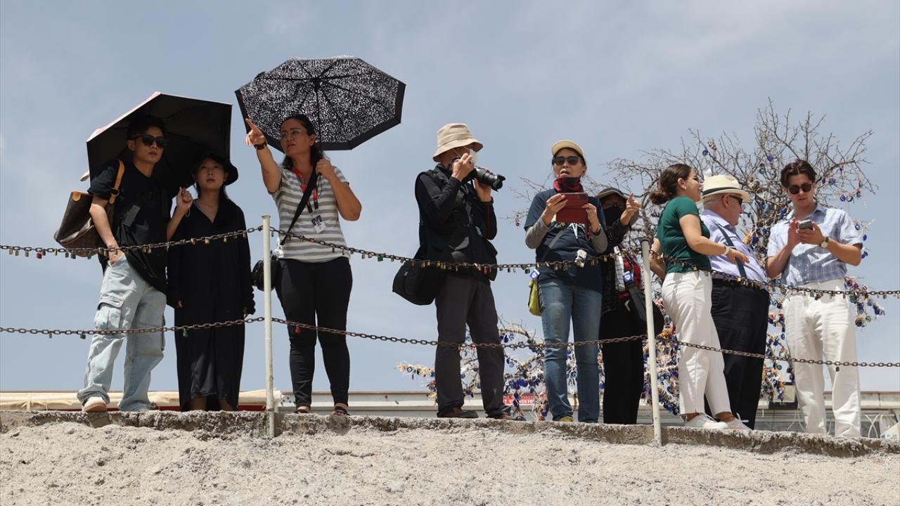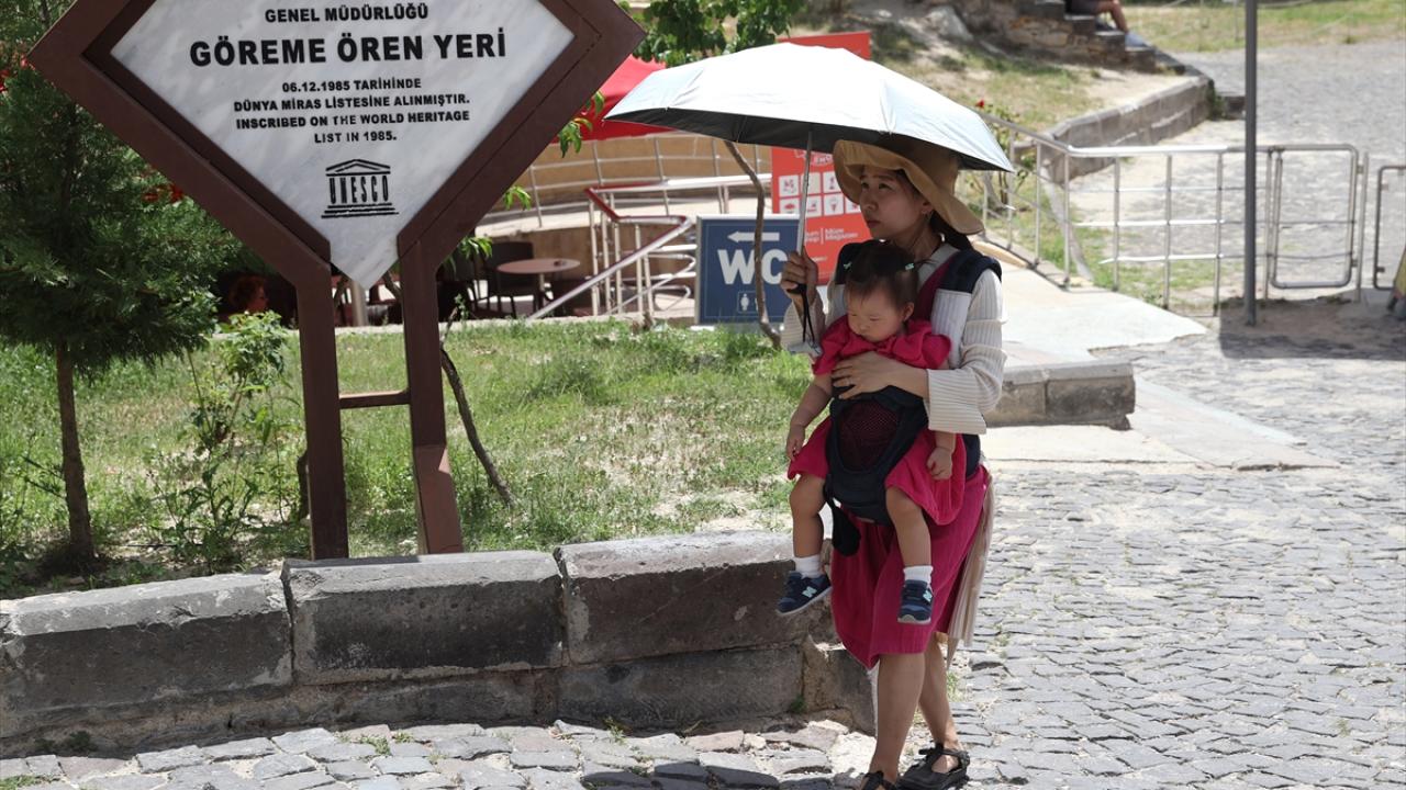 Peribacaları ve doğal kaya oluşumlarıyla kaplı alanları gezen turistler, şemsiye ve şapka ile güneşten korunmaya çalışırken, dondurma satış stantlarında yoğunluk oluştu.