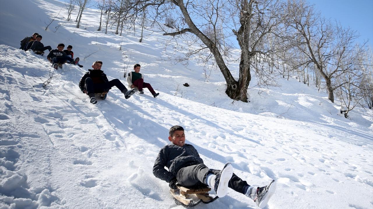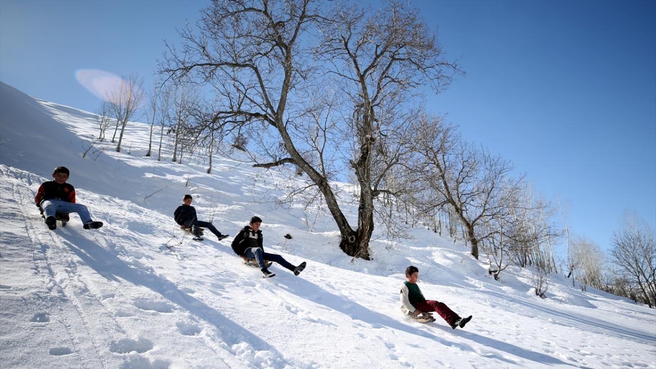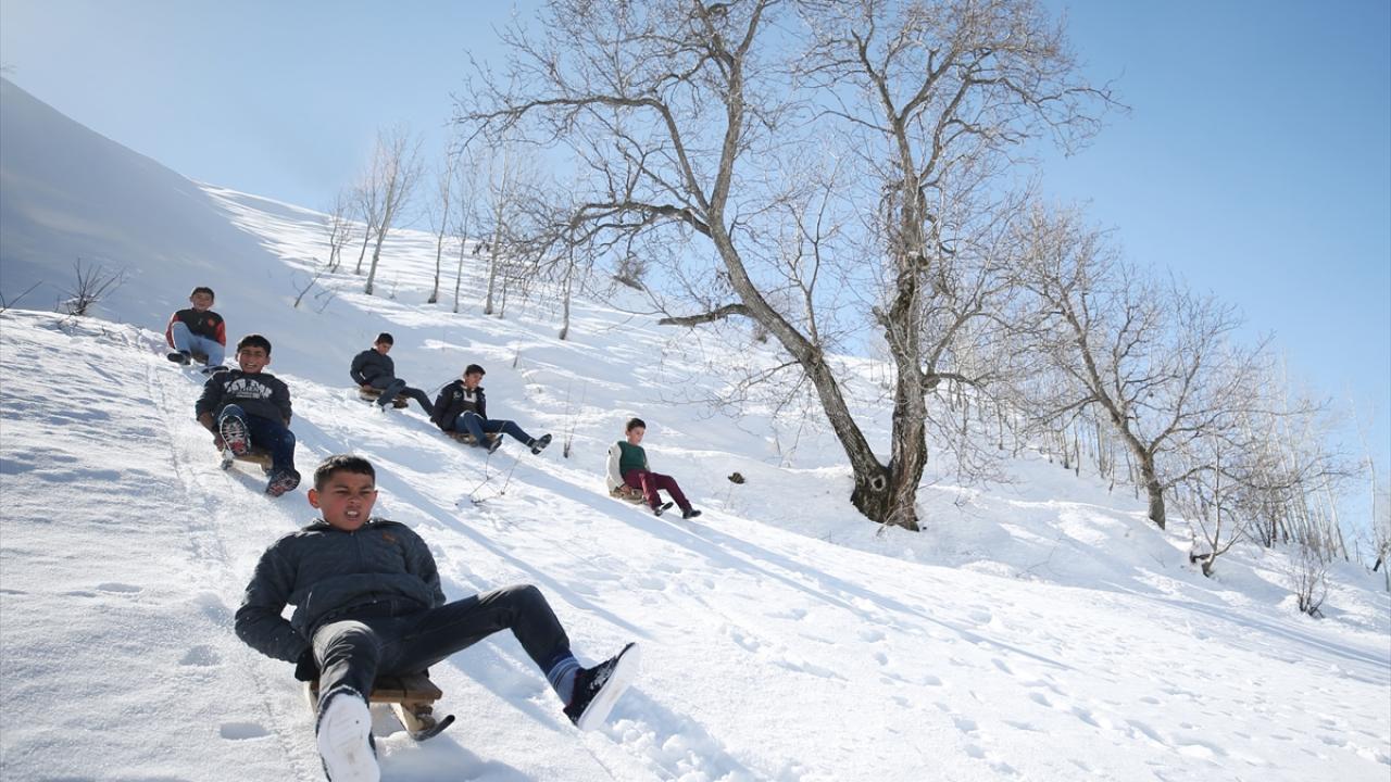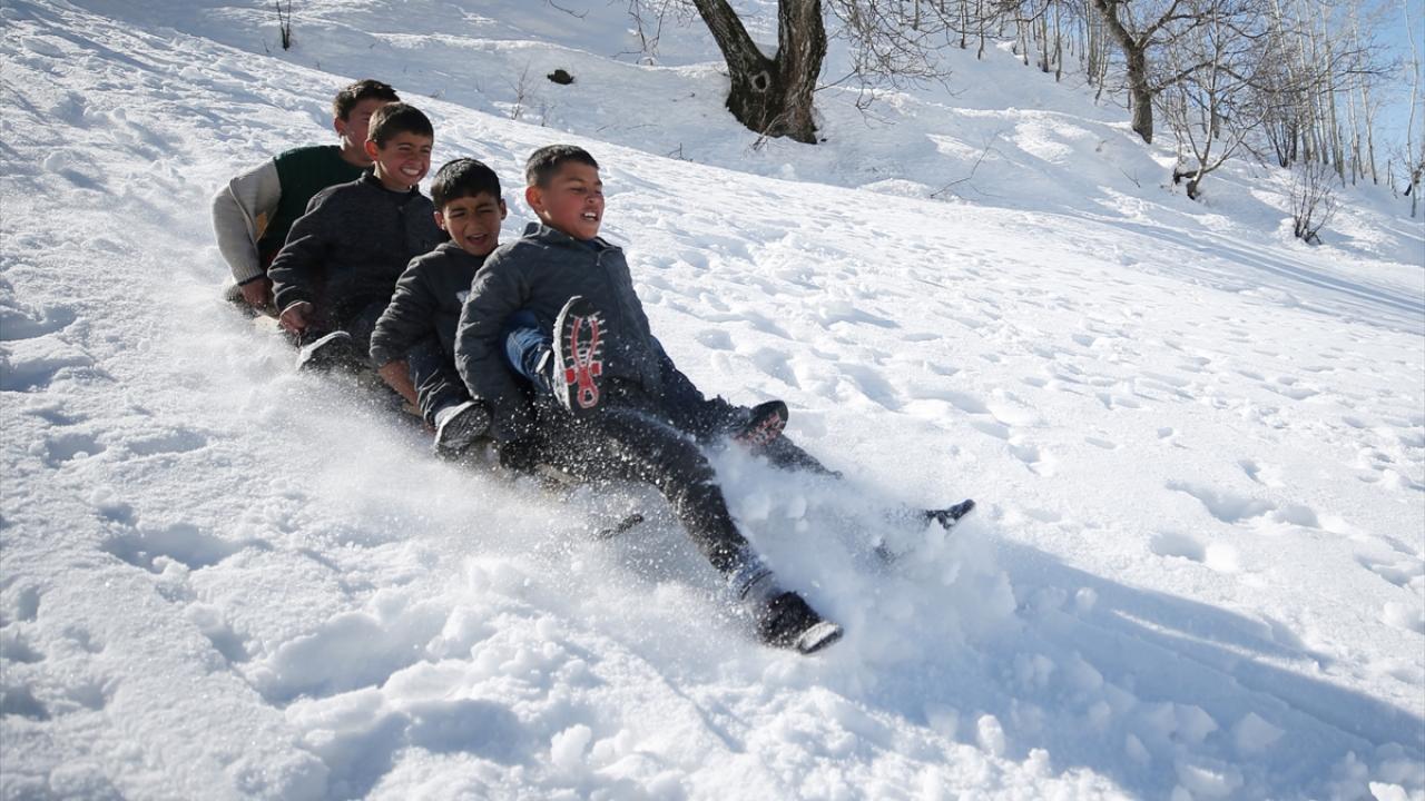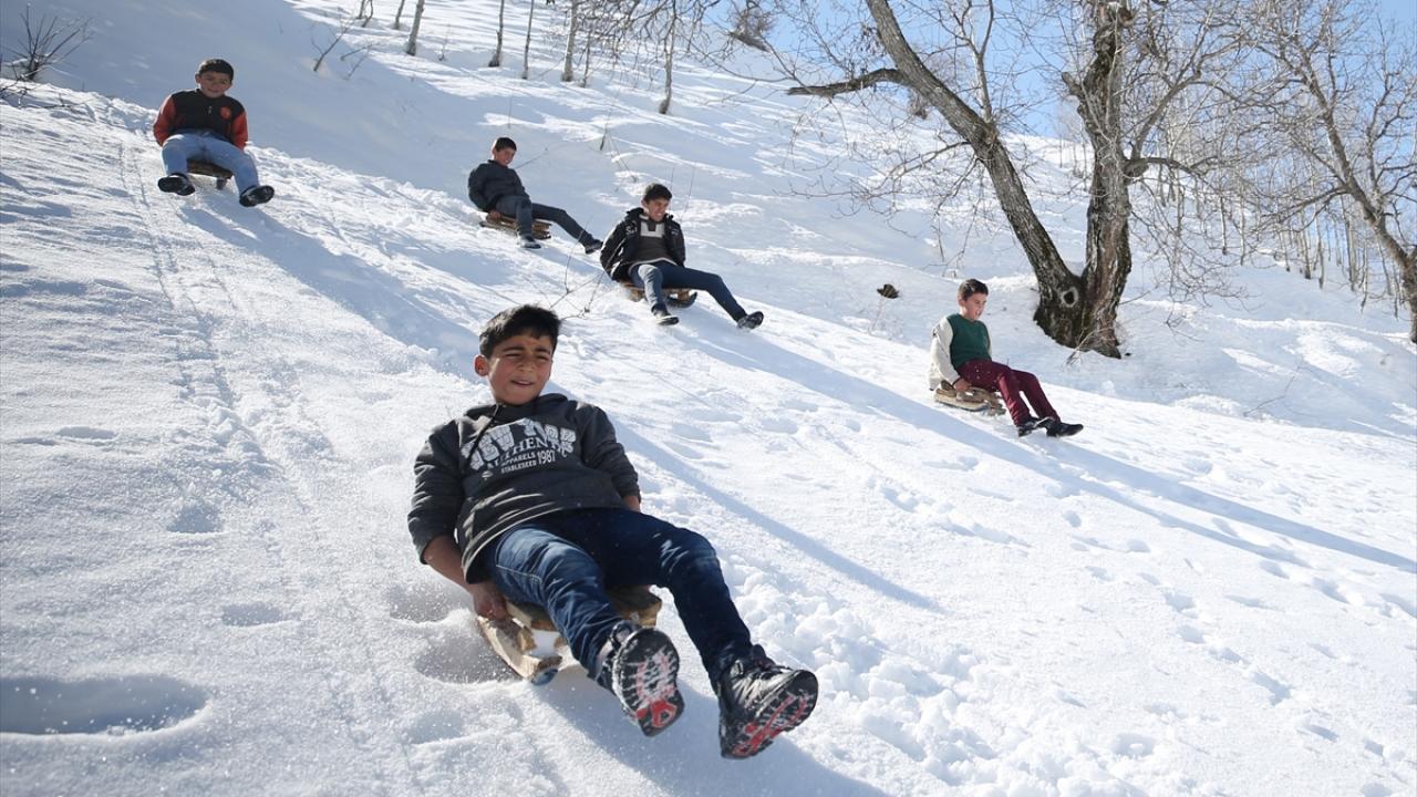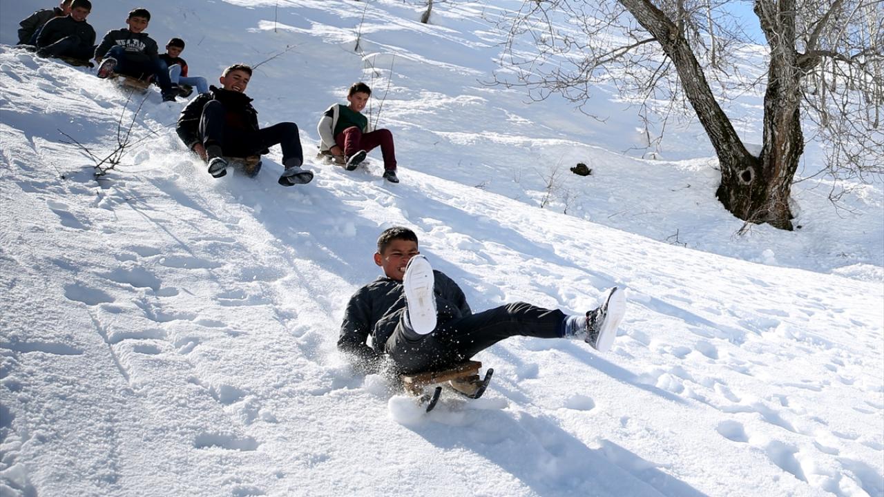 Bitlis'te kar yağışının ardından çocuklar, kayak yapmanın keyfini yaşıyor.