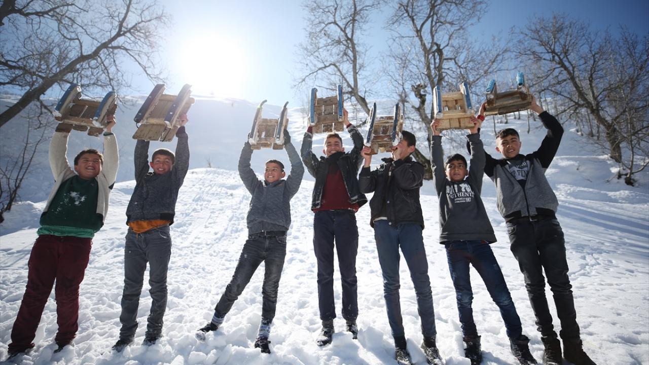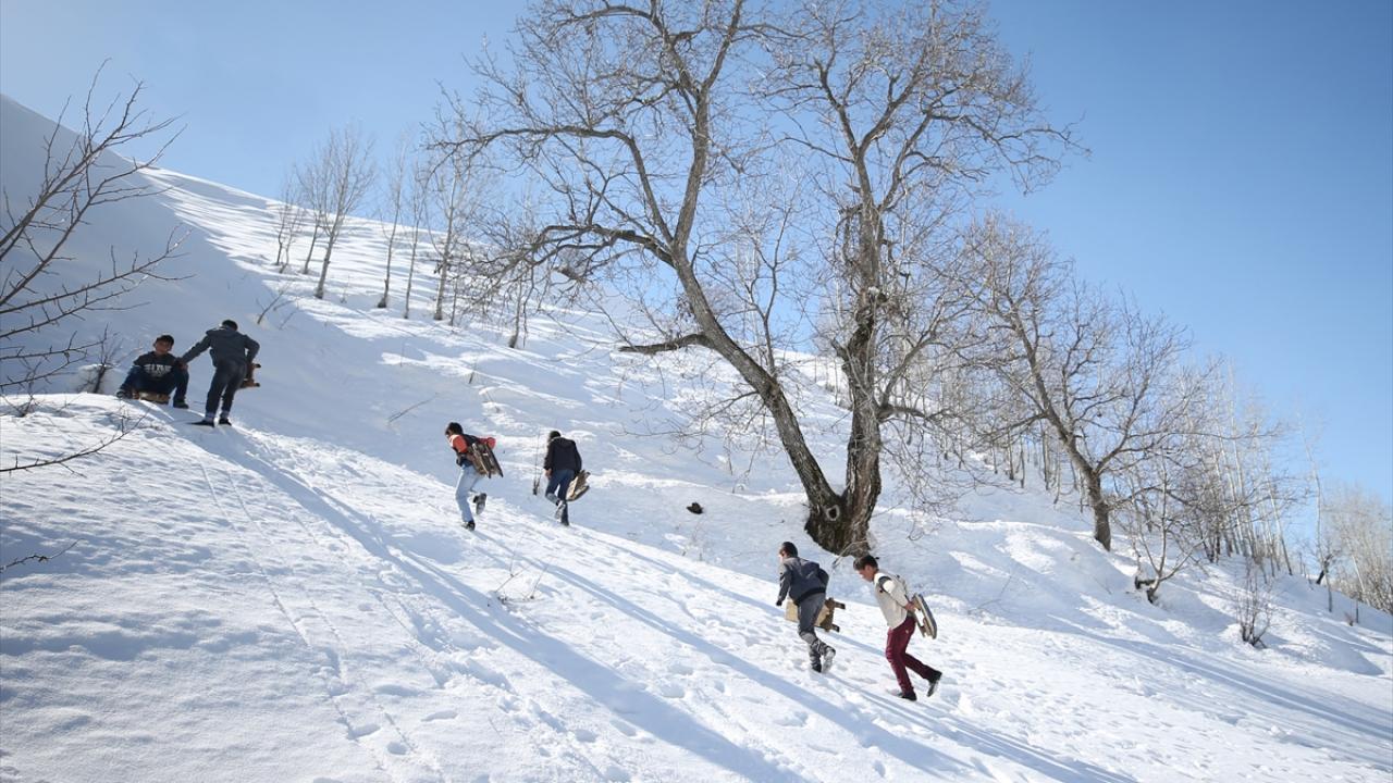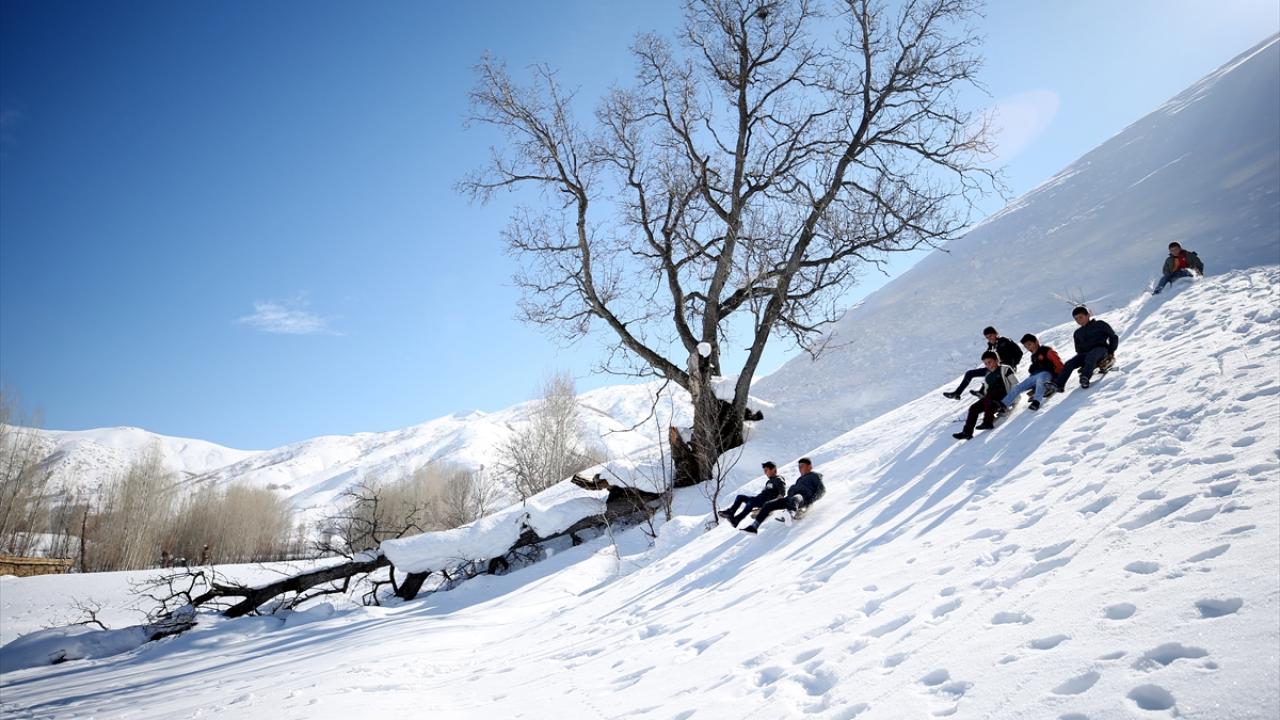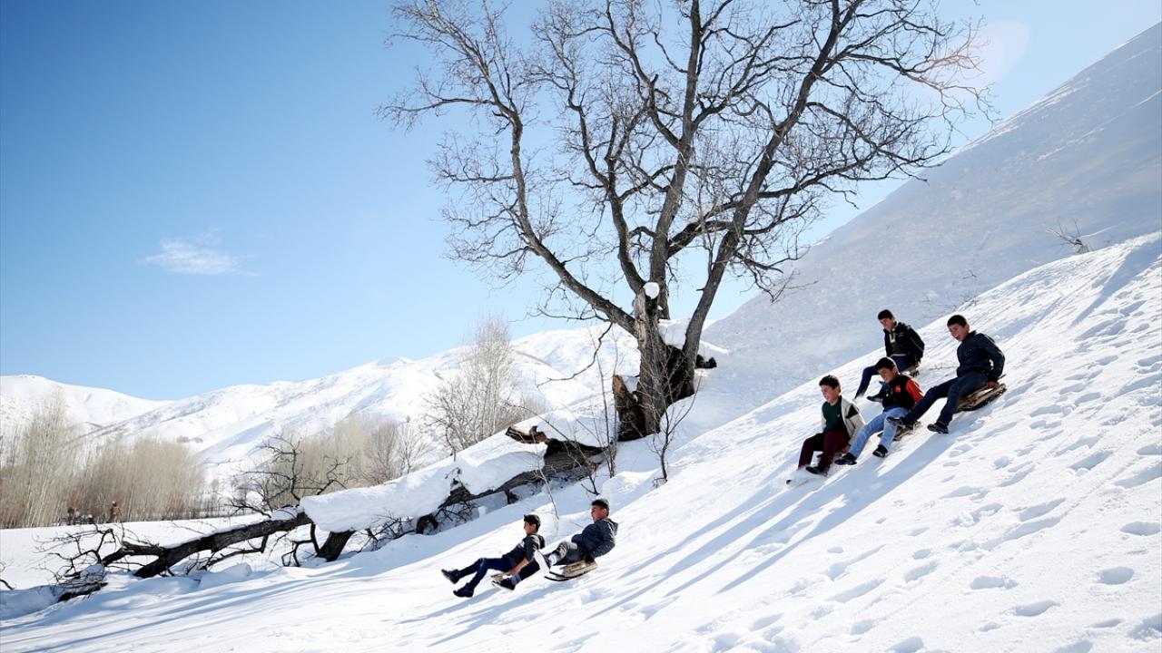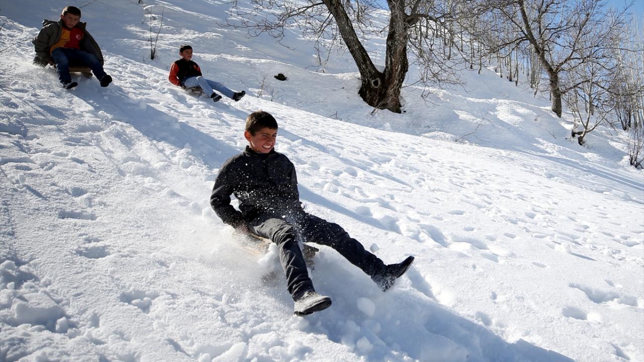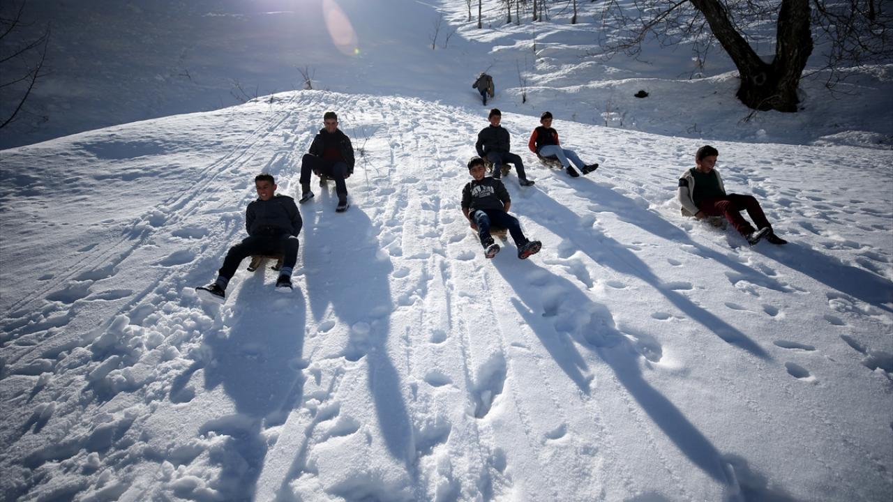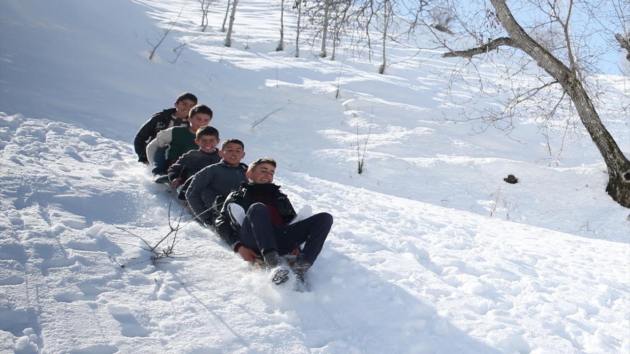Bitlis'te kar yağışının ardından çocuklar, kayak yapmanın keyfini yaşıyor.