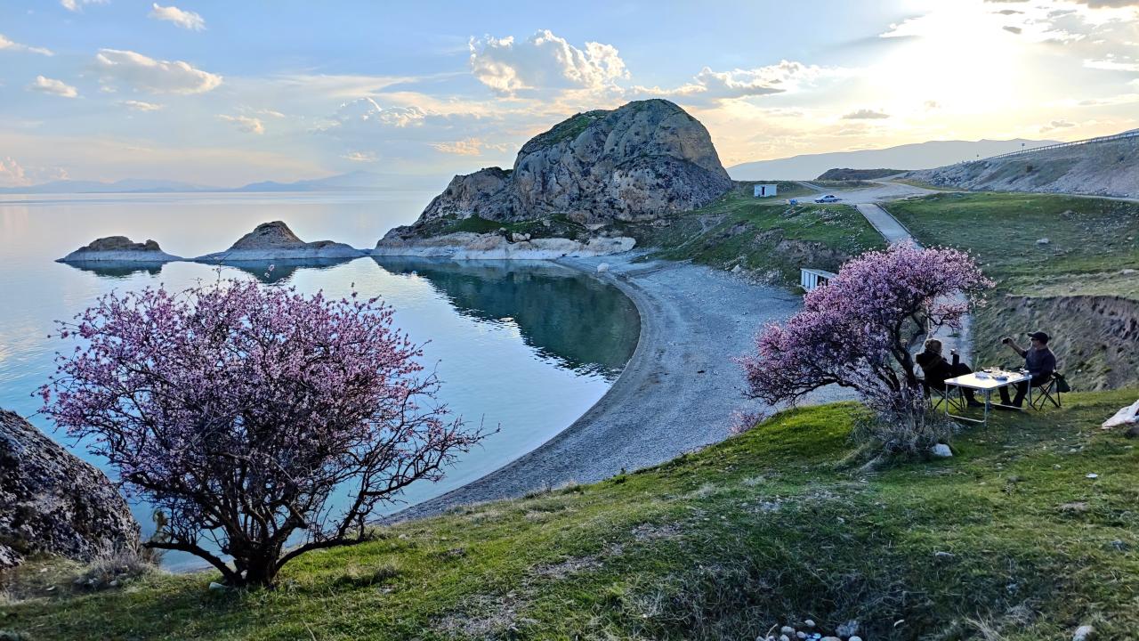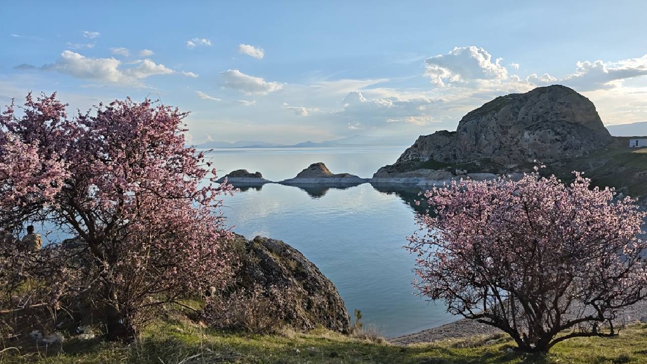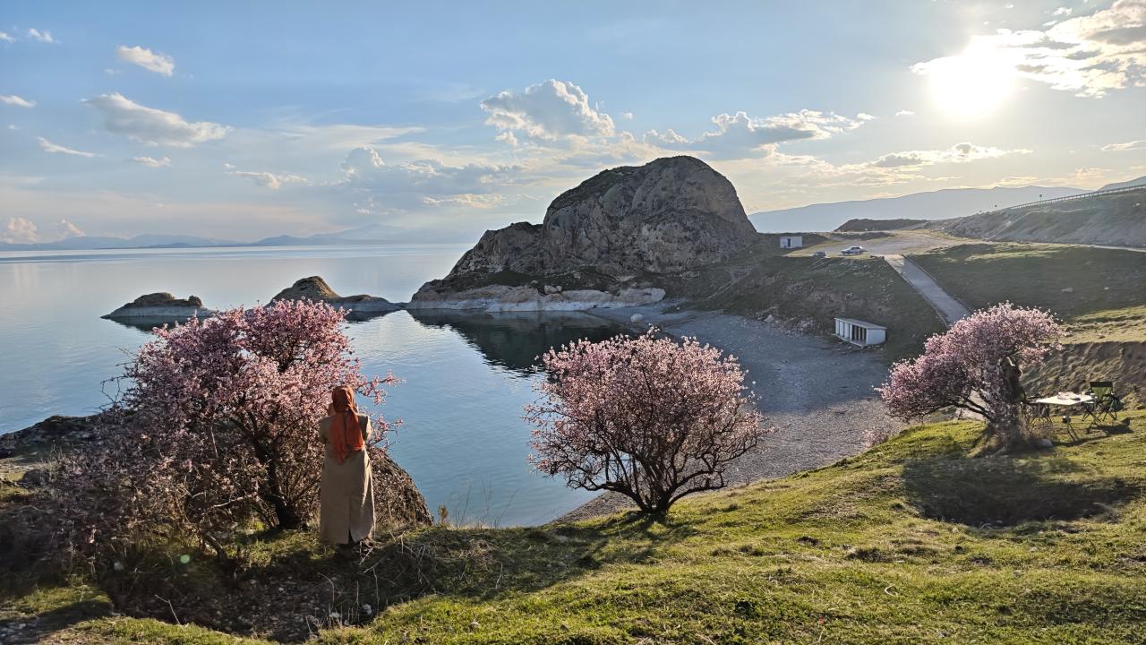 Bahar havasını değerlendiren vatandaşlar ile fotoğraf tutkunları, bölgeye gelerek hem göl manzarasını izledi hem de çiçek açan ağaçları görüntüledi.