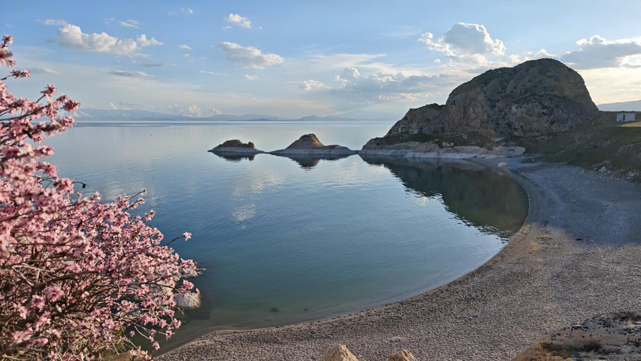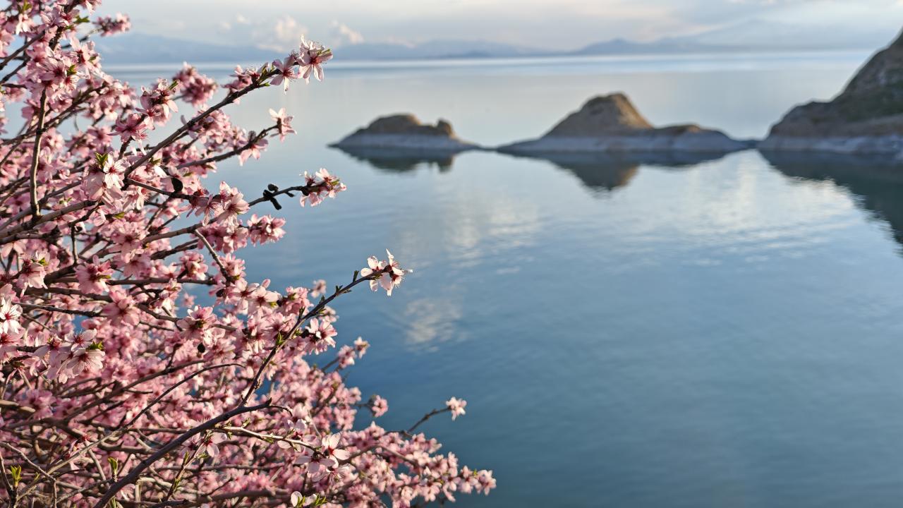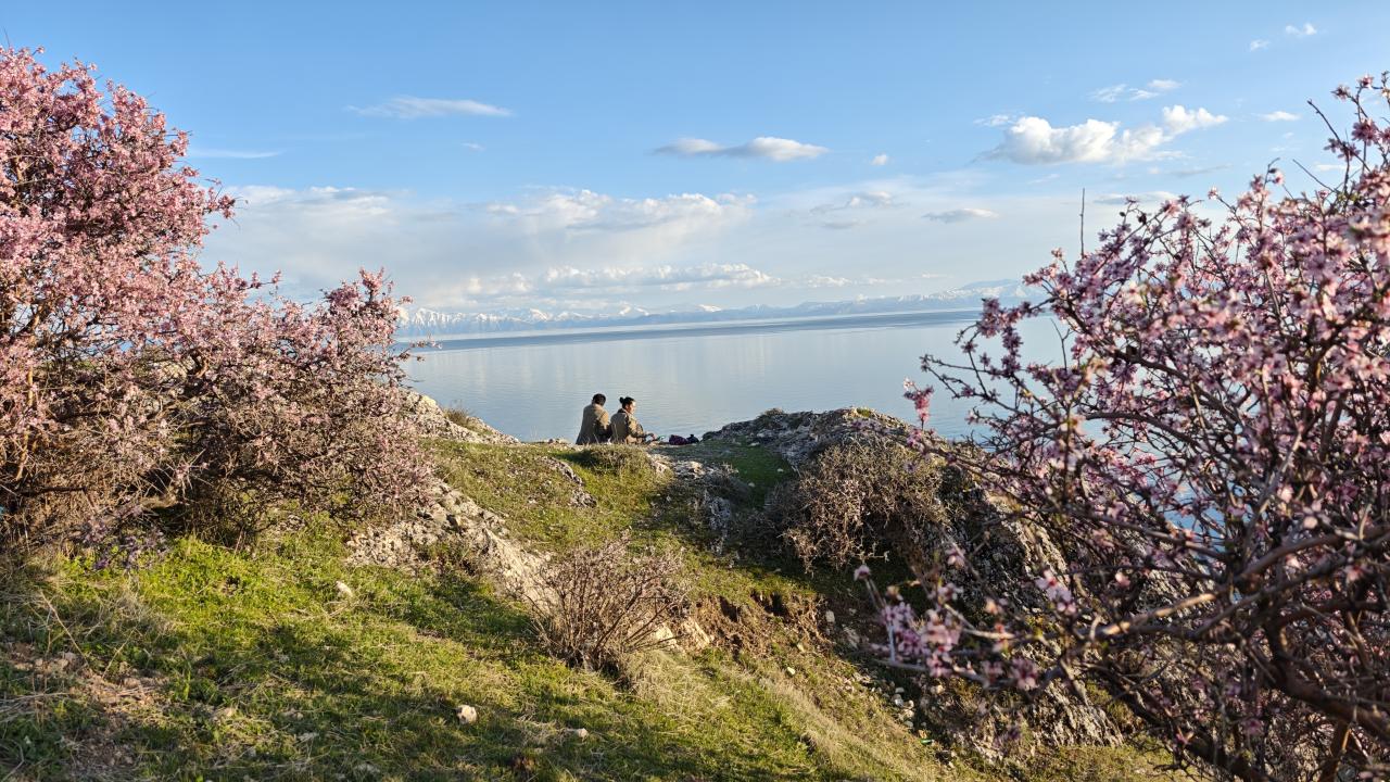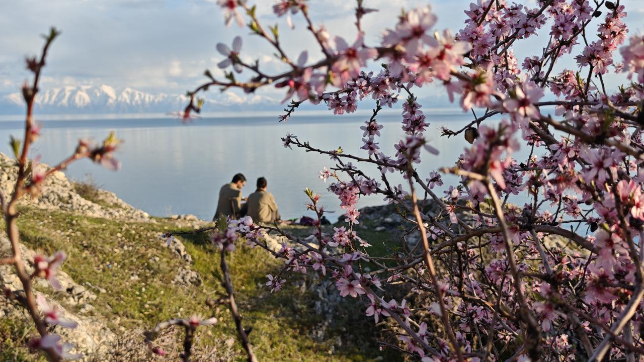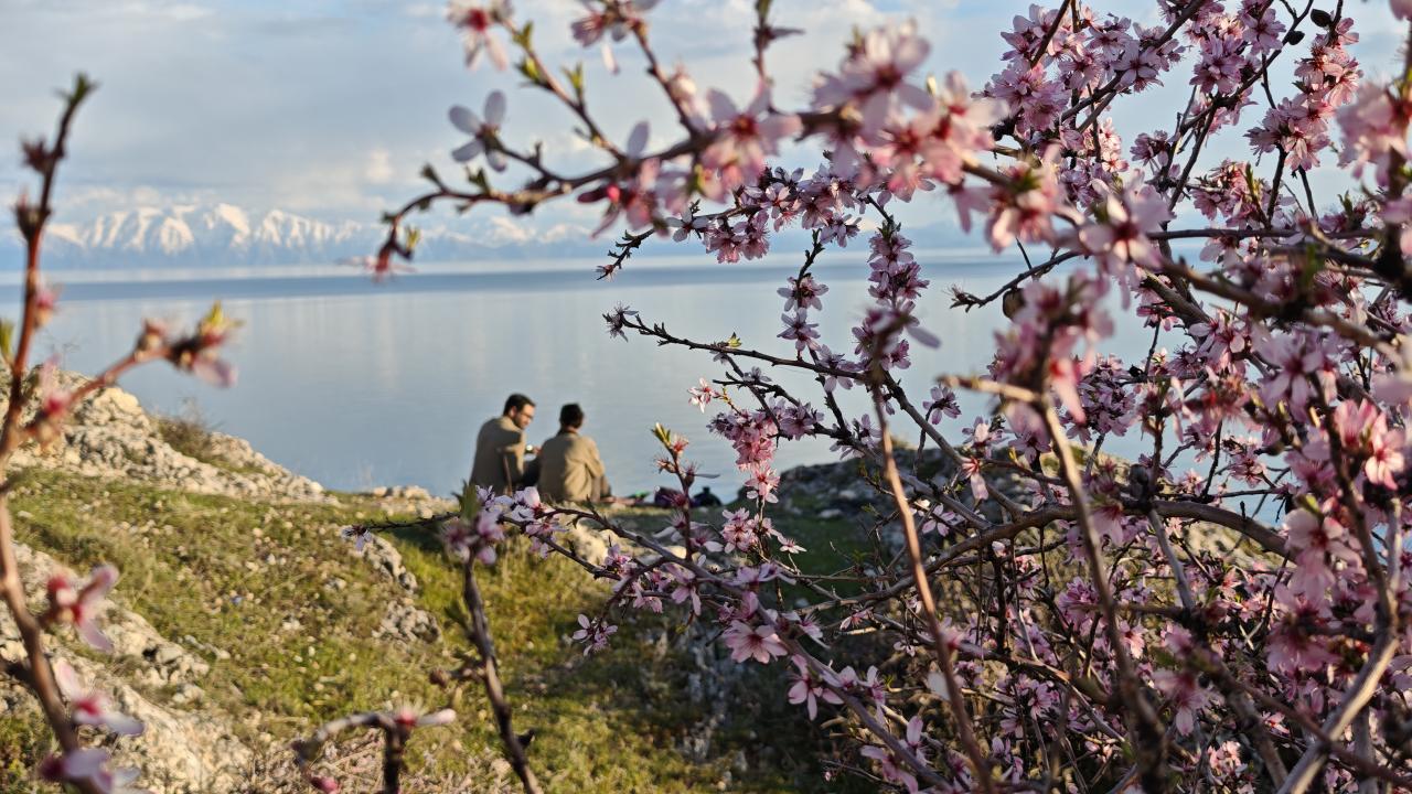Bitlis'te çiçek açan badem ağaçları Van Gölü kıyısını renklendirdi