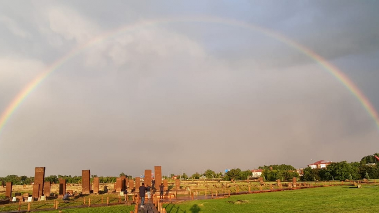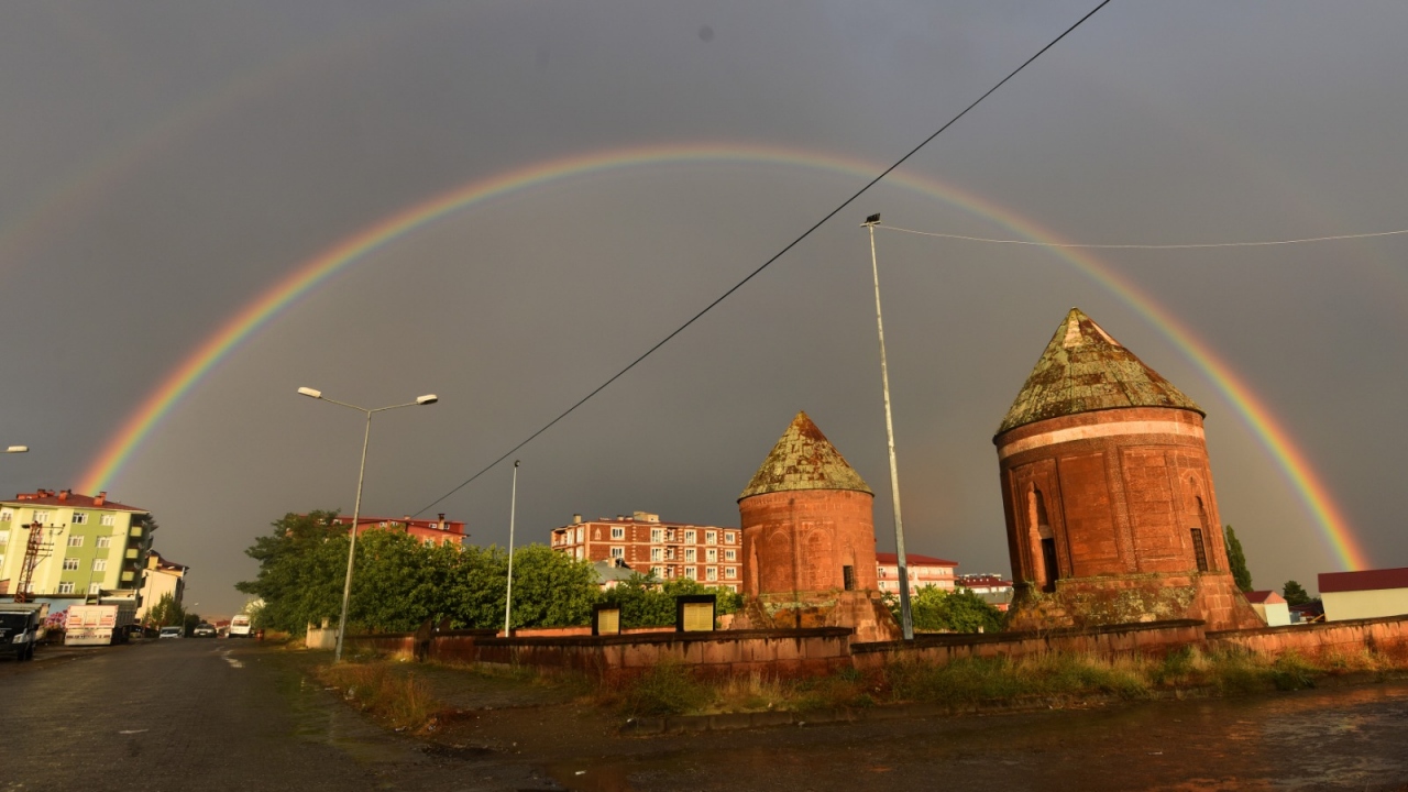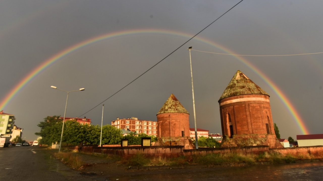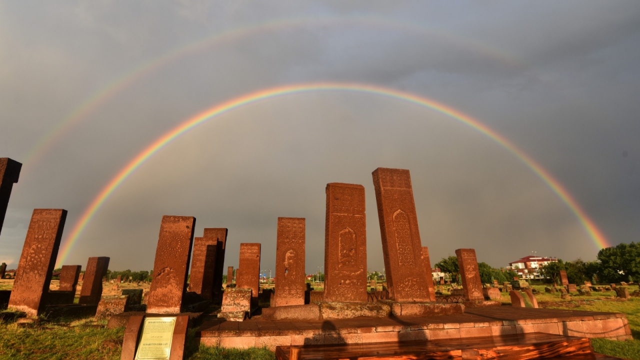 Bitlis'in Ahlat ilçesinde yağmurdan sonra ortaya çıkan gökkuşağı tarihi eserlerle birlikte hayranlık uyandırdı.