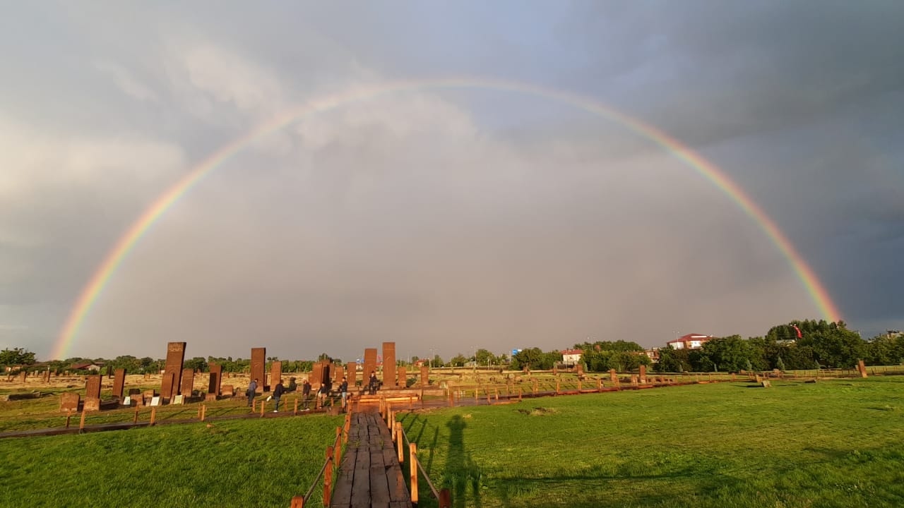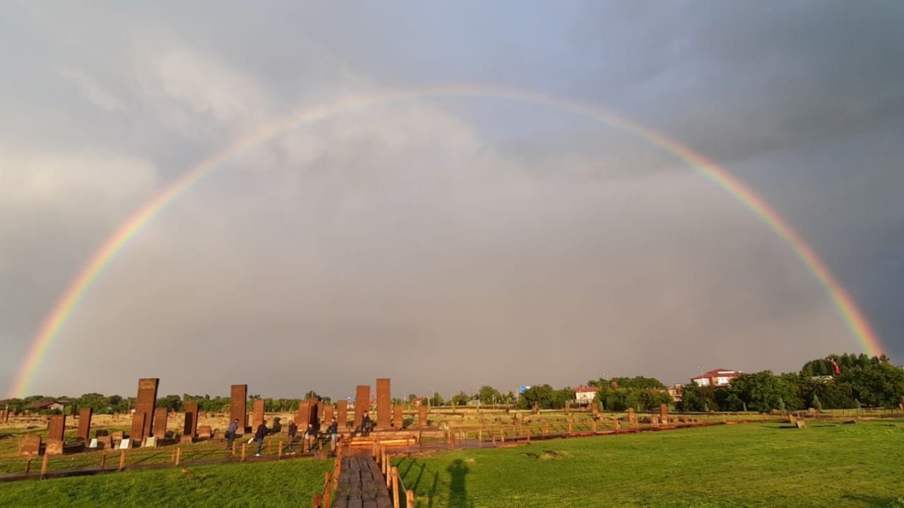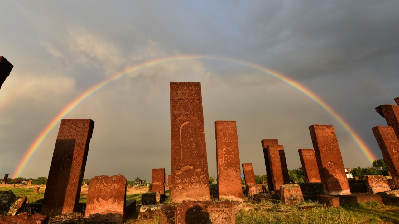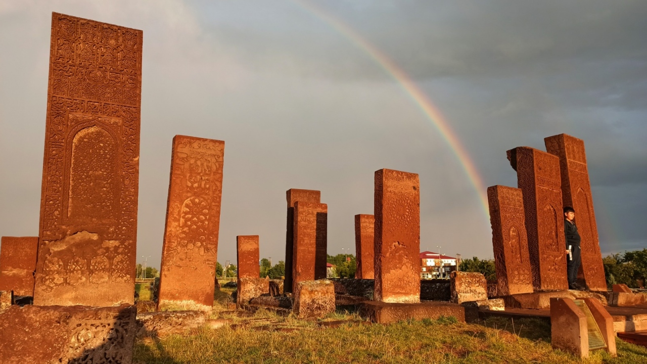 Bitlis'in Ahlat ilçesinde yağmurdan sonra ortaya çıkan gökkuşağı tarihi eserlerle birlikte hayranlık uyandırdı.