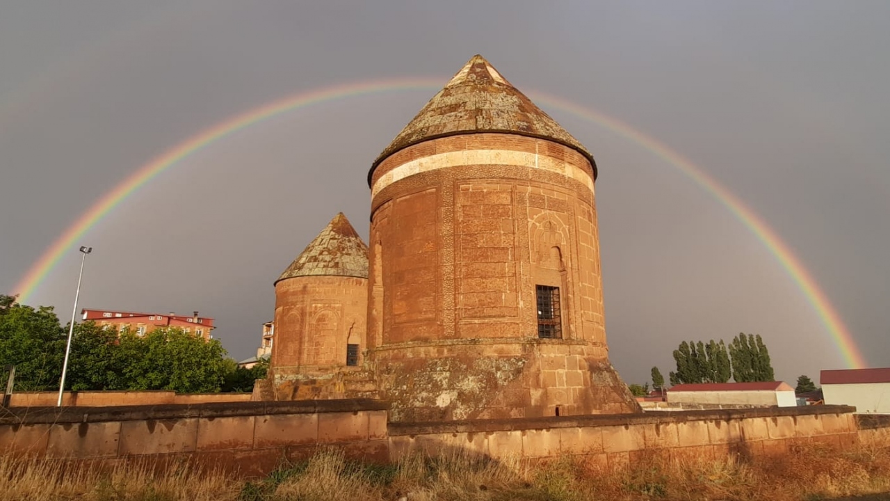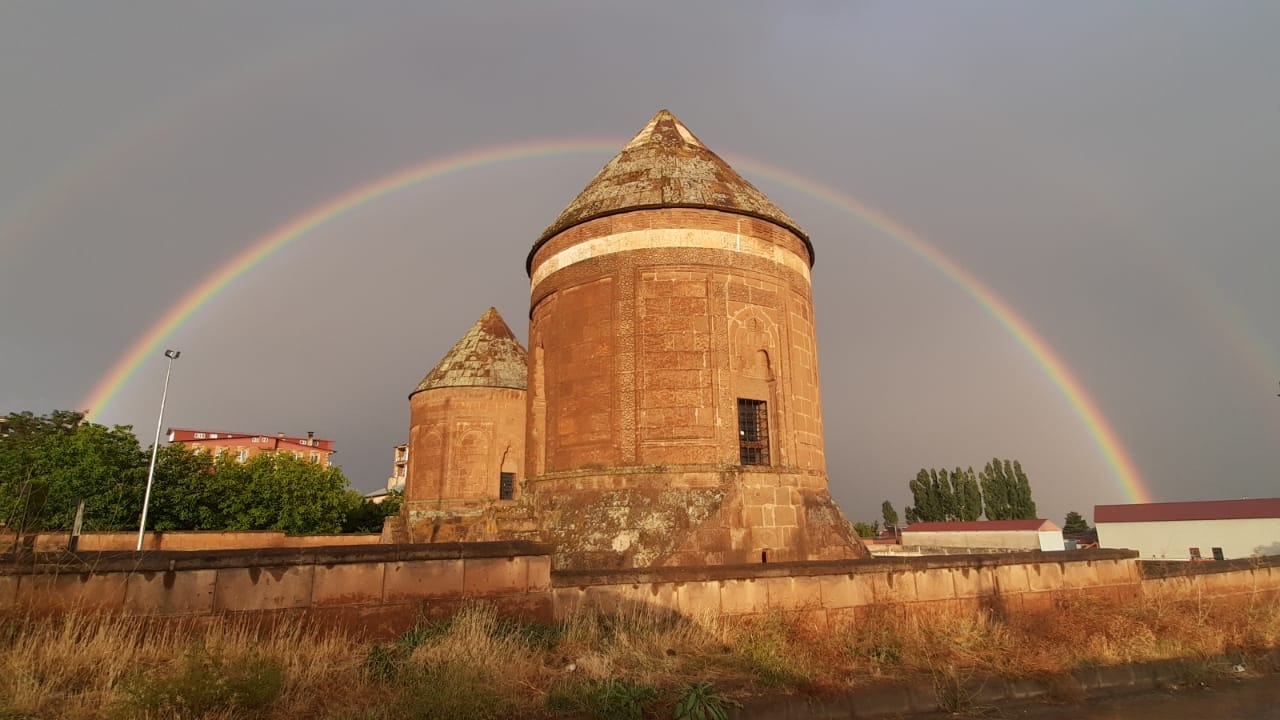Gökkuşağı’nın ilçedeki kümbetler ve Selçuklu Meydan Mezarlığı ile bütünleştiği görüntüler izleyenleri hayran bırakırken ortaya çıkan eşsiz manzarayı fotoğraflamak isteyen ilçe sakinleri cep telefonu ile fotoğraf ve video çekti.