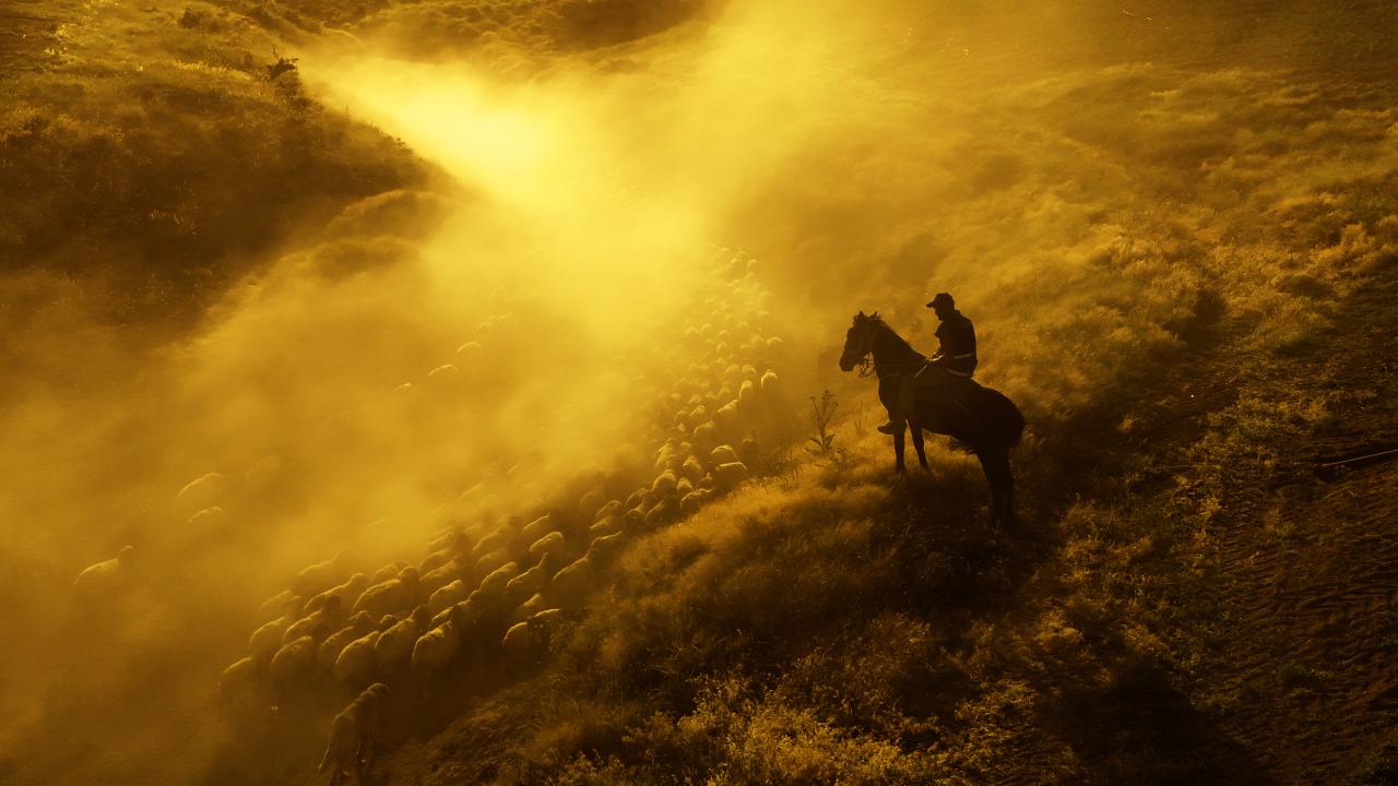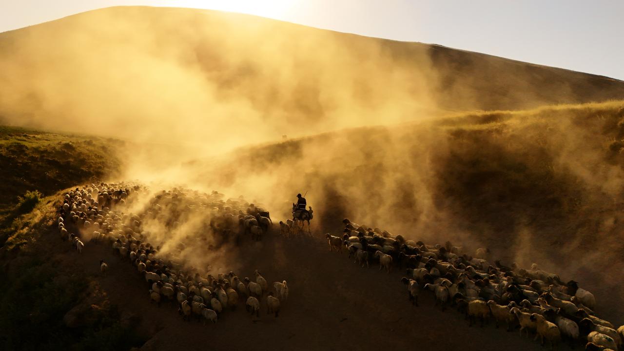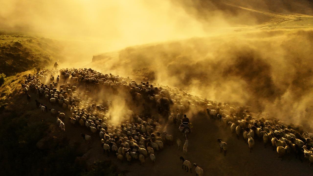 Koyun sürülerinin çıkardığı tozların gün batımı ile birlikte oluşturduğu görüntüler havadan görüntülendi.