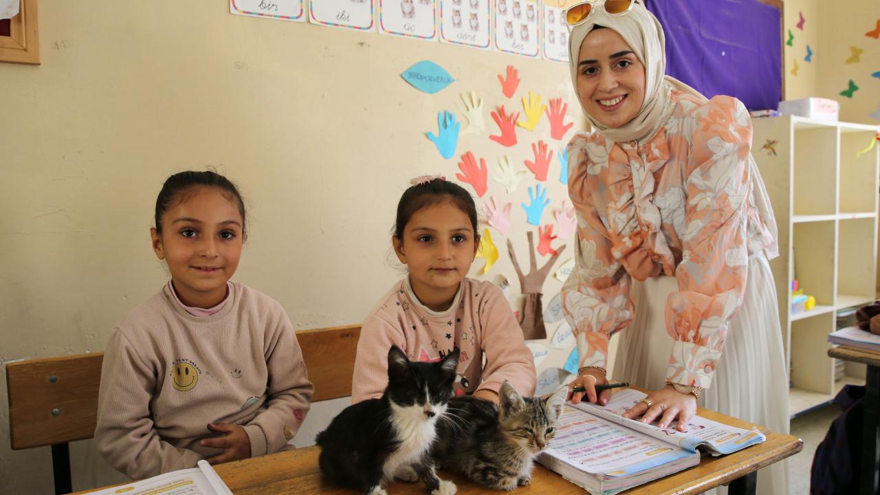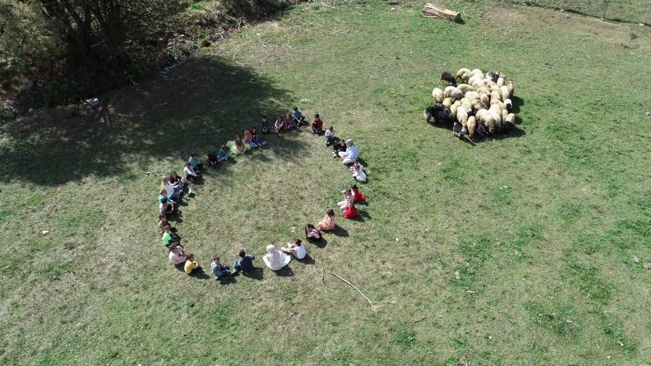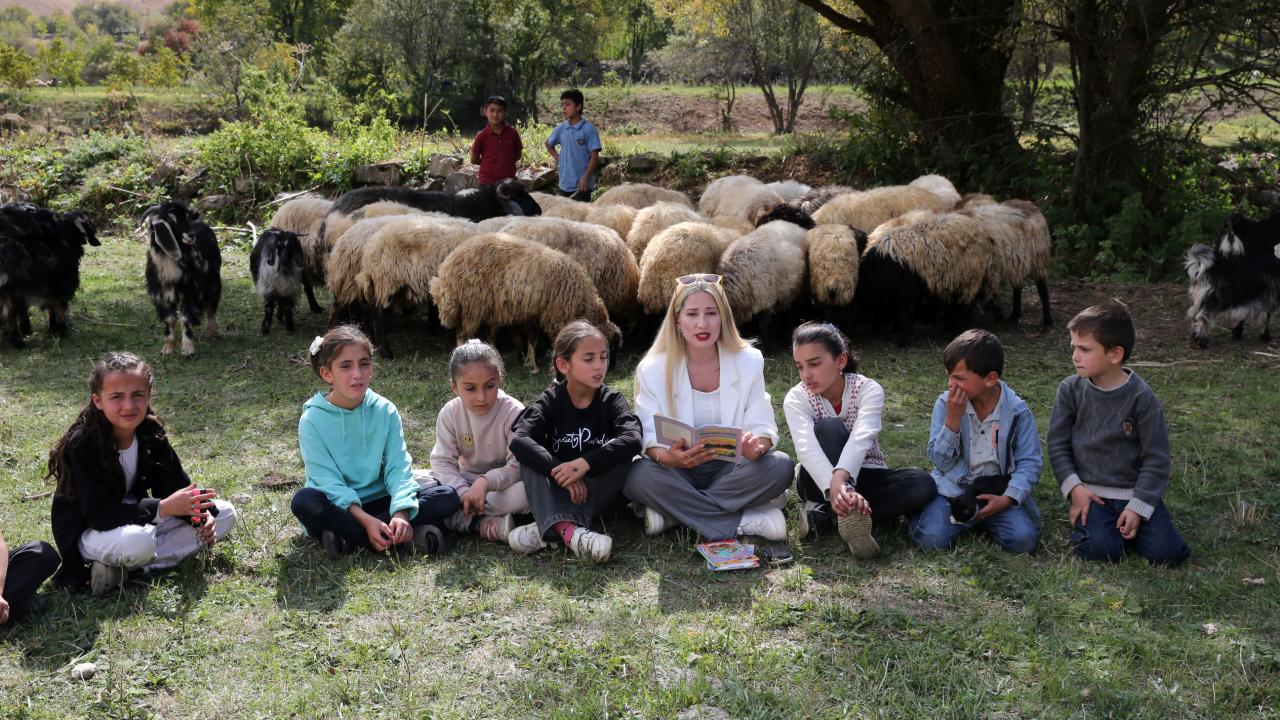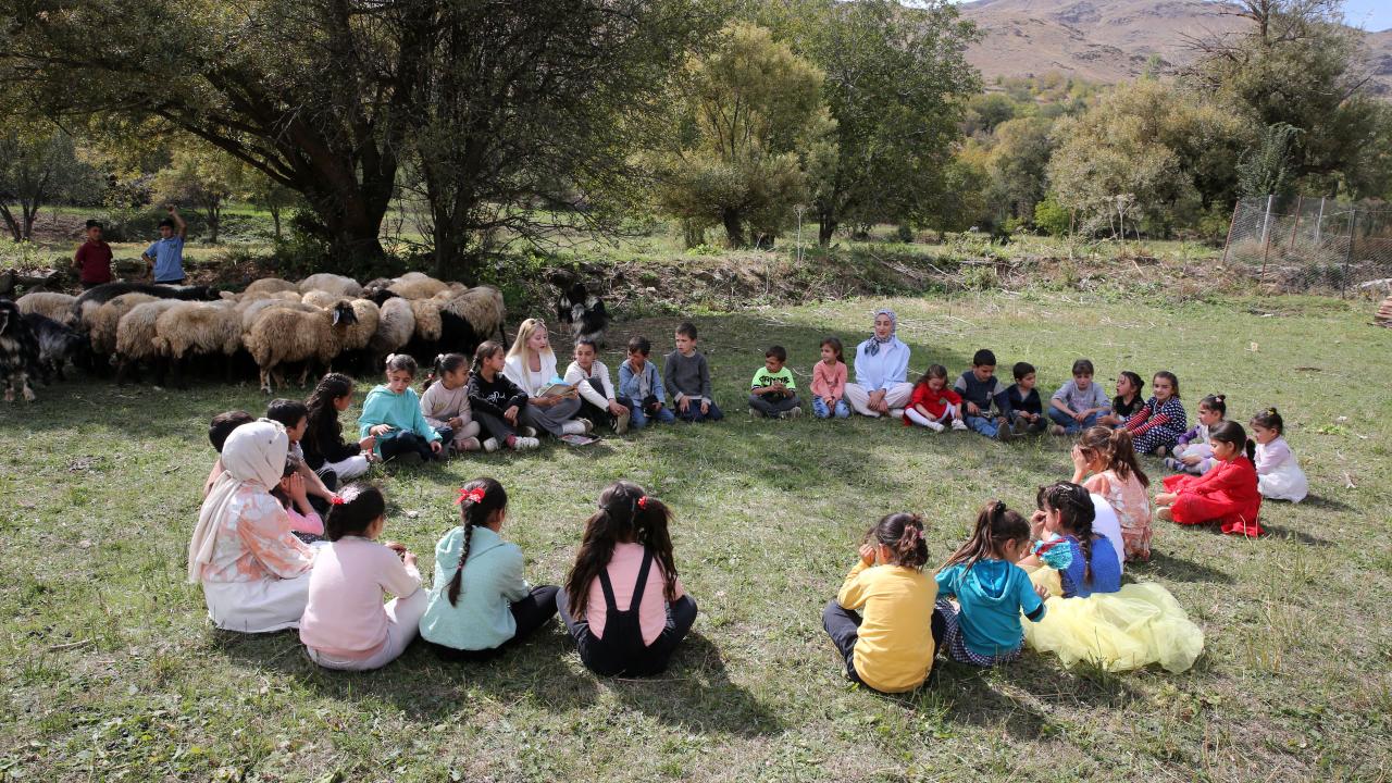 Açık alanda kitap okuduklarını, resim yaptıklarını, etkinlikler düzenlediklerini anlatan Gencer, "Şu anda ders işlediğimiz ortamda koyunlar, keçiler ve kediler var. Doğayla iç içe bir ortamdayız. Bundan hem çocuklar hem de biz çok memnunuz. Eğitim faaliyetlerimiz güzel şekilde ilerliyor. İşlediğimiz konuların tekrarını yapıyor, soruları yanıtlıyoruz" ifadelerini kullandı.