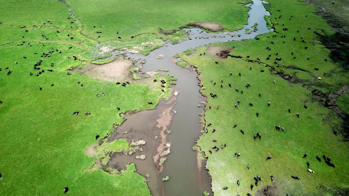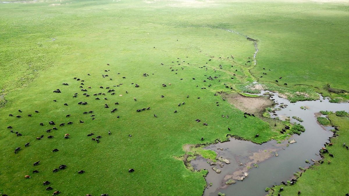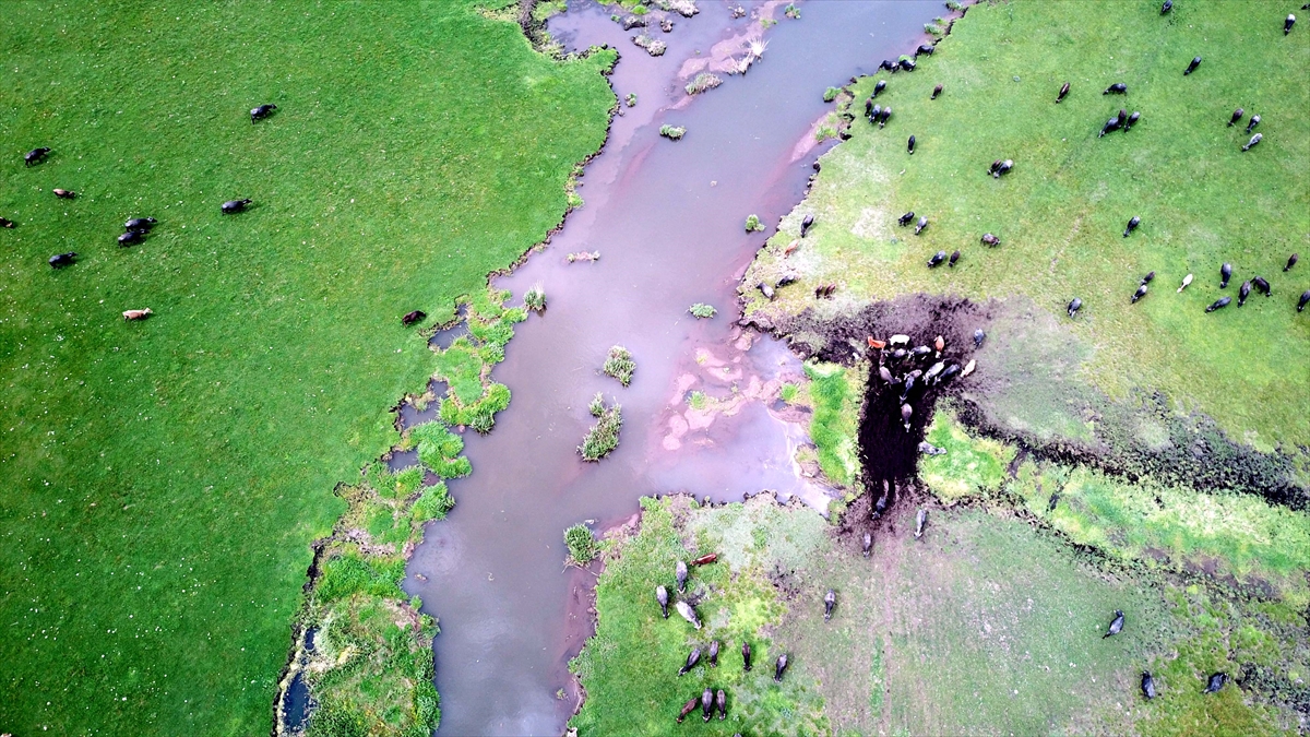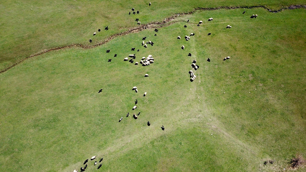 Baharla birlikte renkli görüntülerin oluştuğu meralarda hayvanların beslenmesi dronla görüntülendi.