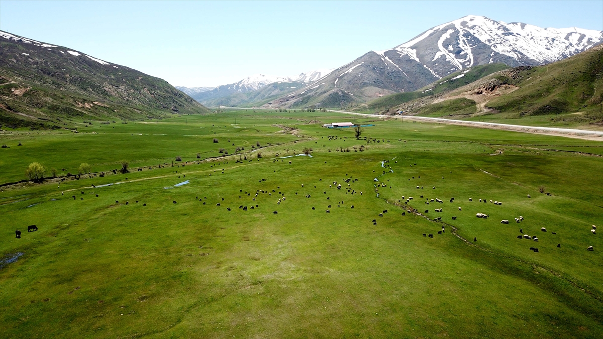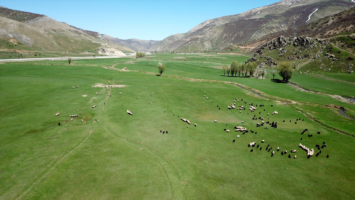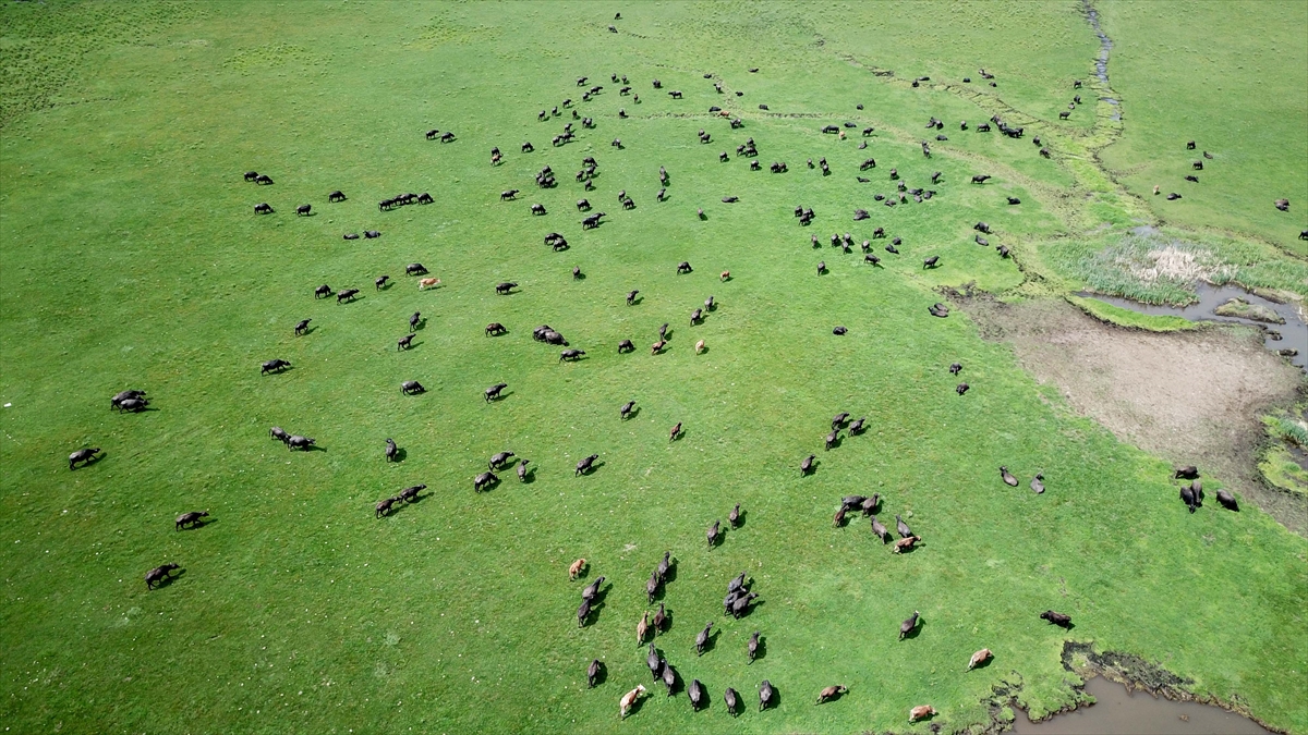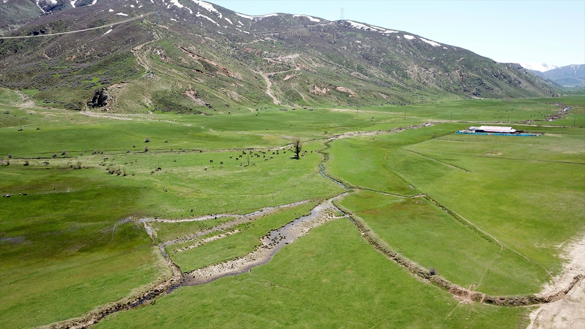 Baharla birlikte renkli görüntülerin oluştuğu meralarda hayvanların beslenmesi dronla görüntülendi.