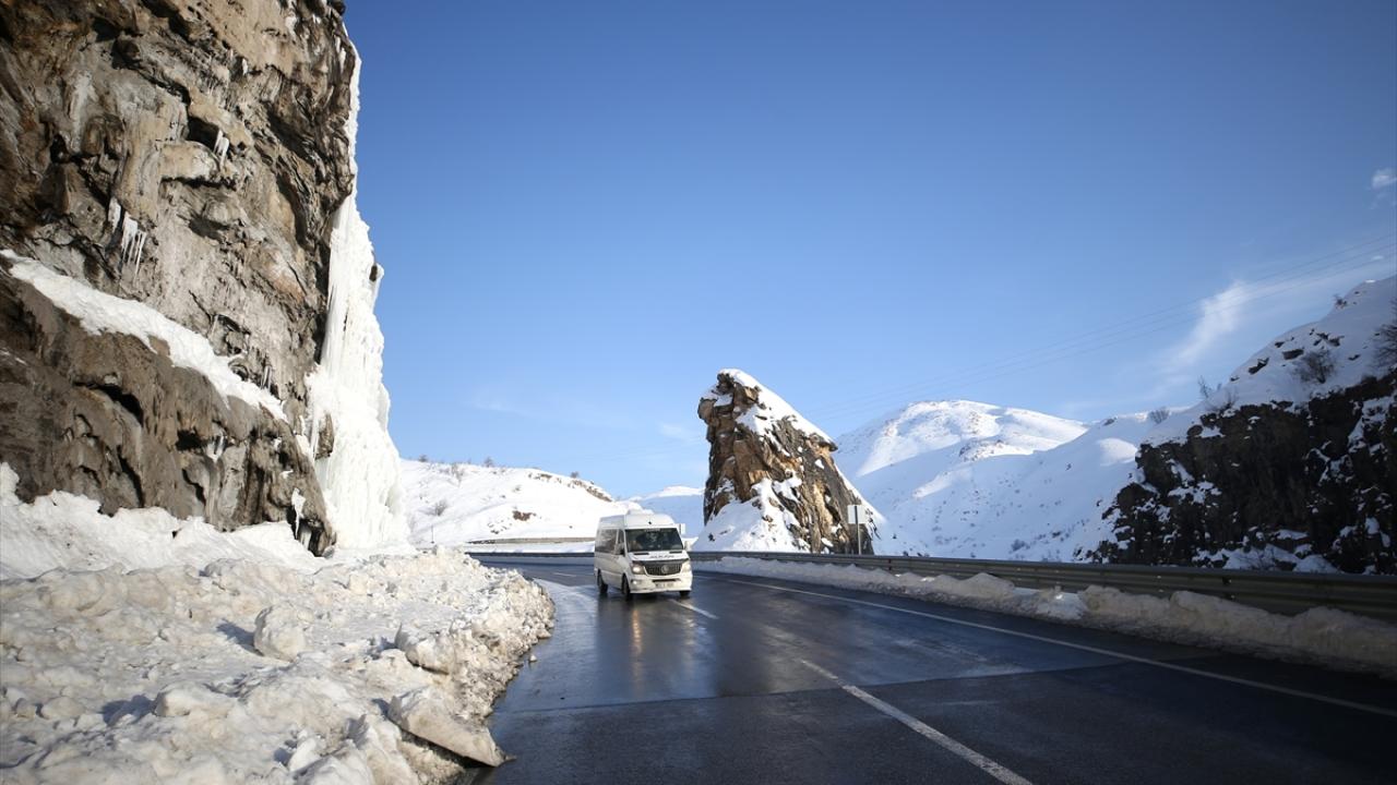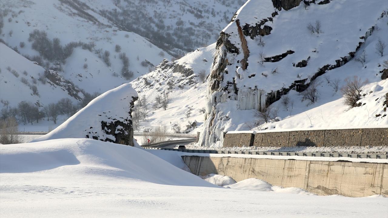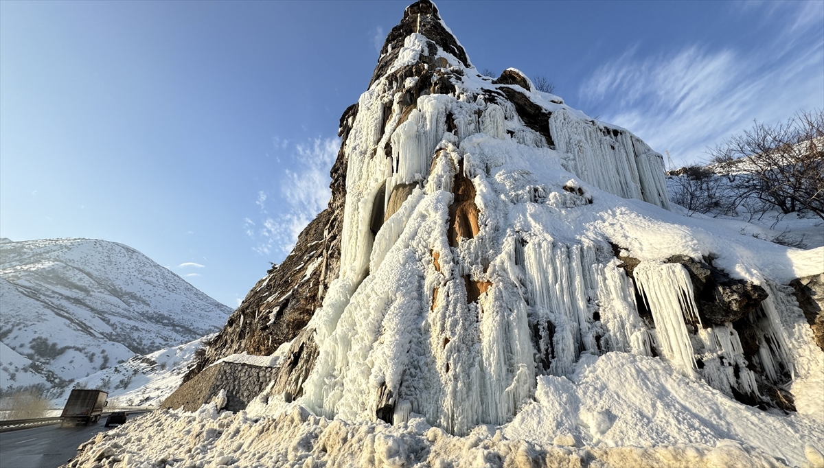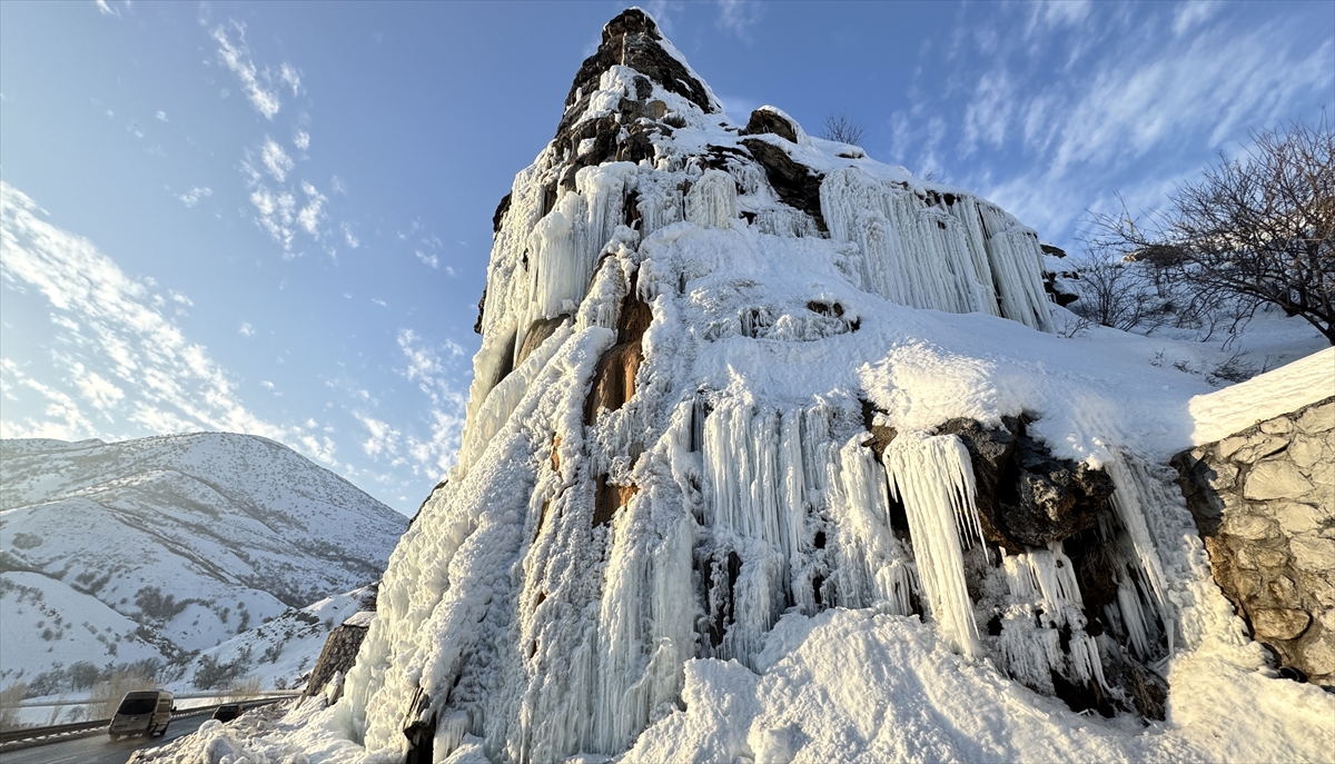 Bitlis-Diyarbakır kara yolunun 18. kilometresinde Deliklitaş olarak bilinen kayalık, soğuk hava nedeniyle buzla kaplandı.