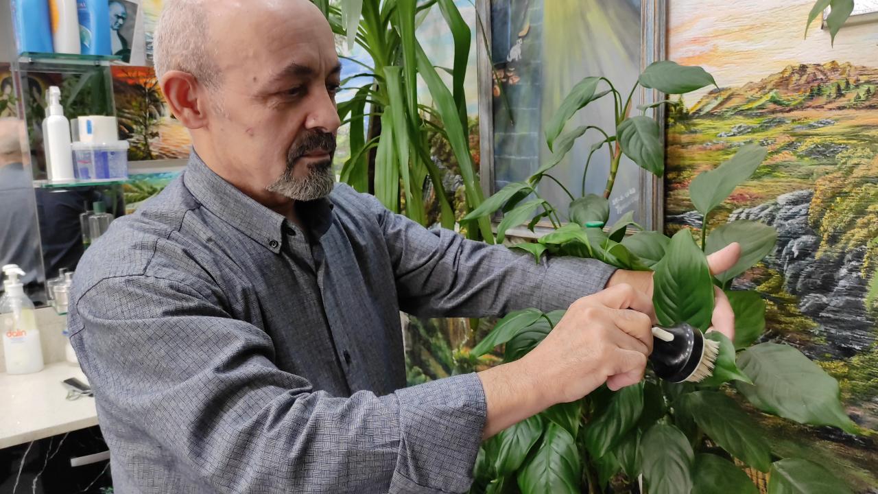 Kadıköy’de 20 metrekarelik dükkanında çeşitli bitkiler büyüten, aynı zamanda ressamlık yapan 45 yıllık berber Tanrıverdi Taşdemir, misafirlerine temiz bir nefes aldırıyor.