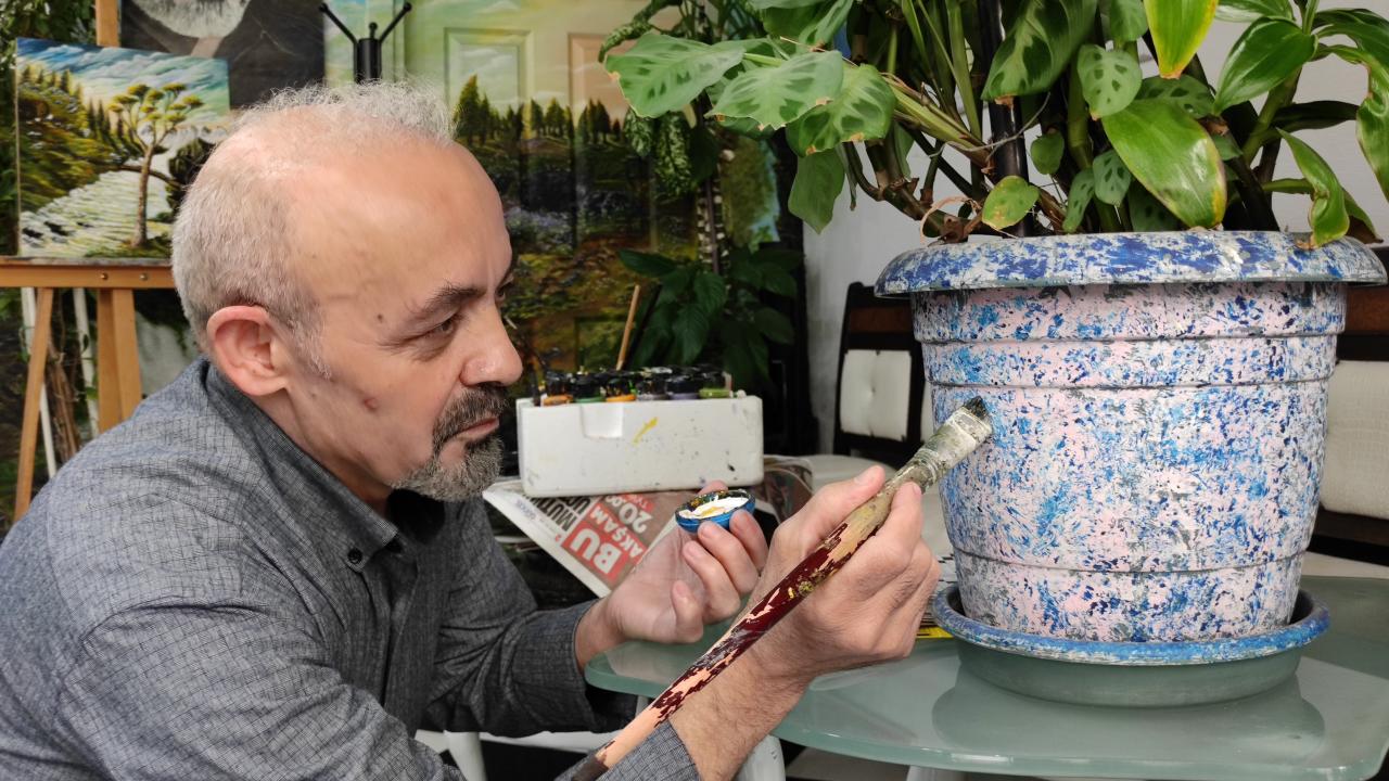 Her yanı çiçeklerle dolu berber dükkanındaki çiçek kokusu, Taşdemir’in tuvale çizdiği resimlerle birleşiyor.