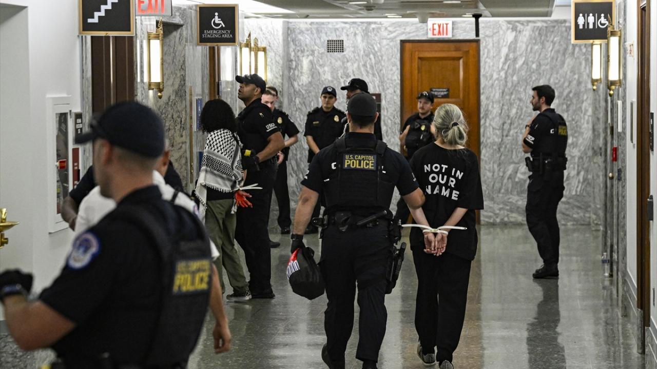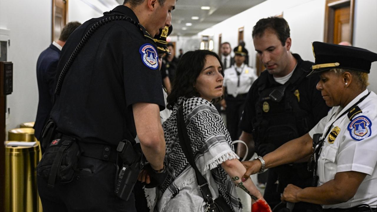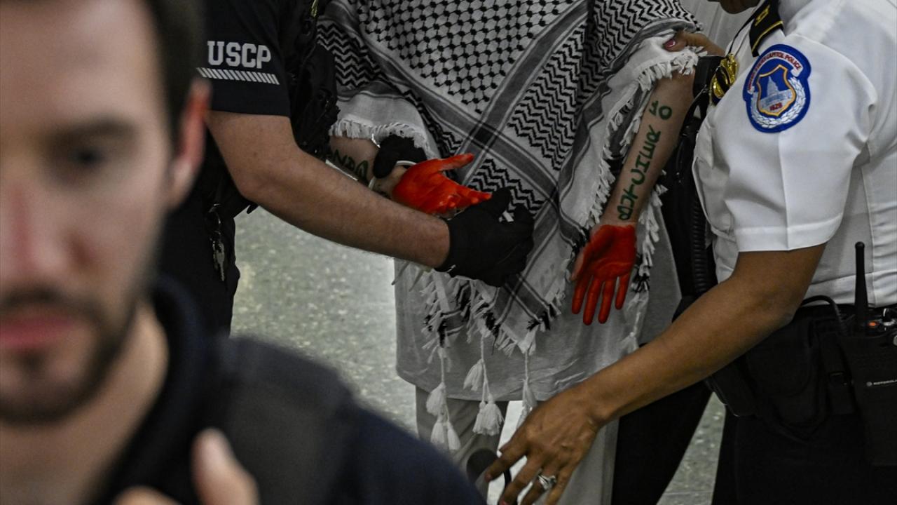 Filistin destekçisi, polis tarafından zorla dışarı çıkarılırken diğer bir eylemci de elinde "Savaş suçlusu" pankartı ile “Blinken bir savaş suçlusudur.” diye slogan attı.