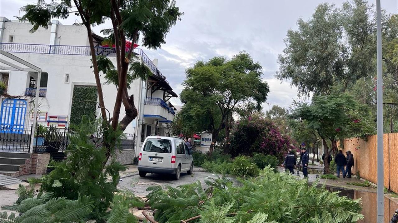 Gümbet Mahallesi`nde de bir ağaç ve aydınlatma direği devrildi. Trafiğe kapanan yolun açılması için çalışma başlatıldı.