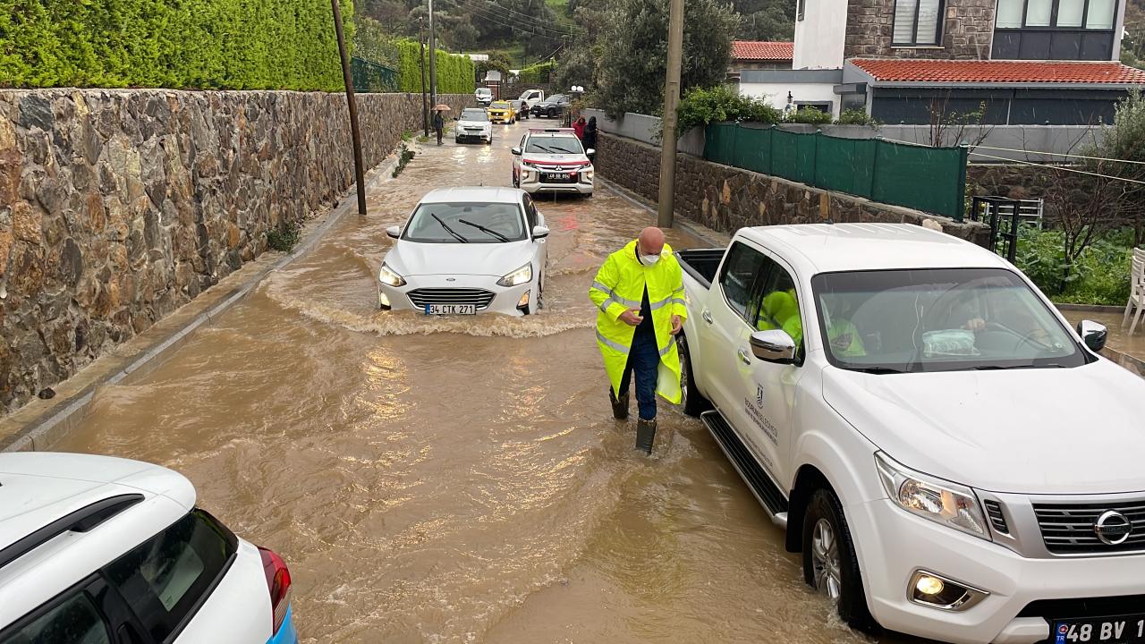 İtfaiye, belediye ekipleri, su tahliye çalışmalarını sürdürürken, Bodrum Belediye Başkanı Ahmet Aras ve beraberindeki heyet, Geriş ve Yalıkavak Mahallesi`nde incelemelerde bulundu.
