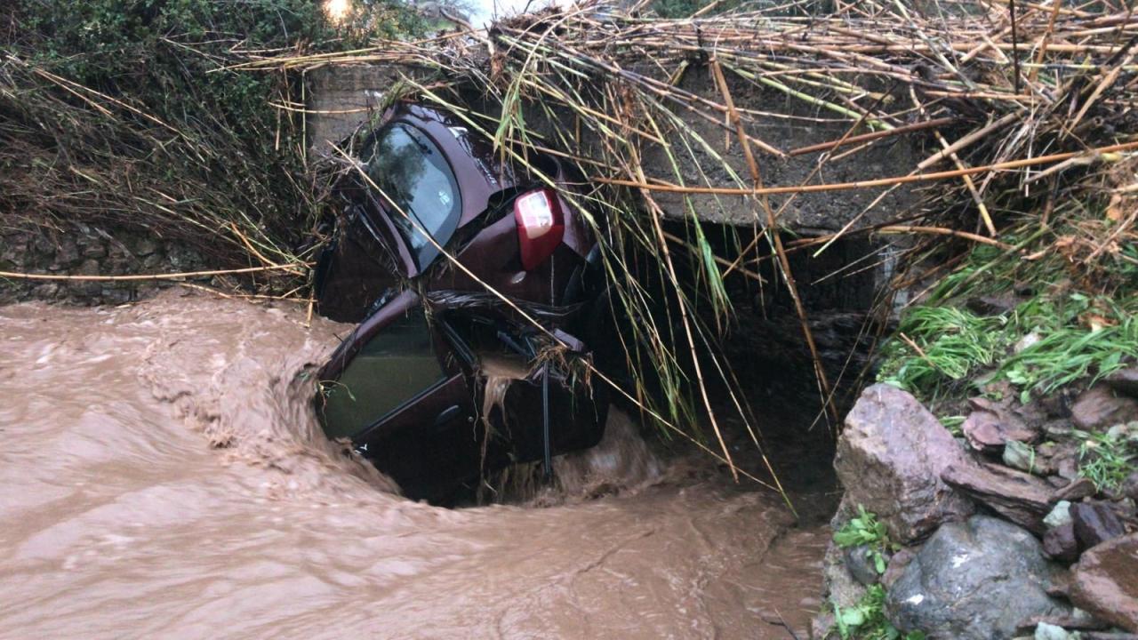 Mumcular Mahallesi`nde park halindeki otomobil, sel sularıyla dere yatağına sürüklendi. Otomobil, kepçeyle çıkarıldı.