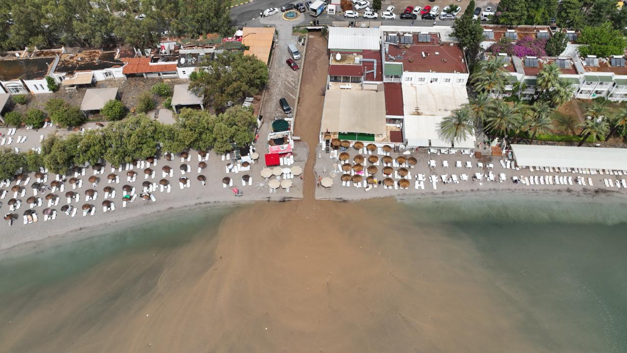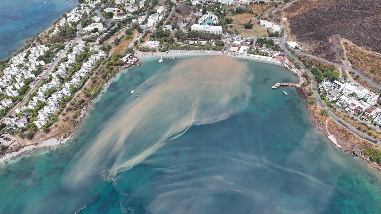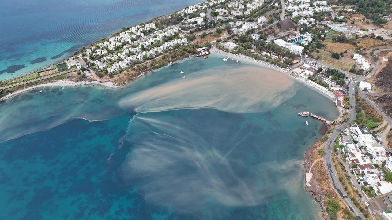 Bodrum'da sabah aniden bastıran sağanak yağış tatilcileri şok etti. Şiddetli yağmur sebebiyle çamur akan derelerin döküldüğü zümrüt yeşili cennet koylar çamur deryasına dönerken, o anlar havadan dronla görüntülendi.