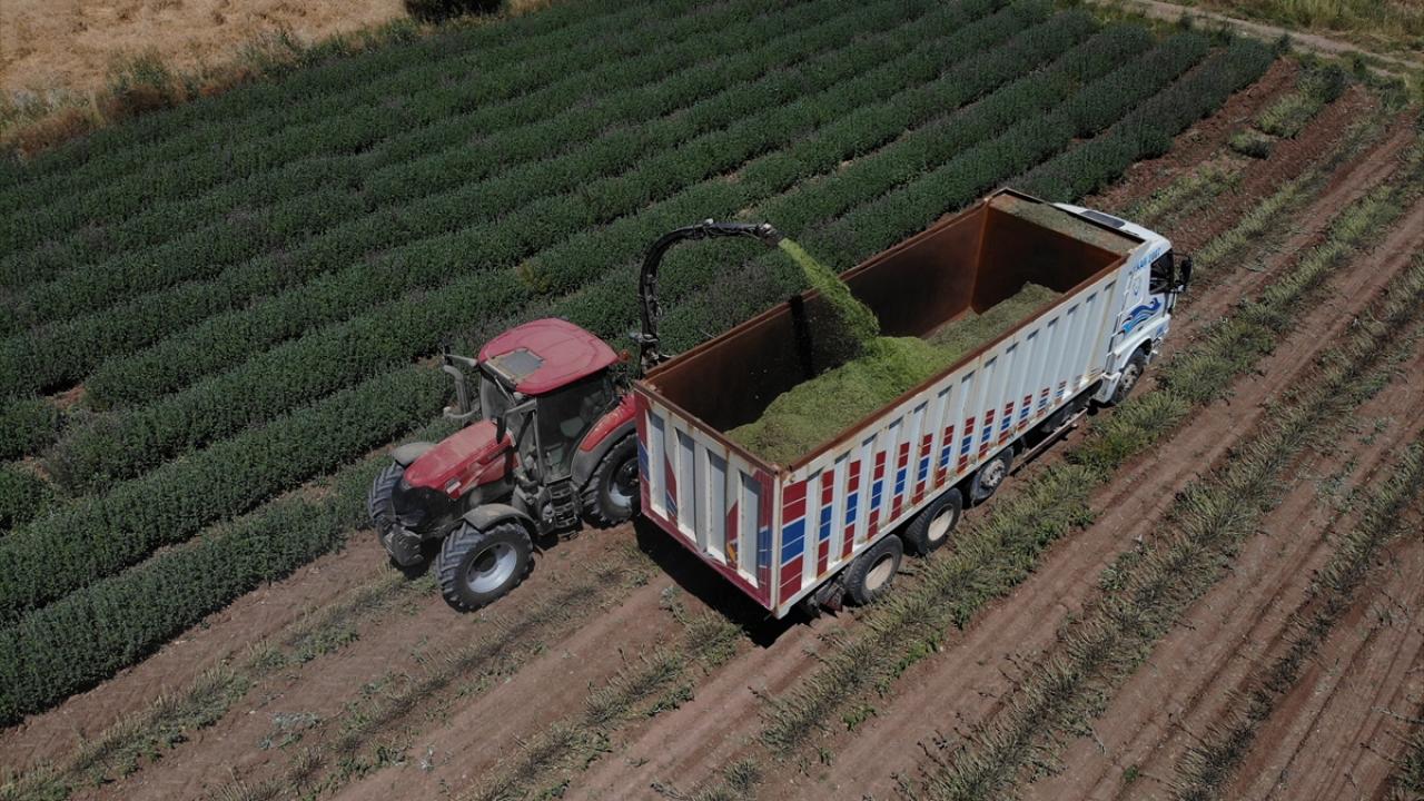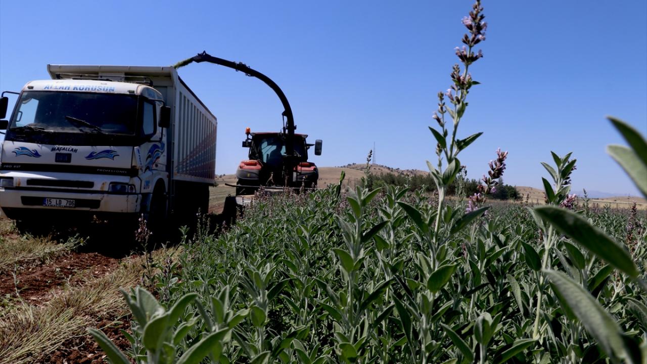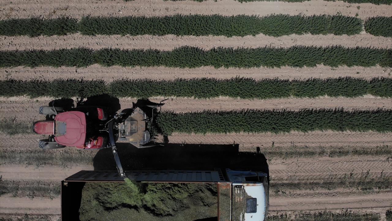 Burdur'da ilkbahar ve haziran yağışlarının ardından boyları normalin 4 katına kadar yaklaşarak 1 metreyi aşan Anadolu adaçayının hasadı silaj makineleriyle yapılıyor.
