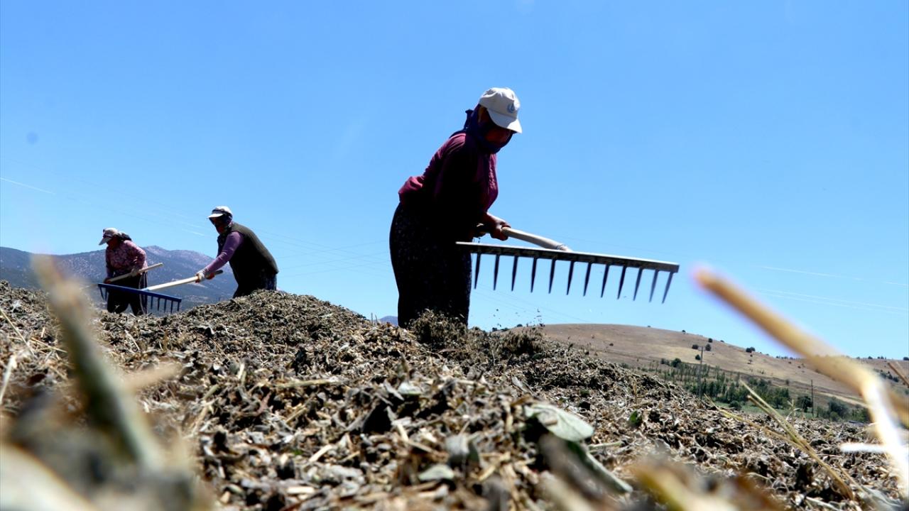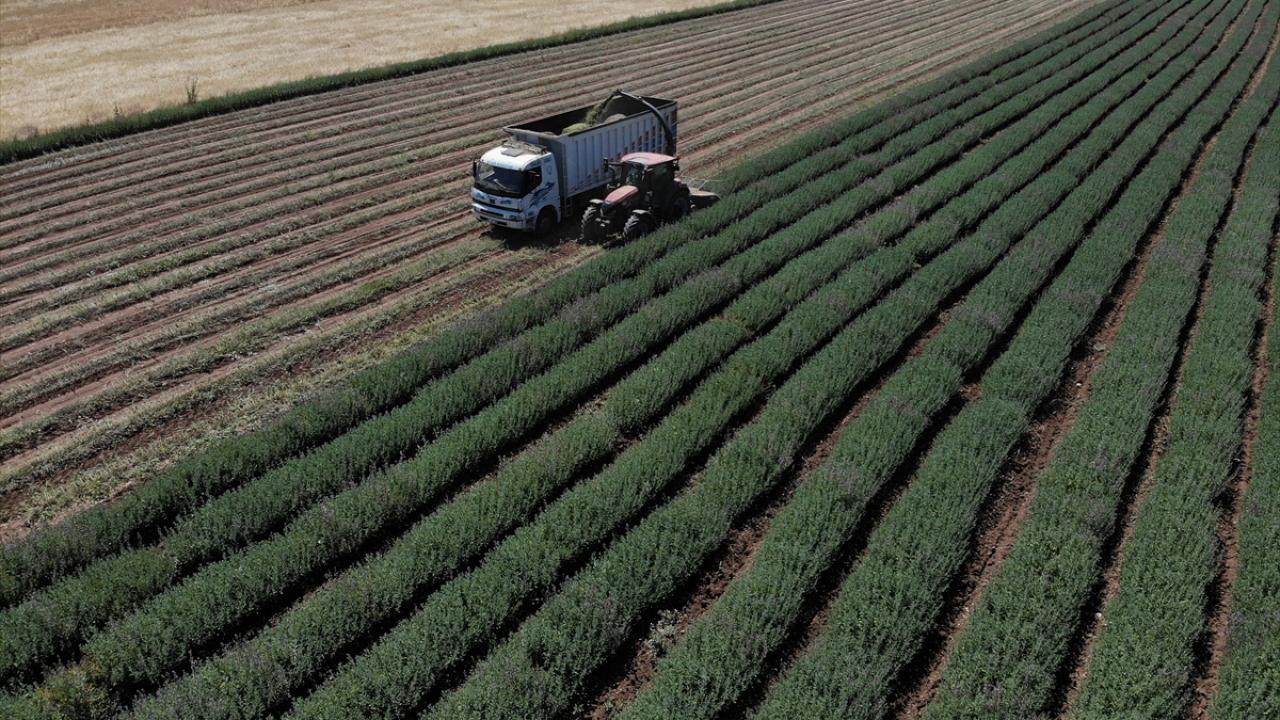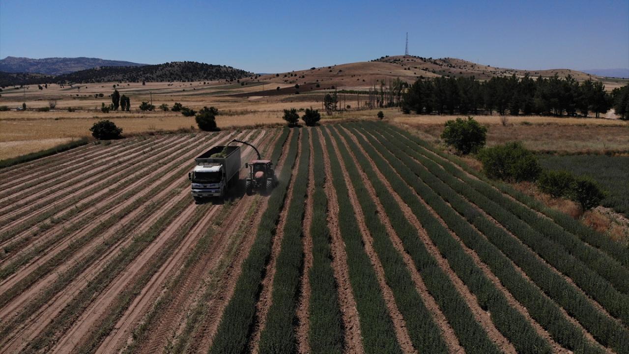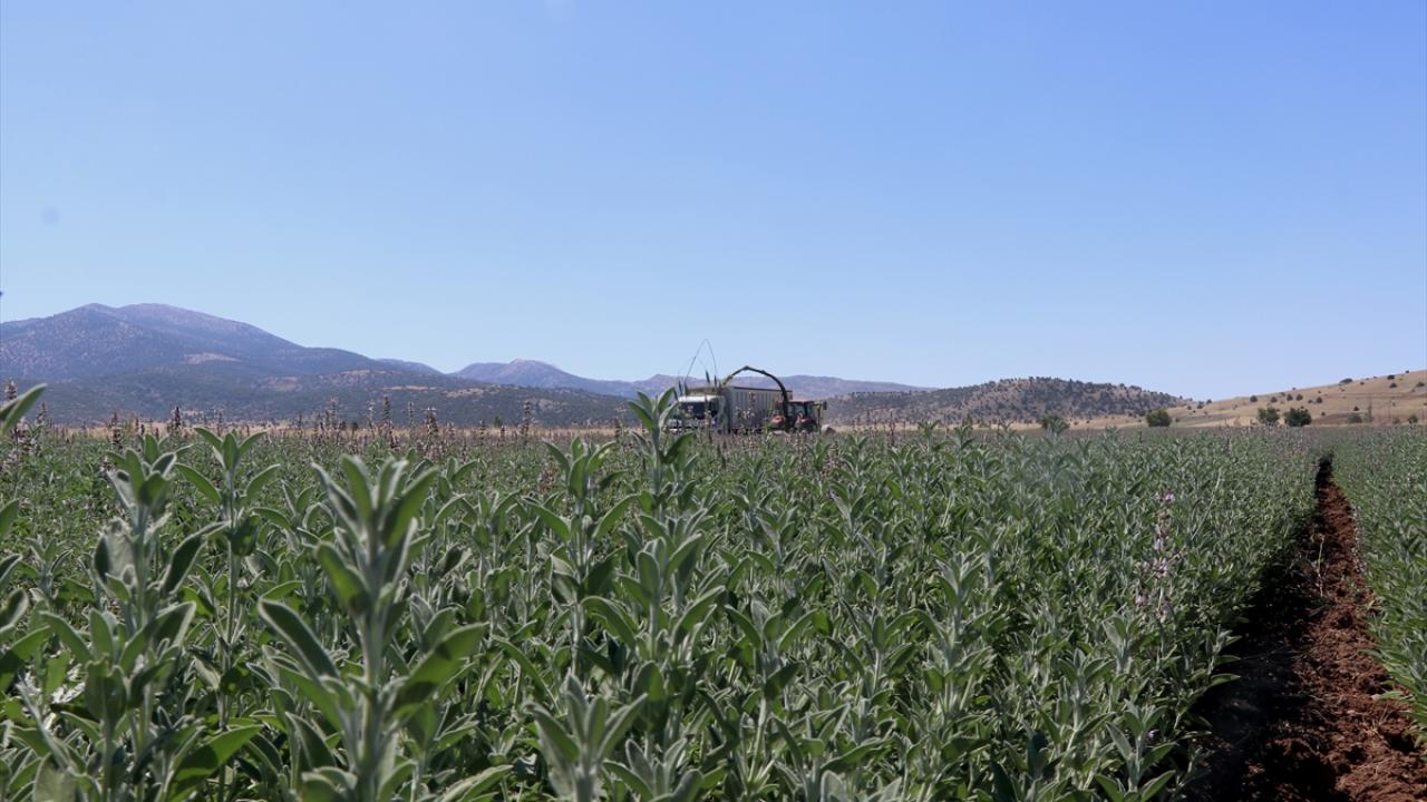 Burdur'da ilkbahar ve haziran yağışlarının ardından boyları normalin 4 katına kadar yaklaşarak 1 metreyi aşan Anadolu adaçayının hasadı silaj makineleriyle yapılıyor.