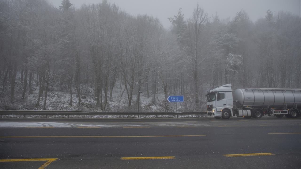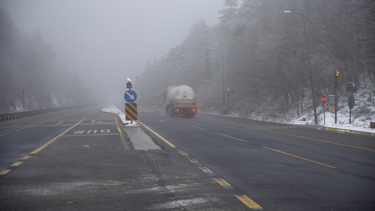 Hafif şekilde yağan kar yağışı ve yer yer etkili olan sis nedeniyle D-100 kara yolunun Bolu Dağı kesiminde görüş mesafesi düştü.