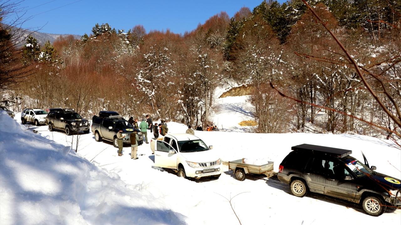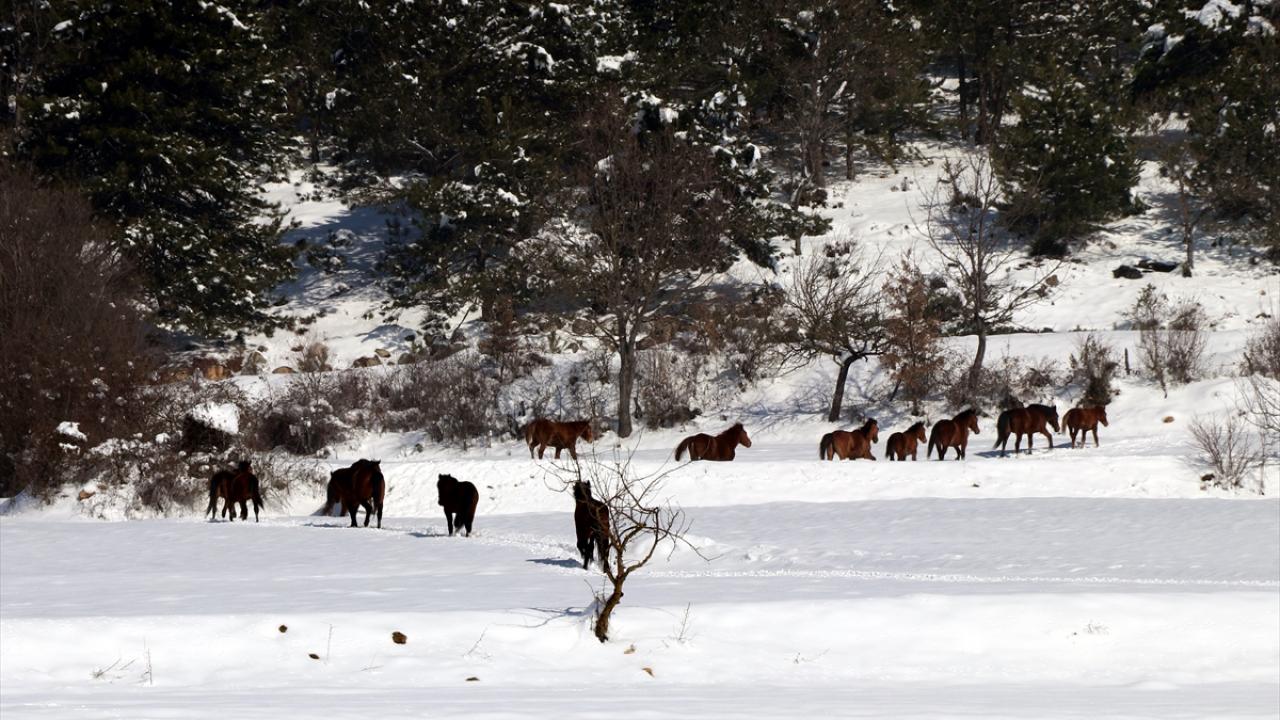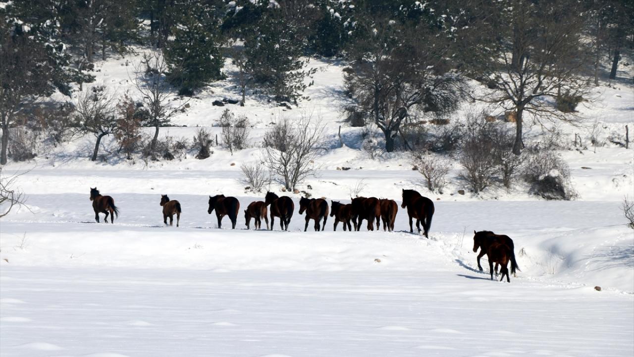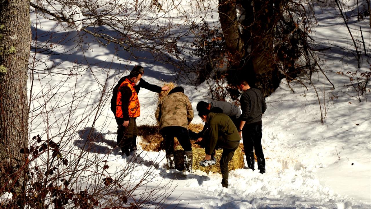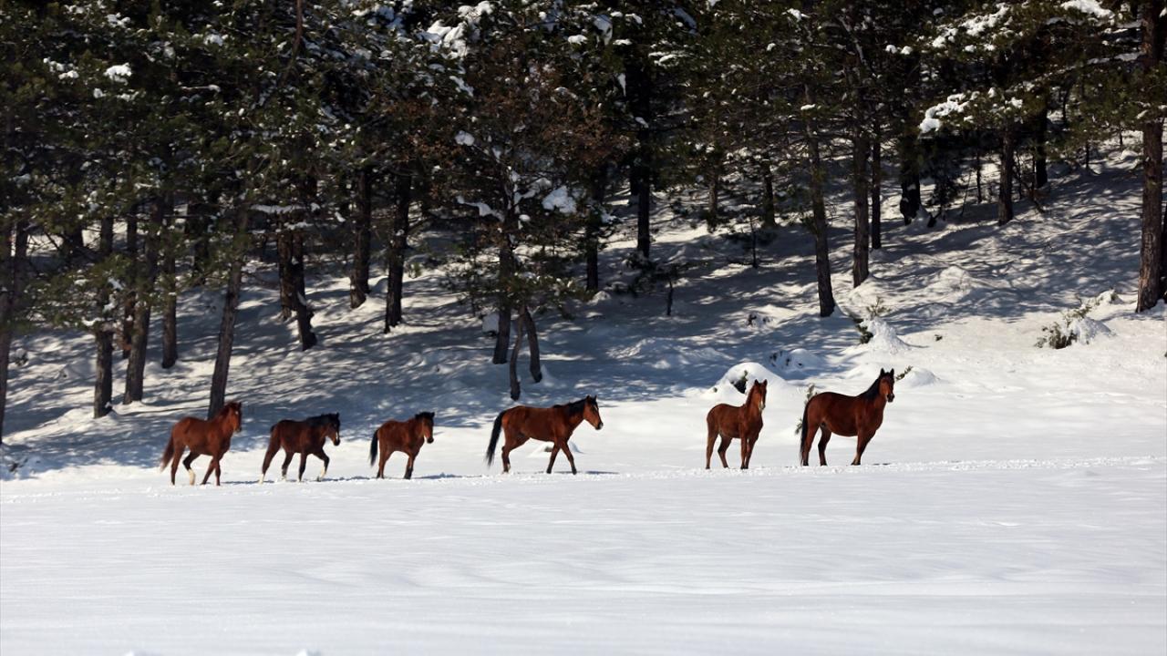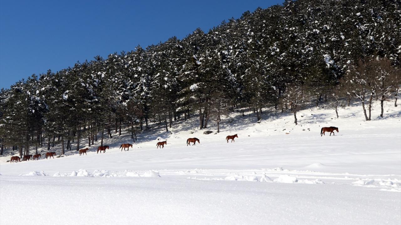 Kar kalınlığının 50 santimetre olduğu Bolu Dağı'nda bulunan yılkı atlarına, Doğa Koruma ve Milli Parklar ekipleri ile Köroğlu Avcılar Derneği üyelerince yemleme çalışması yapıldı.