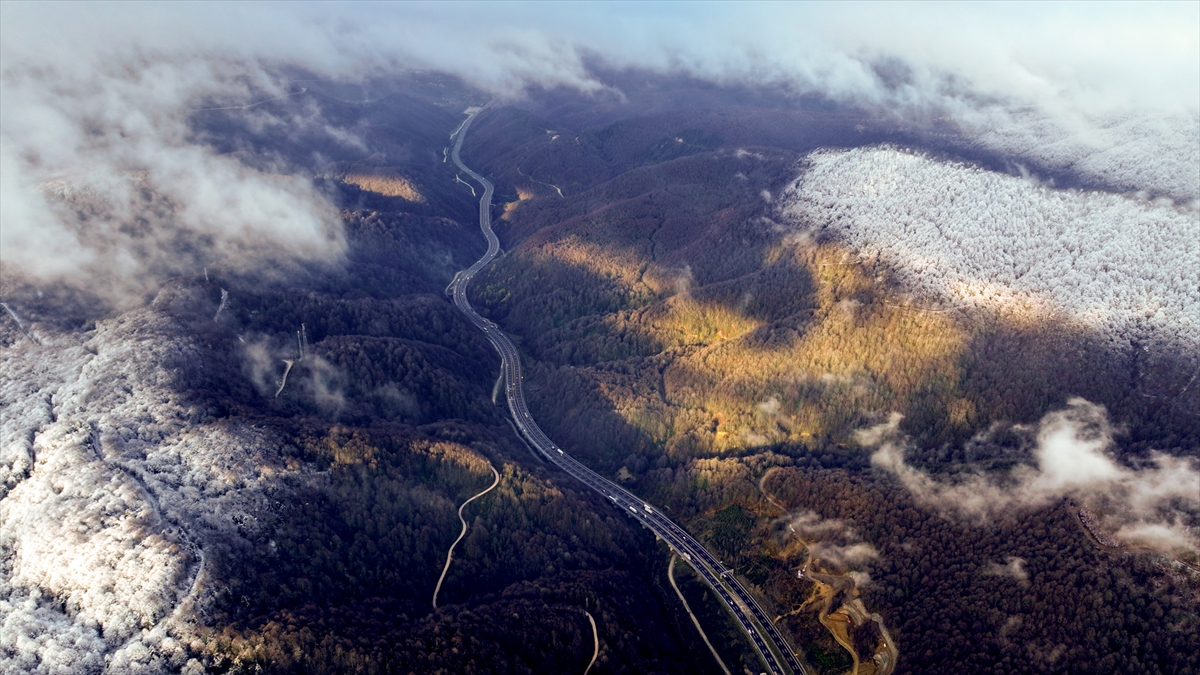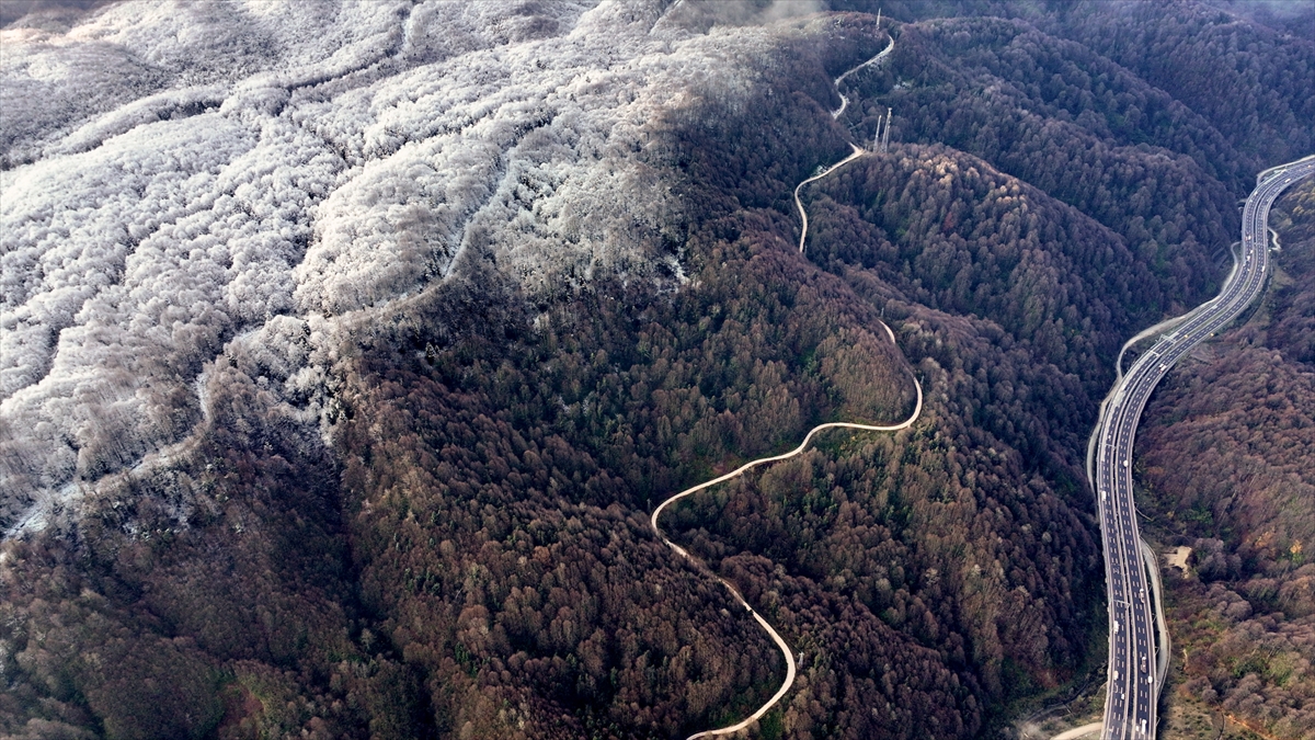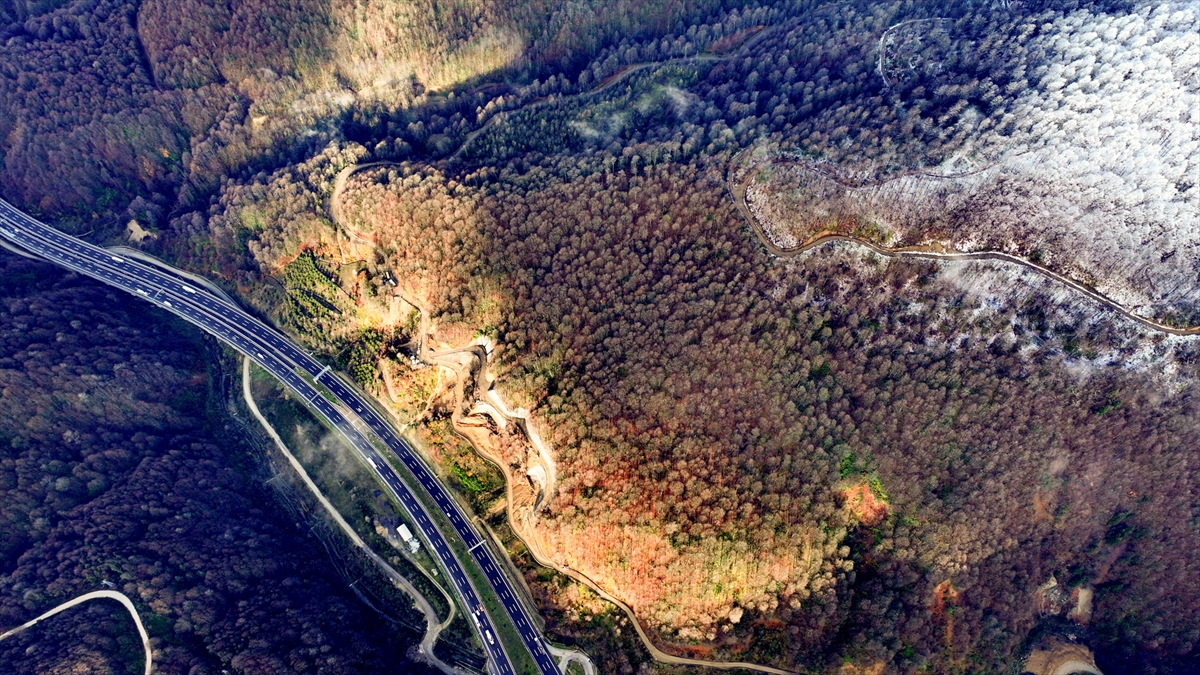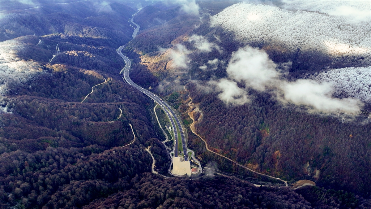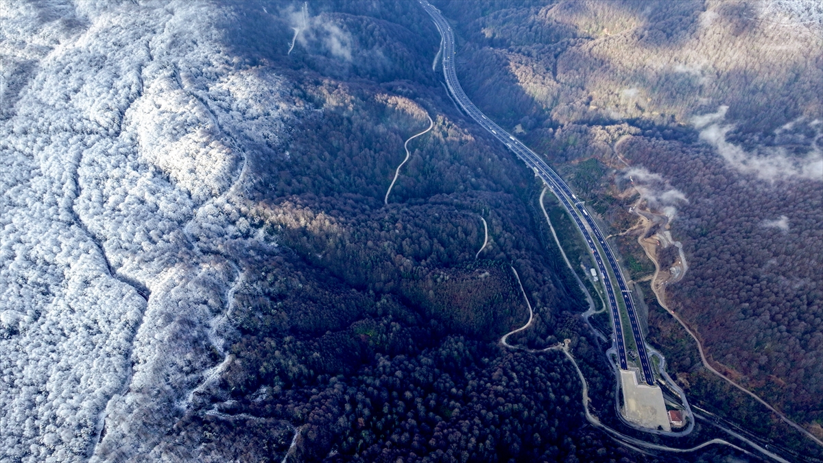 Bolu Dağı'nın Anadolu Otoyolu Tünel geçişinin yüksek kesimlerinde etkili olan kar yağışı, drone ile görüntülendi.
