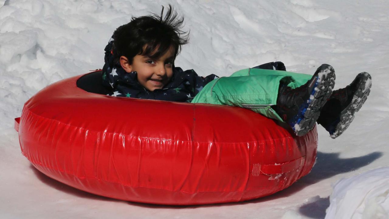 Bazı tatilciler ise otellerin yakınlarında oluşturulan kayak alanlarında şambrelle kaydı.