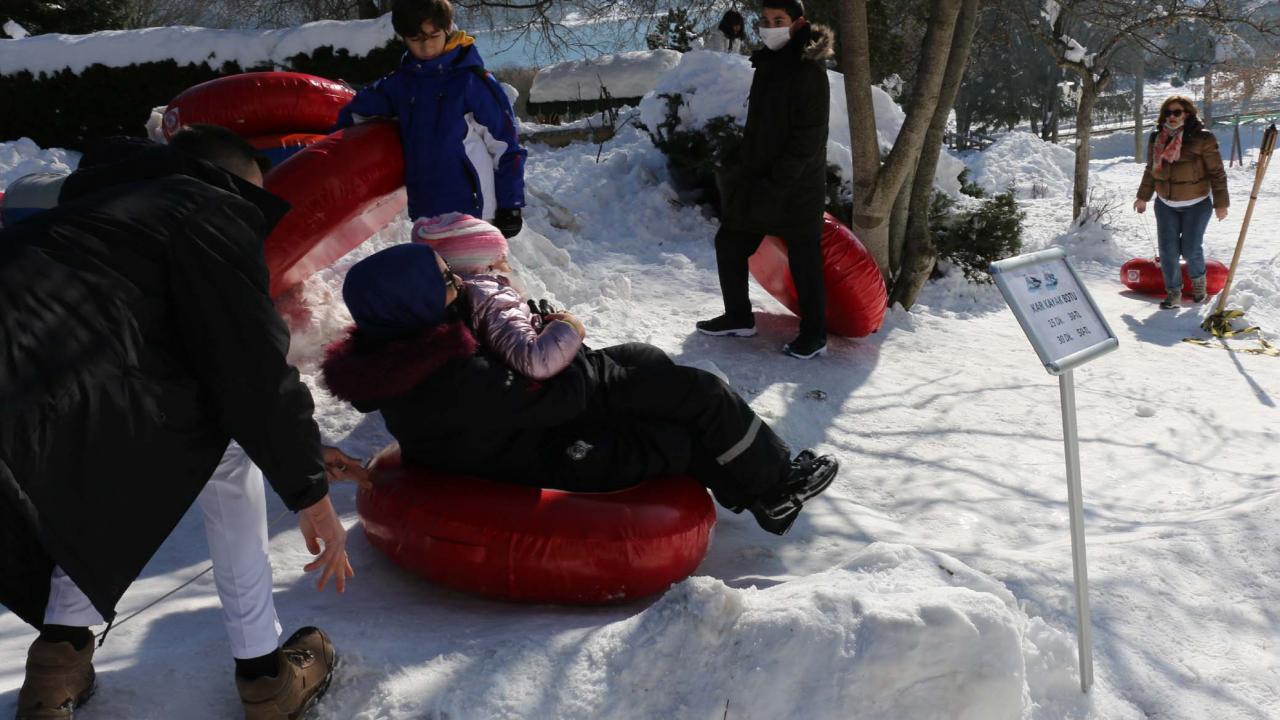 Abant Tabiat Parkı`nı tercih edenler kar topu oynadı, şambrelle kaydı