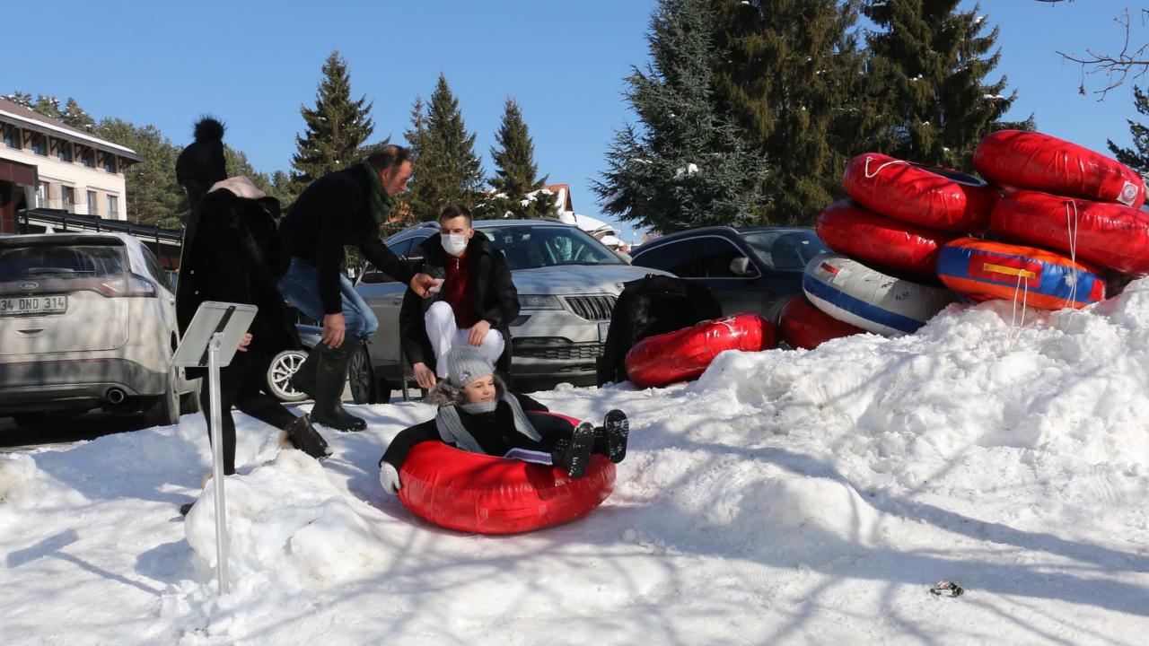 Yarıyıl tatili için Abant Tabiat Parkı`nı tercih edenler tatilin ilk gününü kar topu oynayıp şambrelle kayarak geçirdi.