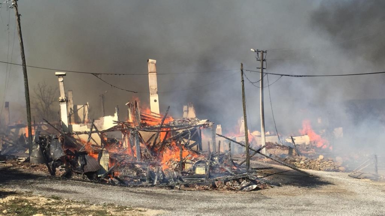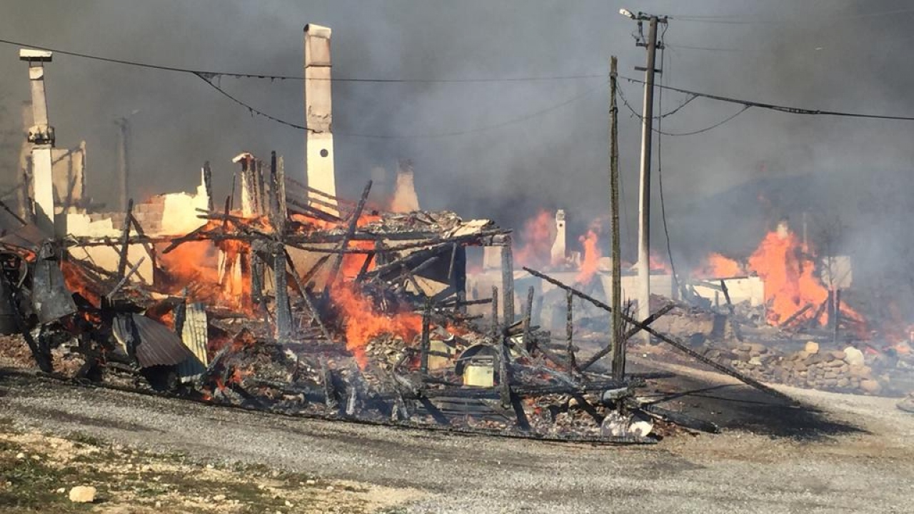 Yangının diğer evlere sıçramaması için önlem alan ekiplerin söndürme çalışması sürüyor. Çalışmalara köylüler de kendi imkanlarıyla destek veriyor.