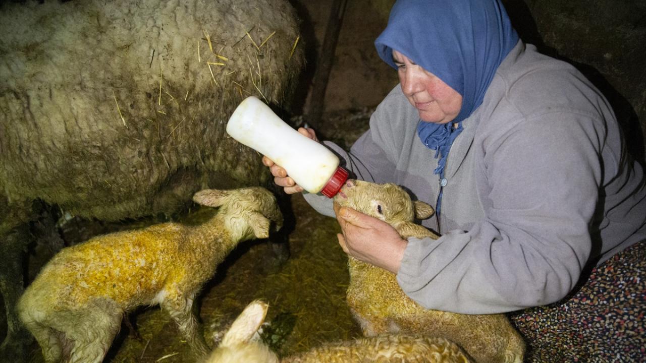 Kuzulara ilk sütü, Ahmet Demir`in eşi Necmiye Demir biberonla verdi.