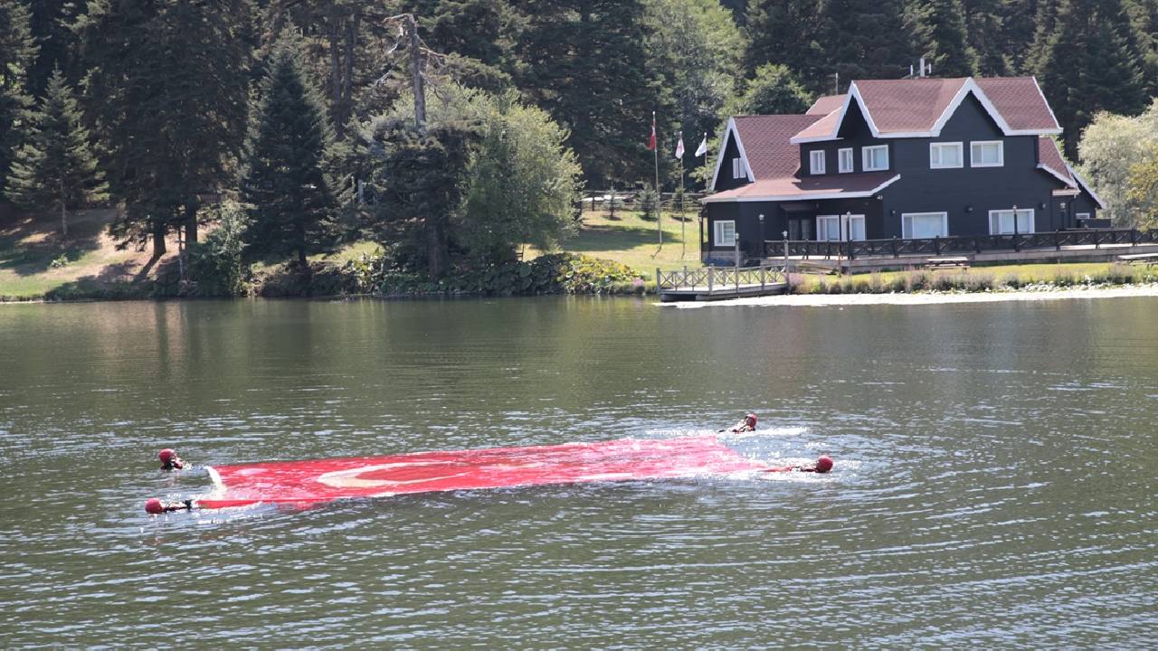 Gölün yüzeyinde Türk bayrağı açılması dronla da görüntülendi.