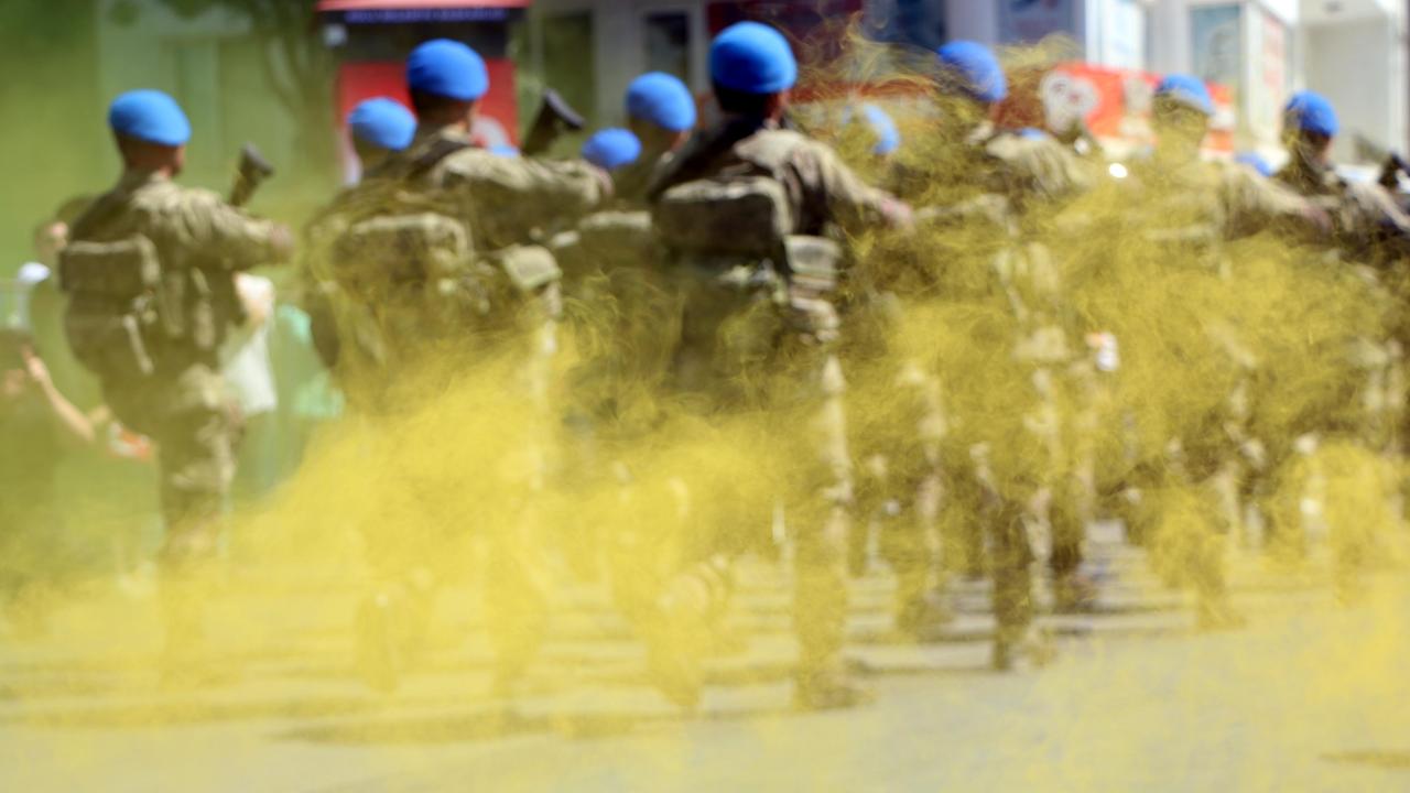 İzzet Baysal Caddesi`nde sis bombaları arasında yürüyen komandolar, törene katılanlar tarafından dakikalarca alkışlandı.