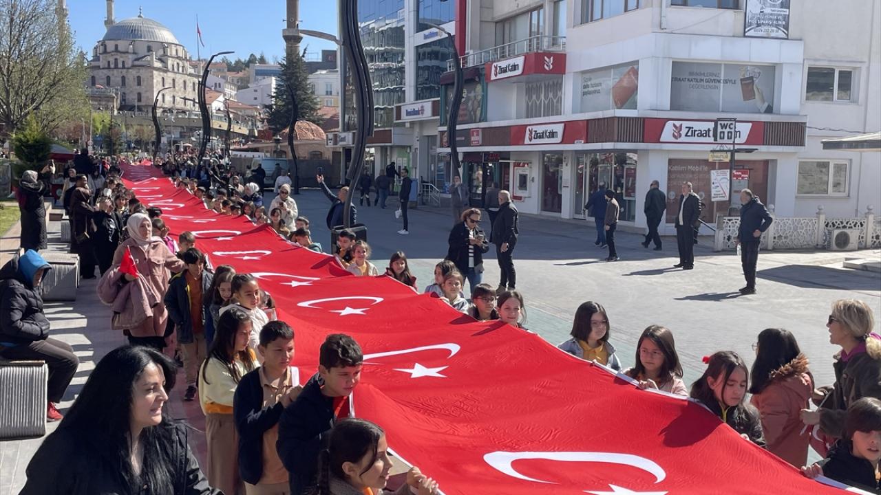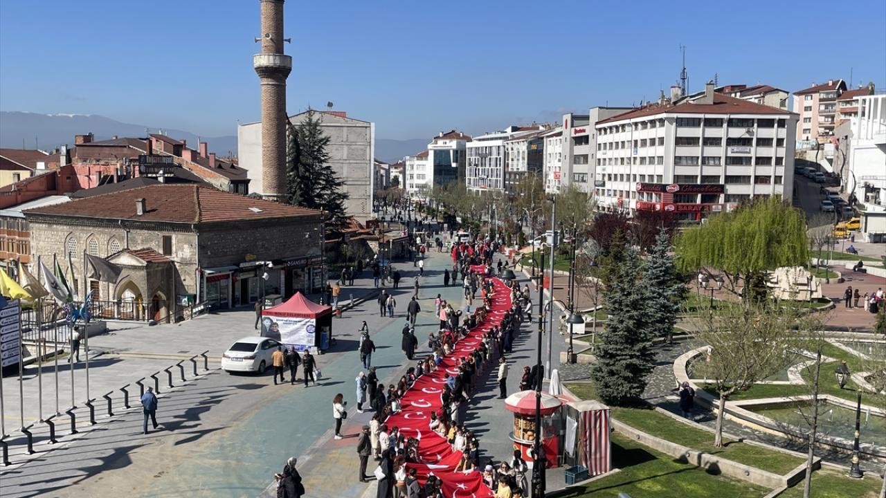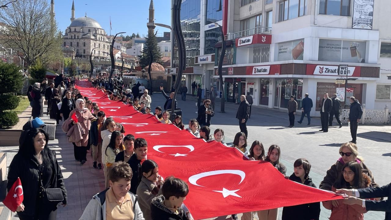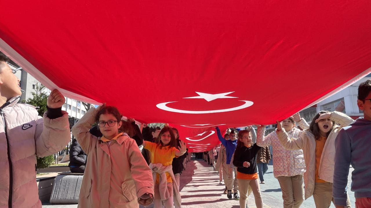 Yürüyüşe katılan 480 öğrenci ile veliler, öğretmenler ve okul idarecileri, mehter takımının çaldığı marşlar eşliğinde 200 metre uzunluğunda Türk bayrağı açtı.