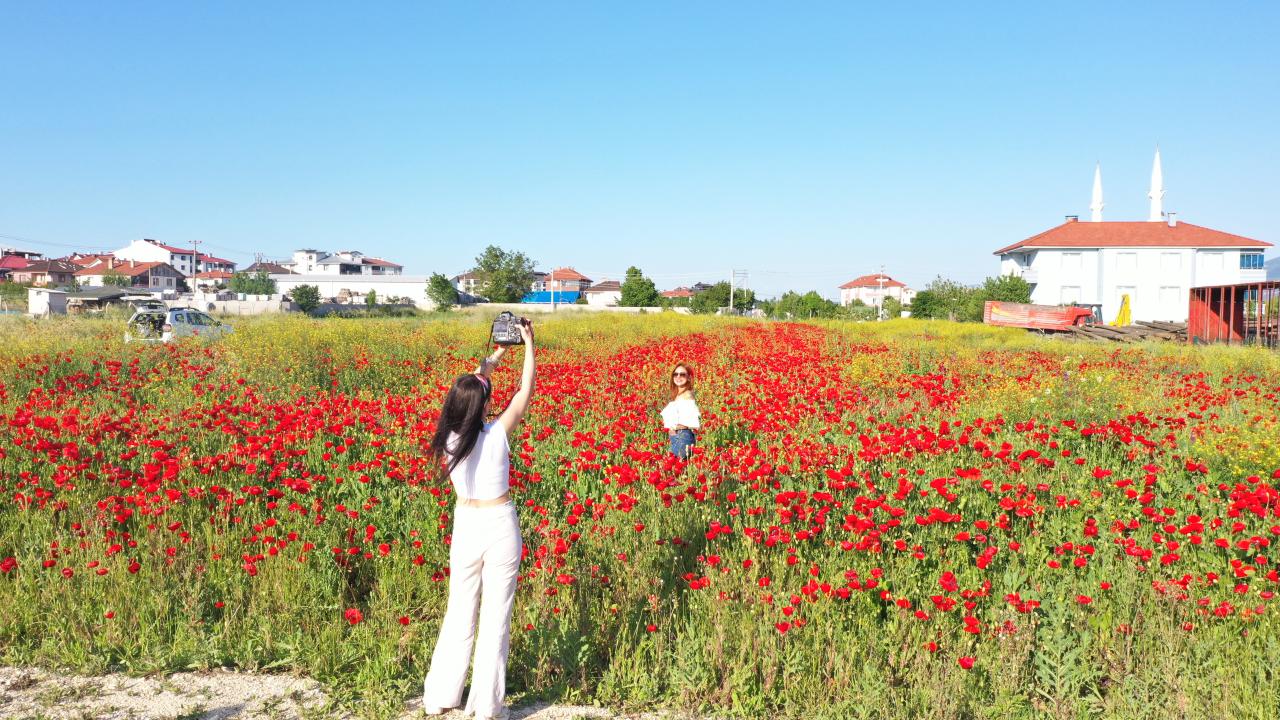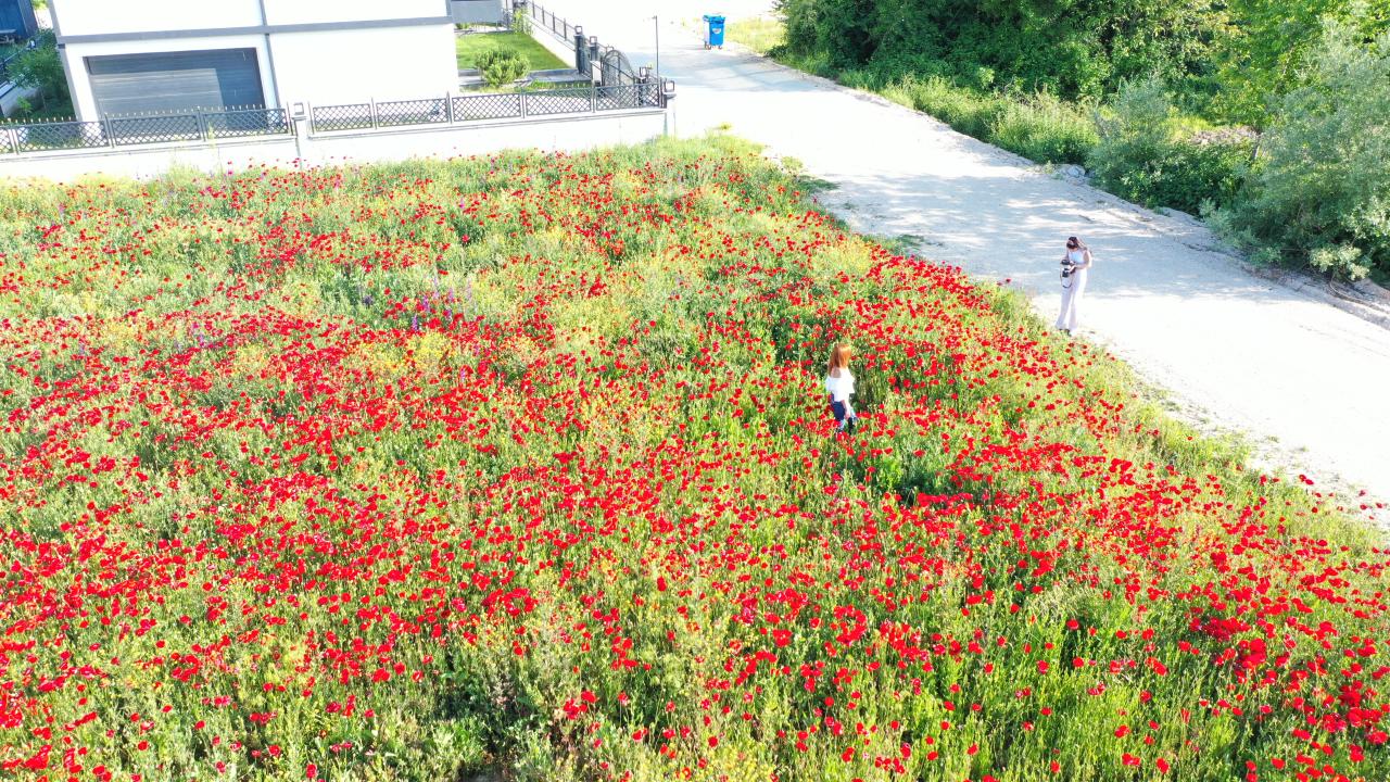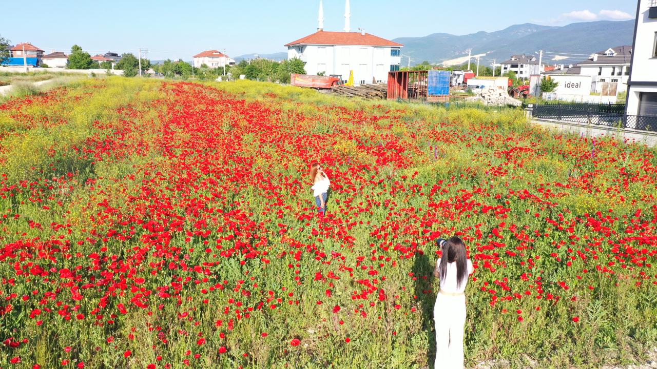 Tepecik Mahallesi`ndeki arsada boy veren gelincikleri görenler, çiçeklerin arasında dolaşıp kırmızının tonları eşliğinde fotoğraf çektirdi.