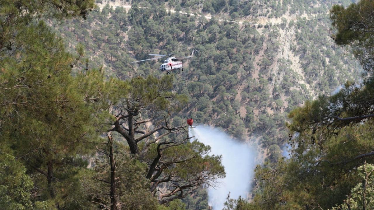 Arazinin eğimli olması nedeniyle yangına karadan müdahalenin zor olduğu bölgede çalışmalara helikopterle de destek veriliyor.