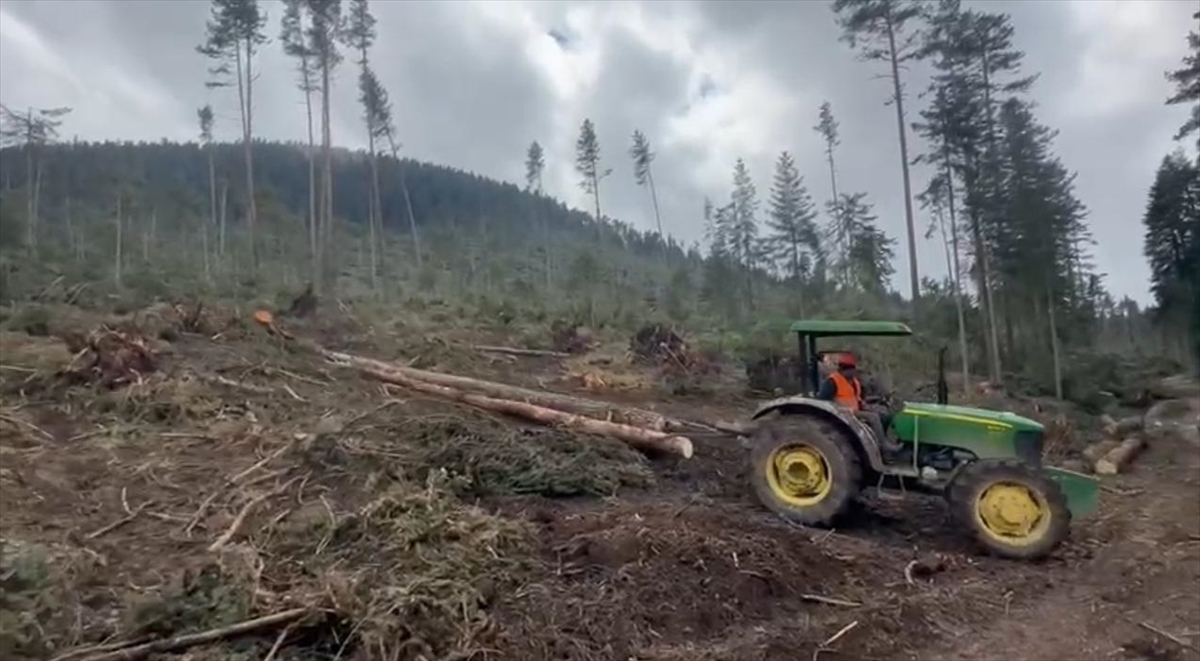 Bolu'da kış aylarında fırtınada devrilen çam ağaçlarının kaldırılması için çalışma başlatıldı.