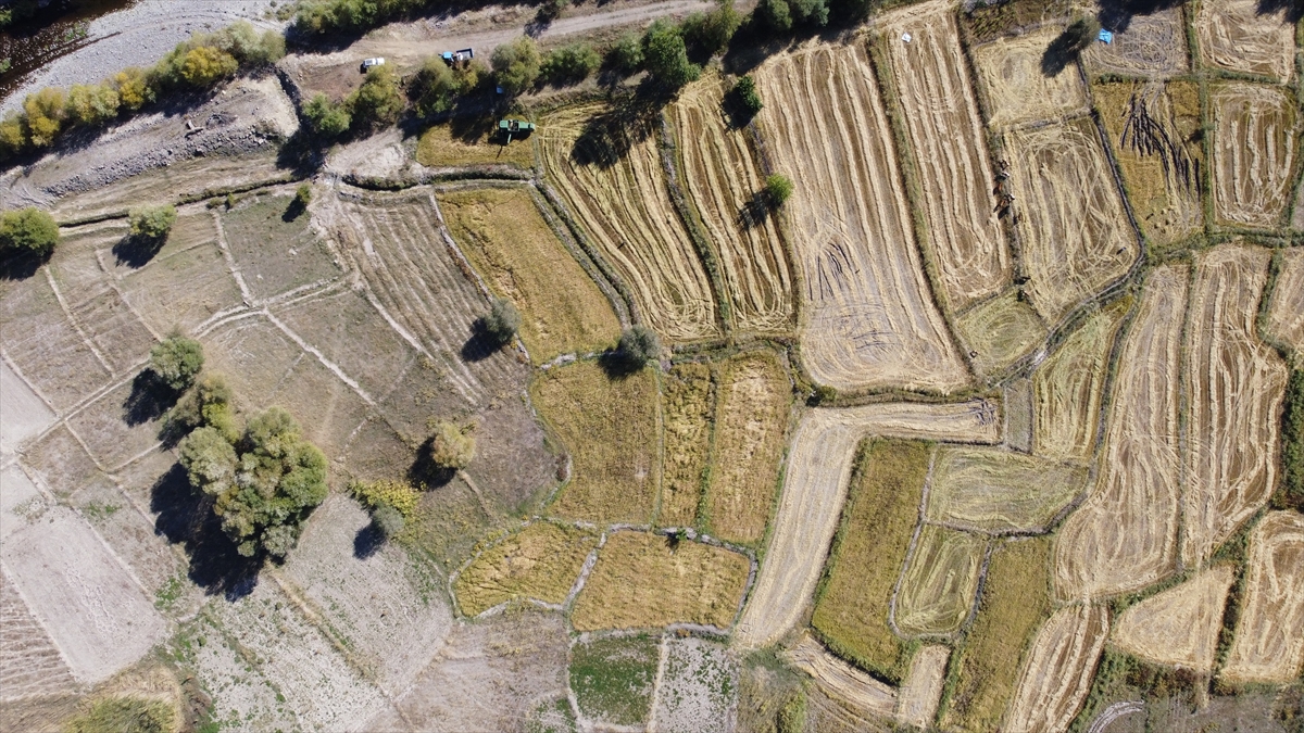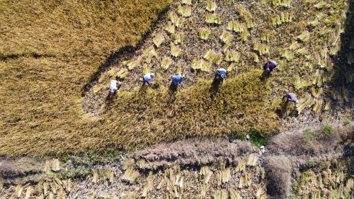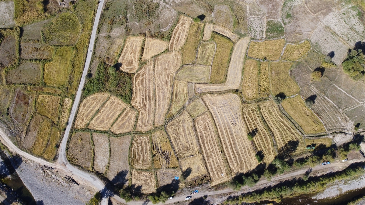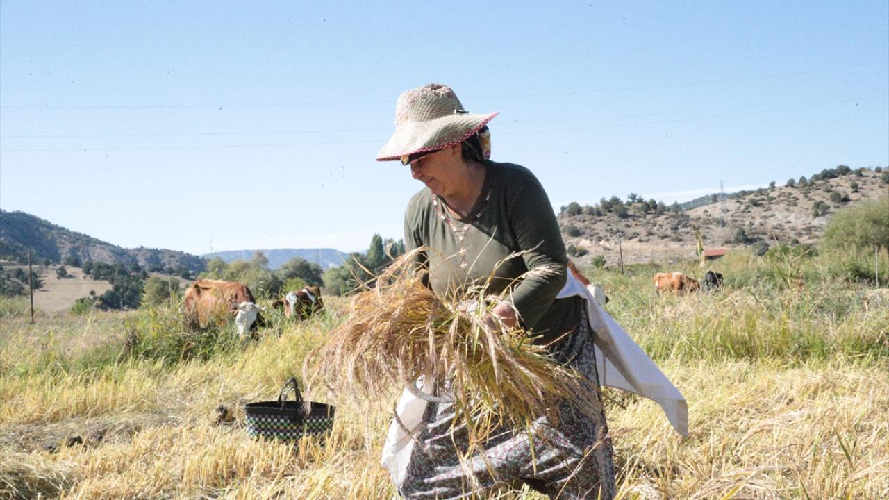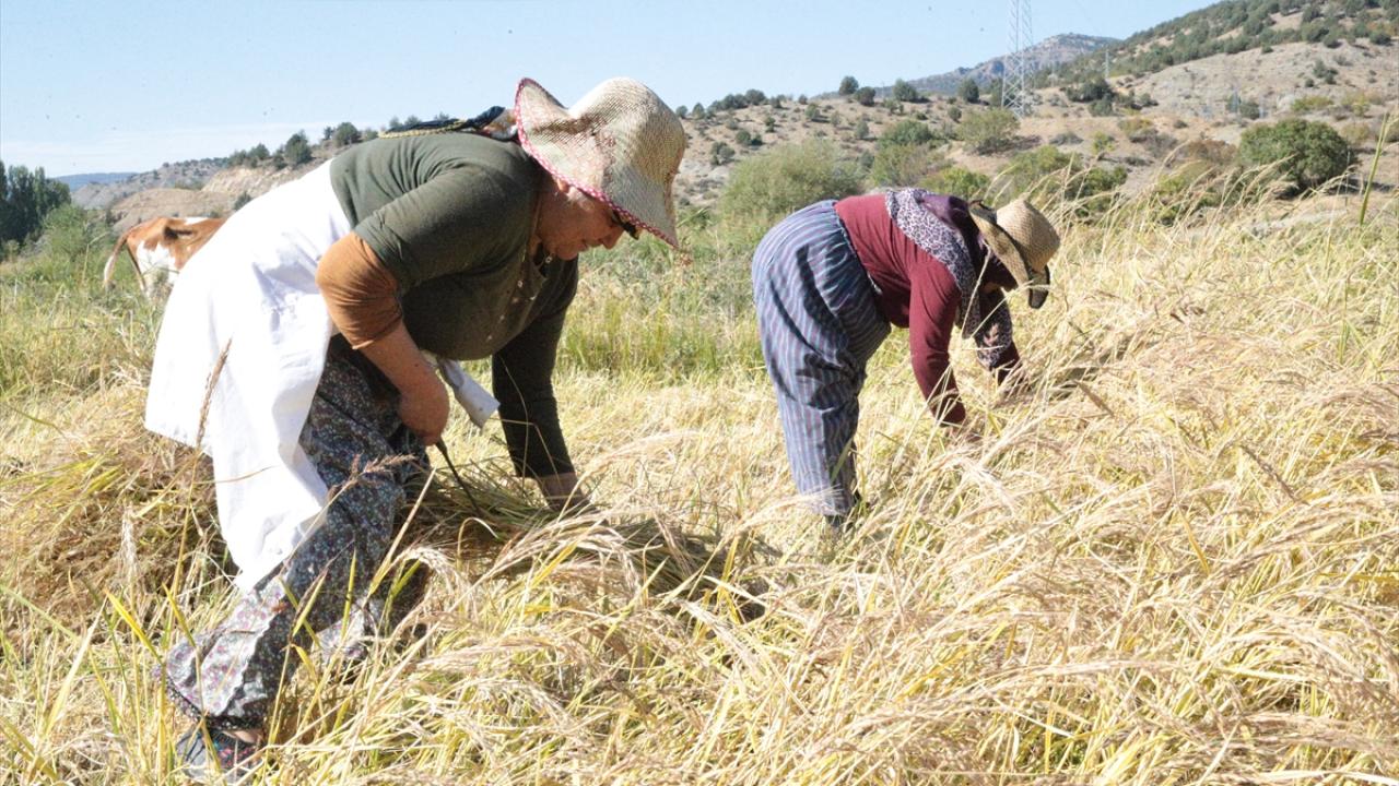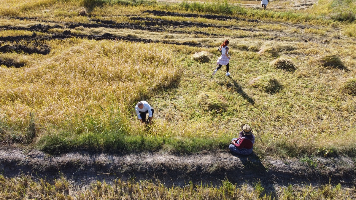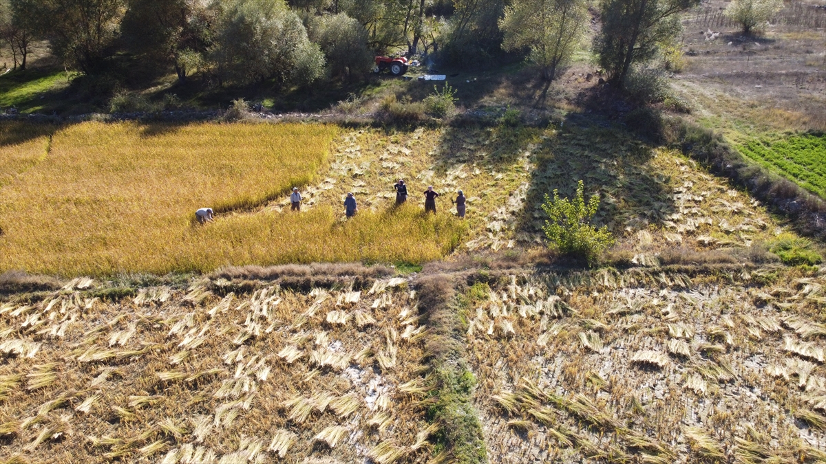 Köyde 42 çiftçi tarafından 325 dekar alanda yetiştirilen pirincin hasadı geleneksel yöntemle gerçekleştiriliyor.