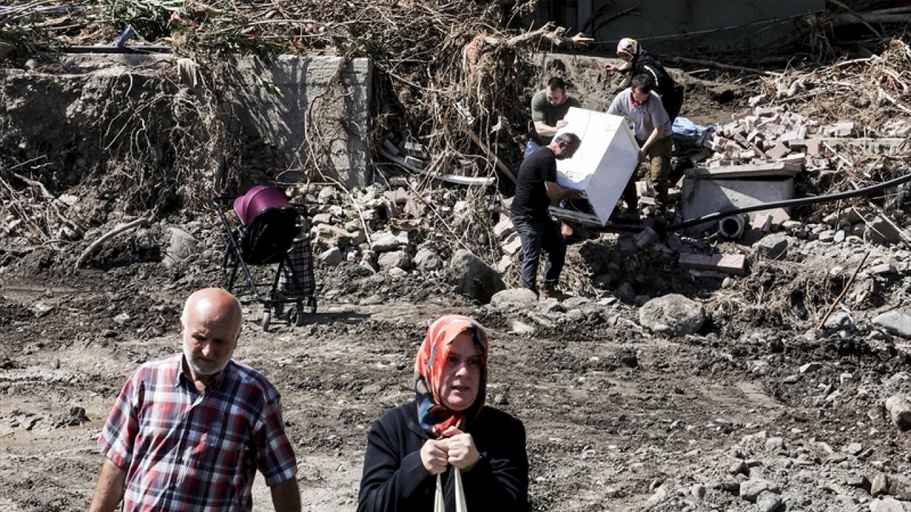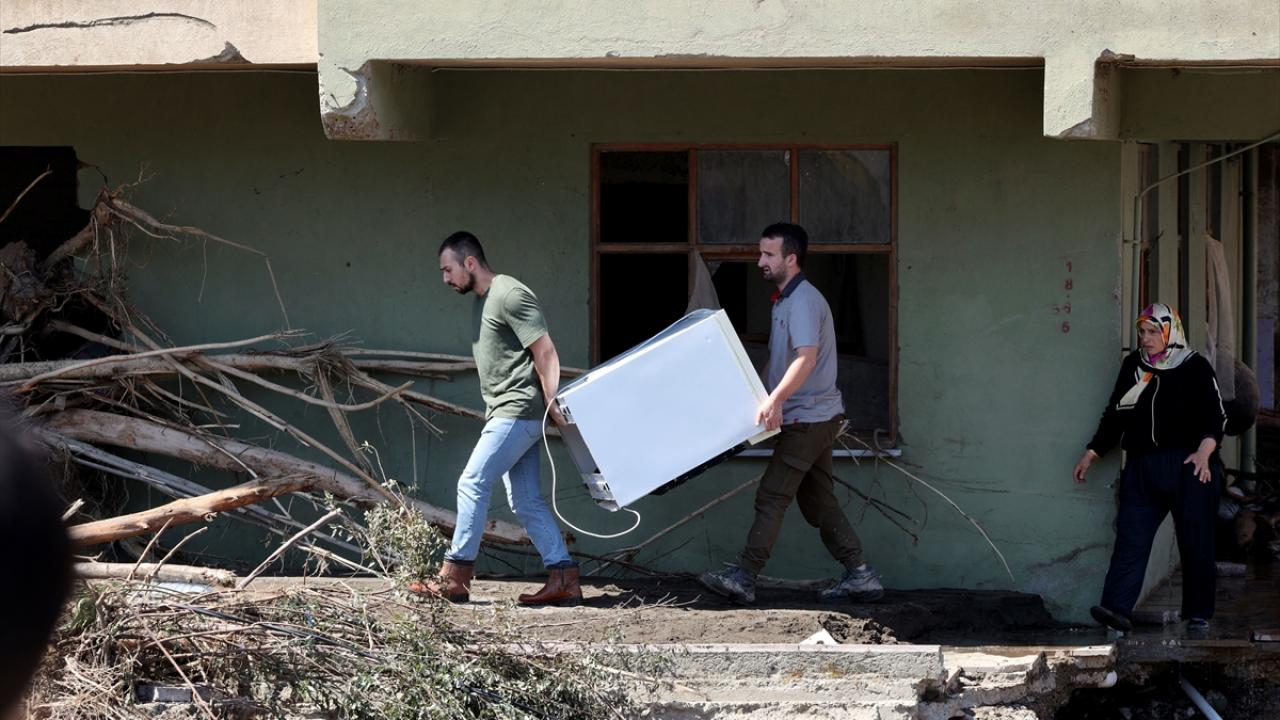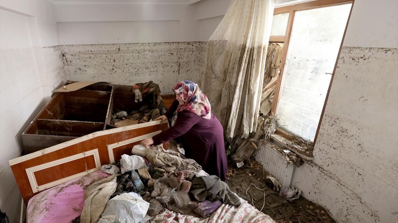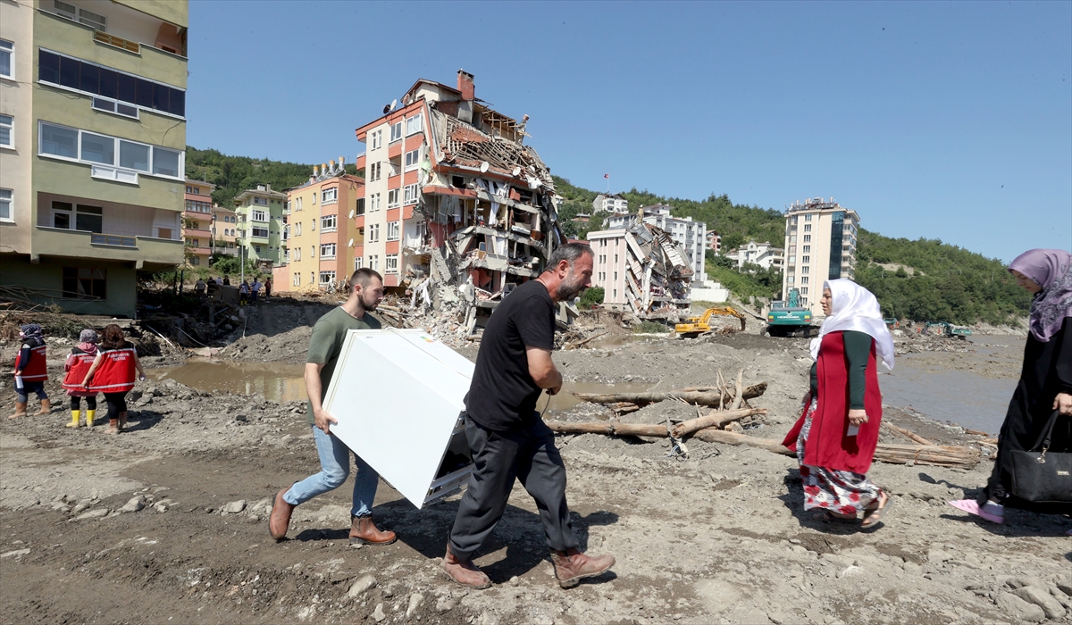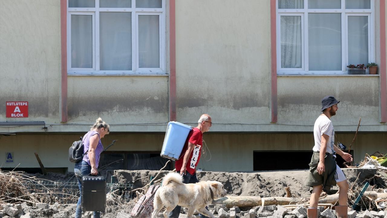 Sel felaketinin yaşandığı Kastamonu'nun Bozkurt ilçesinde afetzedeler, sağlam kalan ancak girişleri su ve çamurla dolan apartmanlara girerek eşyalarını tahliye etti.
