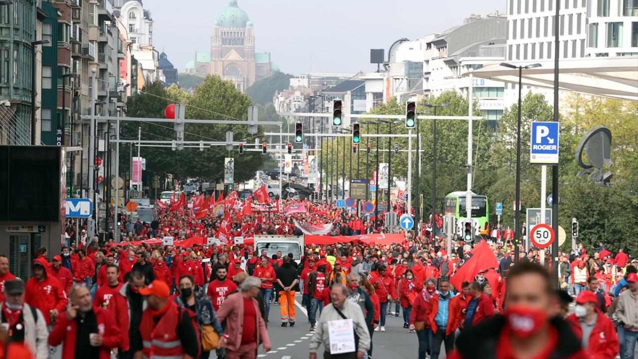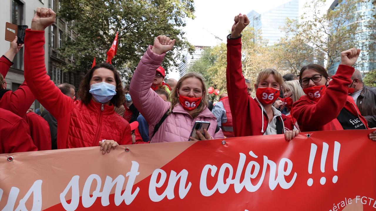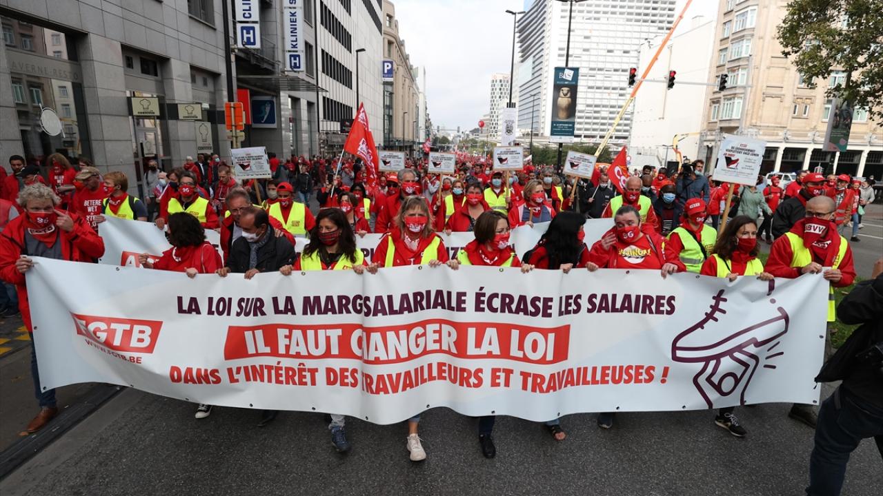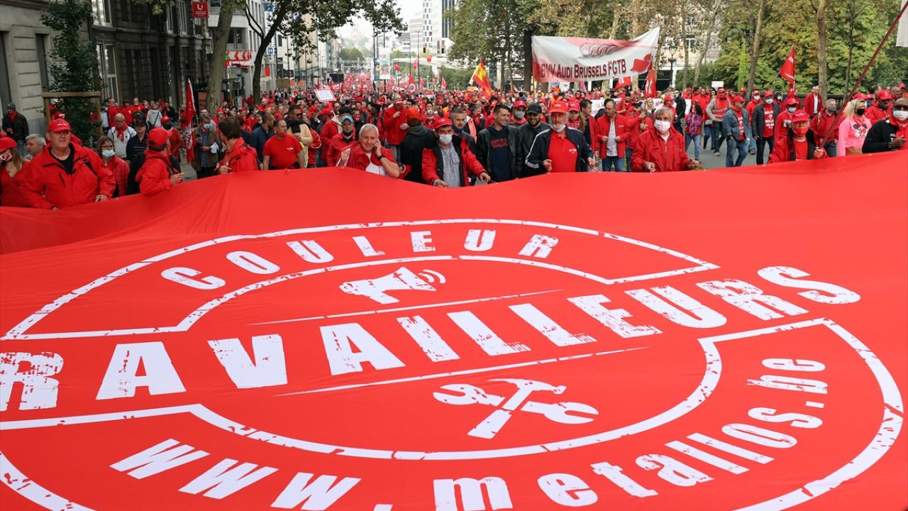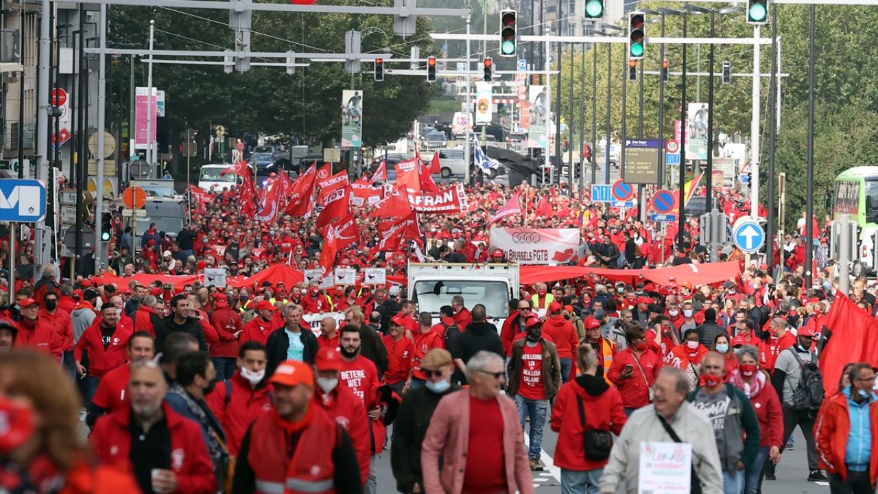 Belçika'nın başkenti Brüksel'de Kuzey (Gare du Nord) tren istasyonu önünde toplanan binlerce işçi, ücretlerinin artırılmasına sınır koyan yasayı protesto etmek için yürüyüş düzenledi.