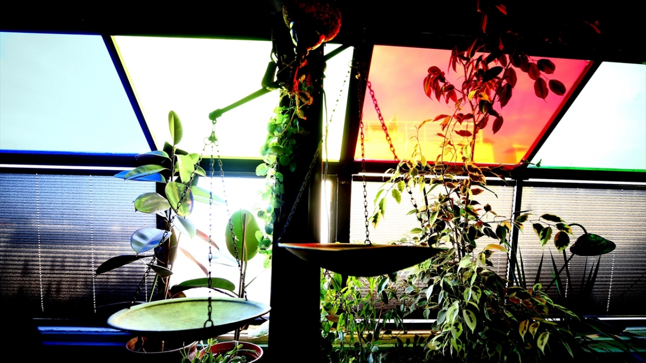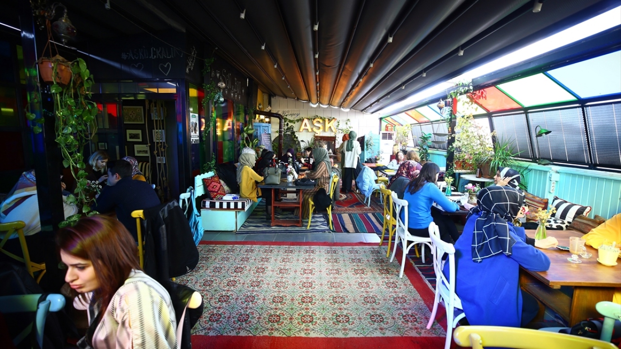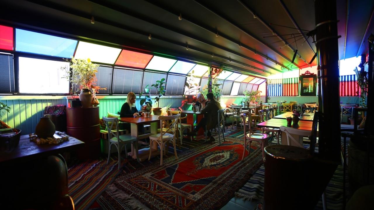 Kafede gündüz vakti oturanlar renkli pencerelerden yansıyan güneş ışığıyla aydınlanıyor.