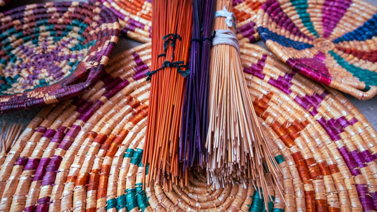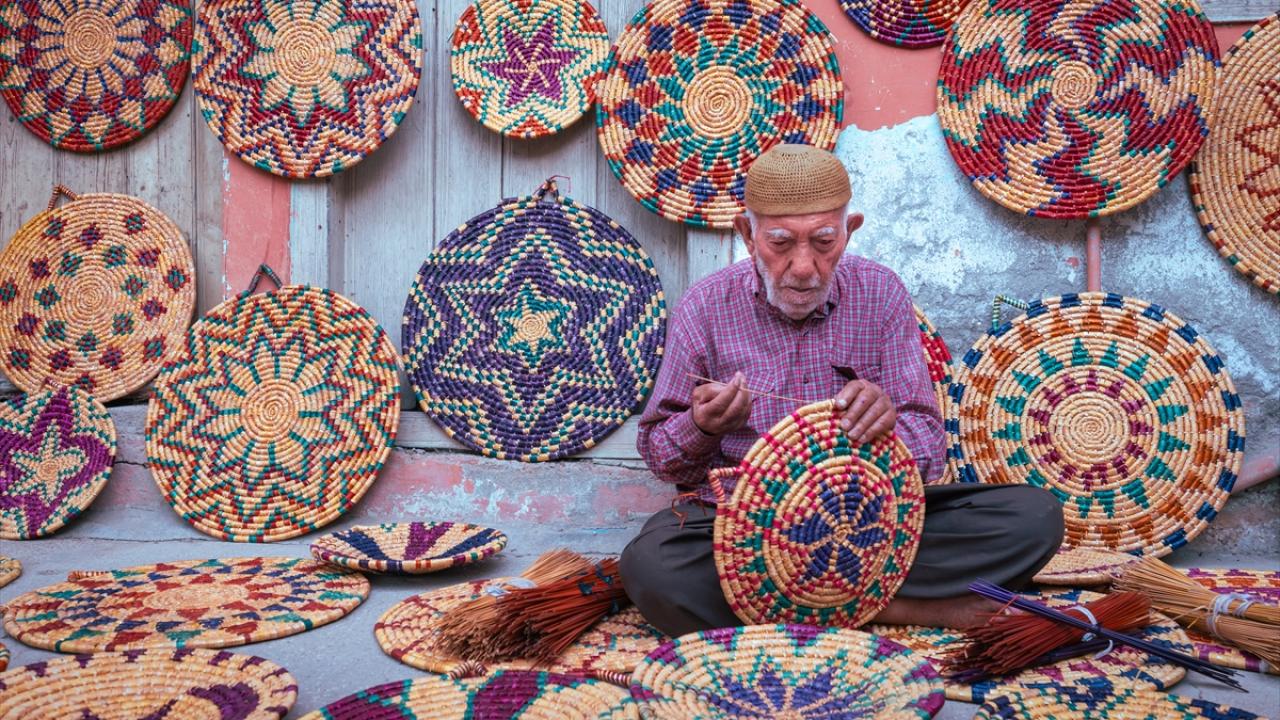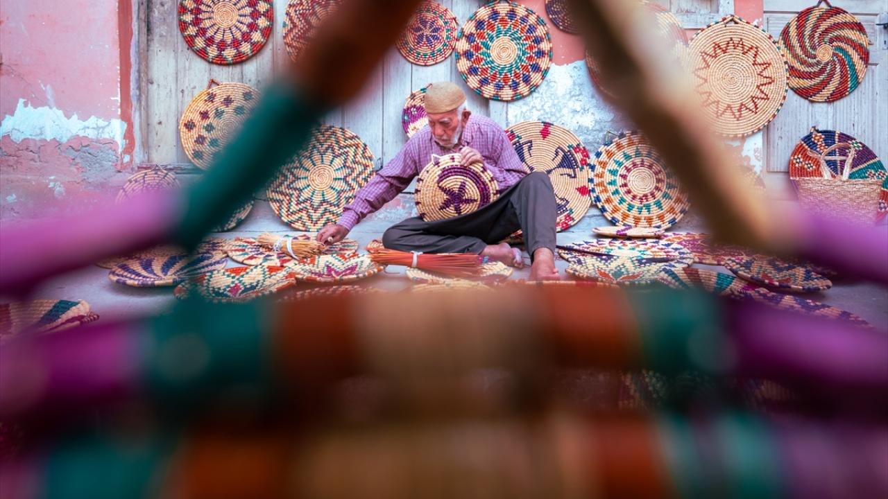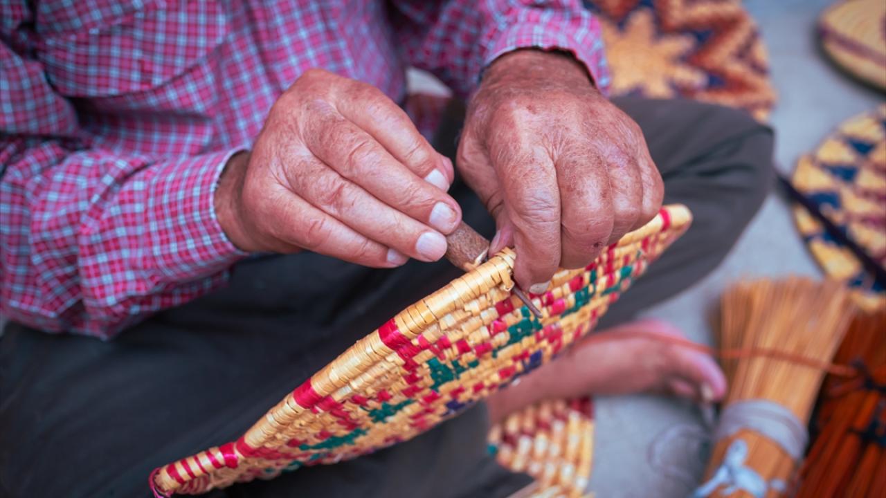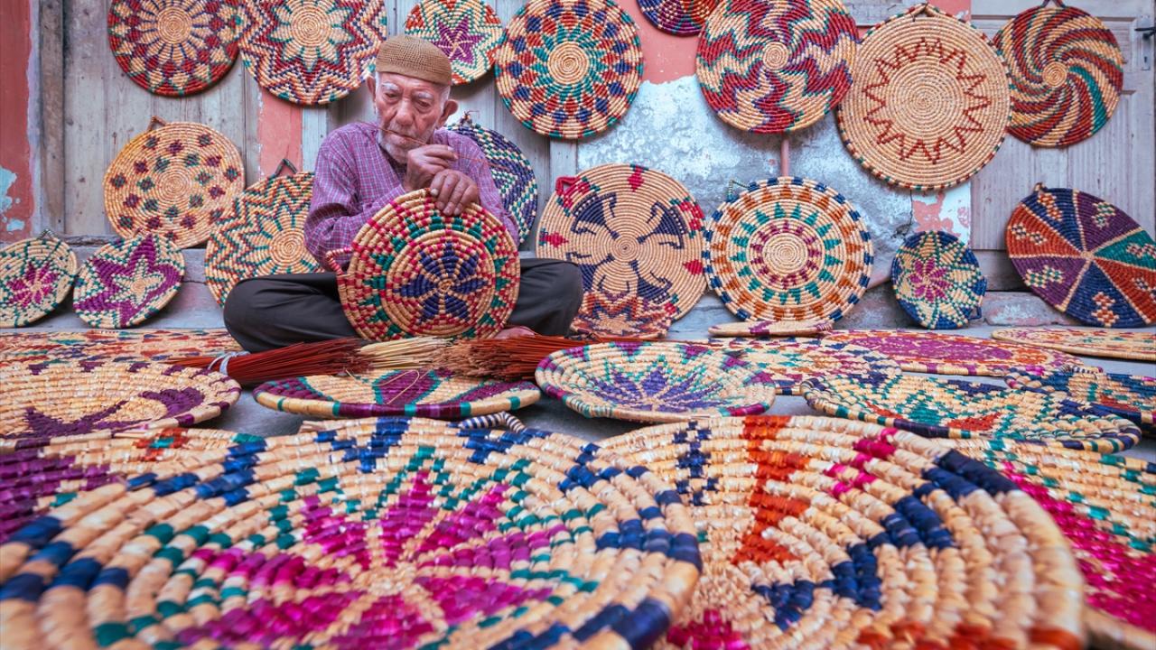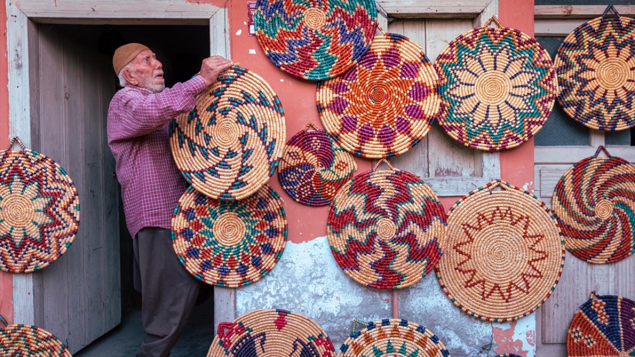 İlerlemiş yaşına rağmen hasır örücülüğünü devam ettiren Köleoğlu, hasat zamanı tarlalardan toplanan buğday saplarını kök boya yardımıyla renklendiriyor.