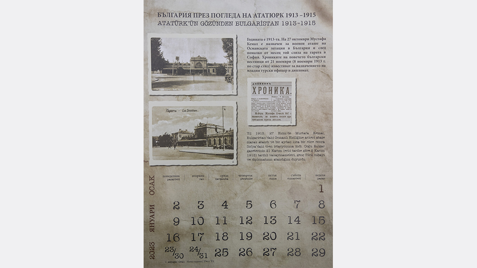 Takvimin ilk sayfasında, Atatürk`ün 27 Ekim 1913`te Bulgaristan`daki Osmanlı Elçiliğine askeri ataşe olarak atandığı ve bir aydan daha kısa sürede Sofya`ya geldiği belirtildi.