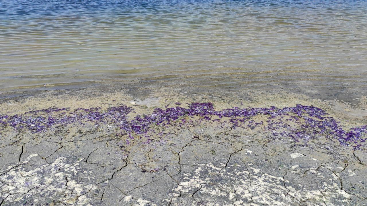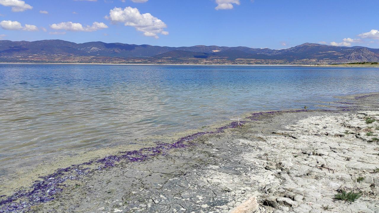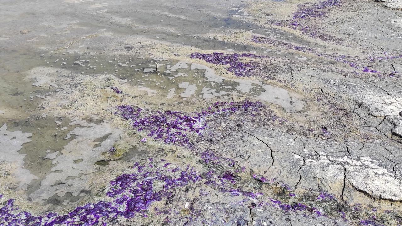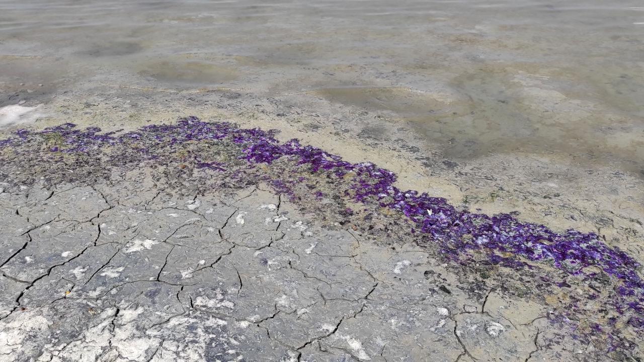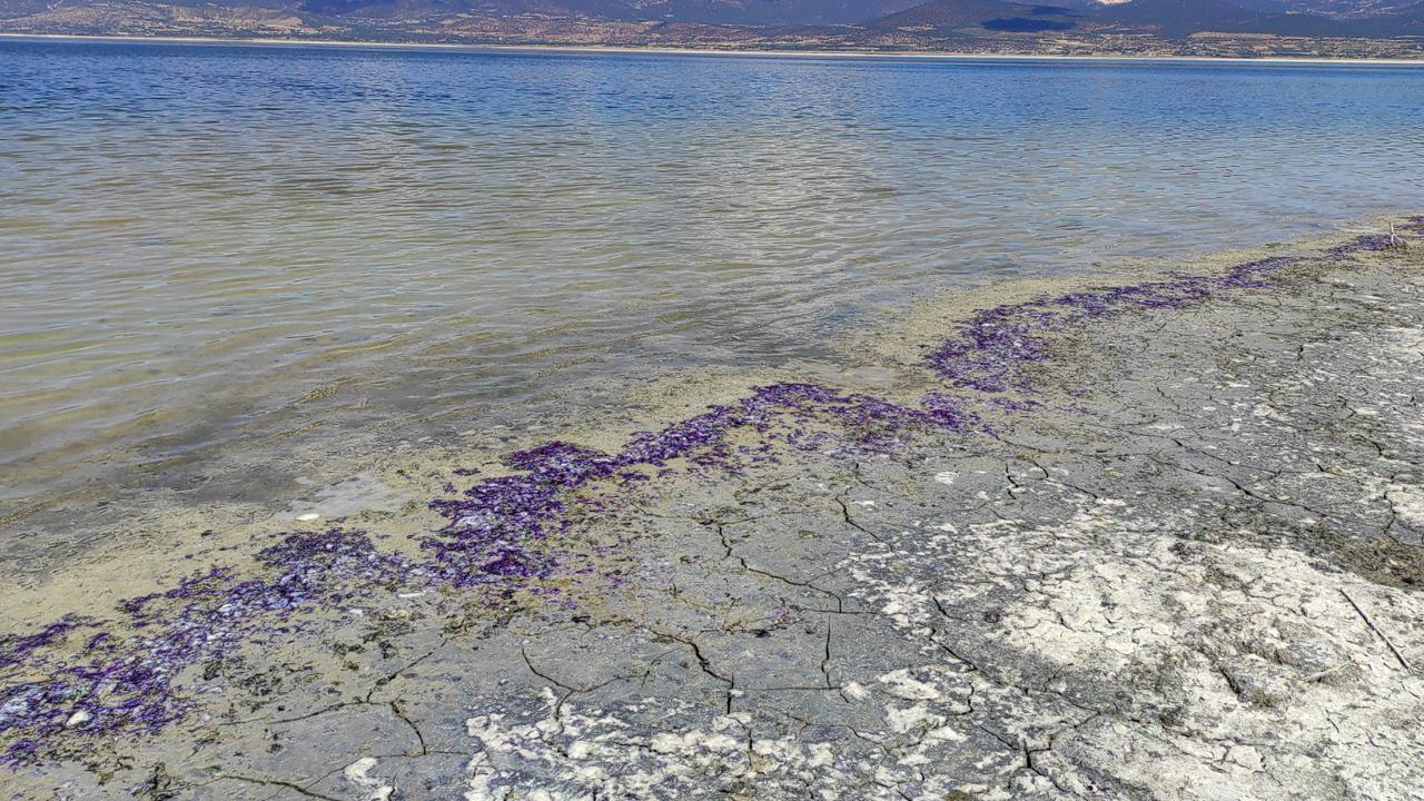 Alg patlaması nedeniyle sarı ve yeşile dönen Burdur Gölü'nde, bu kez sahildeki kumların rengi mora döndü.