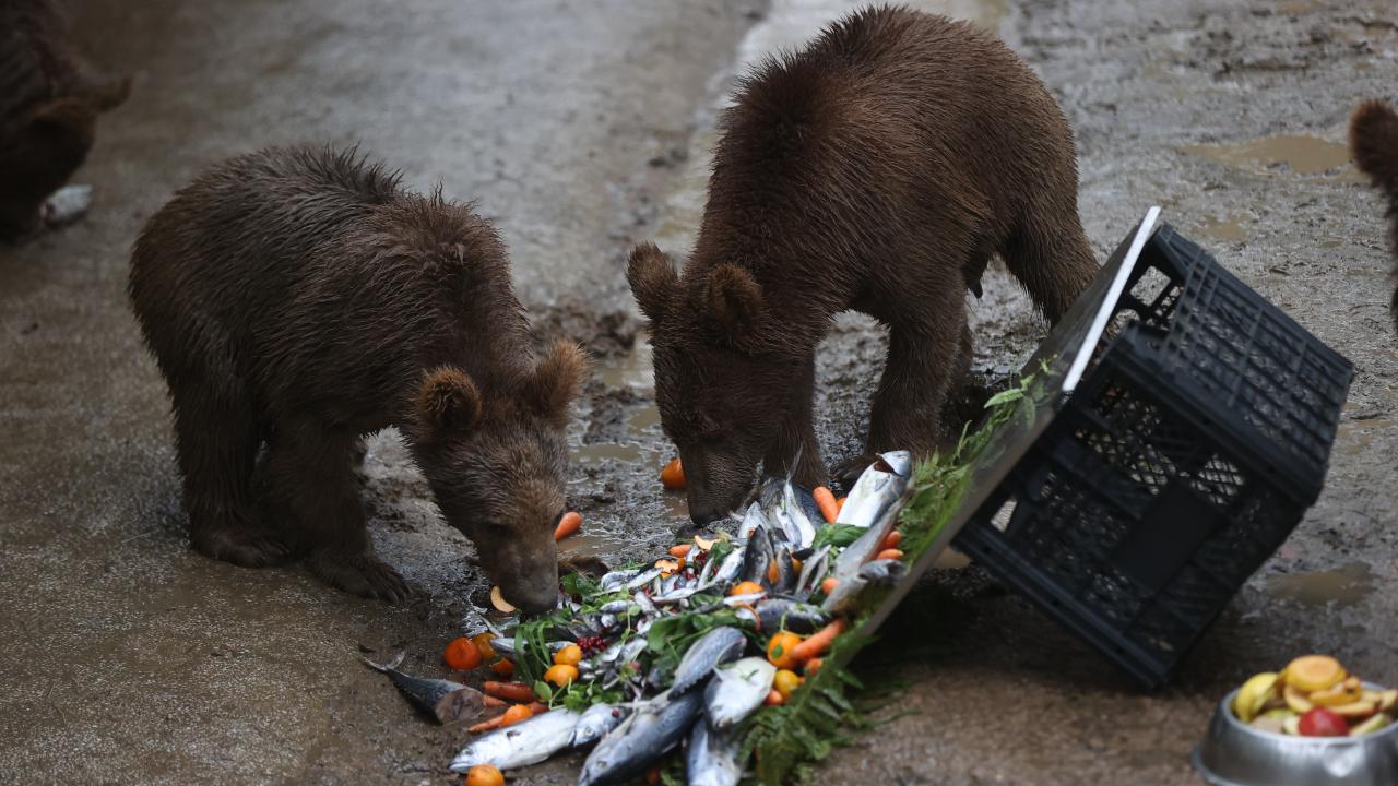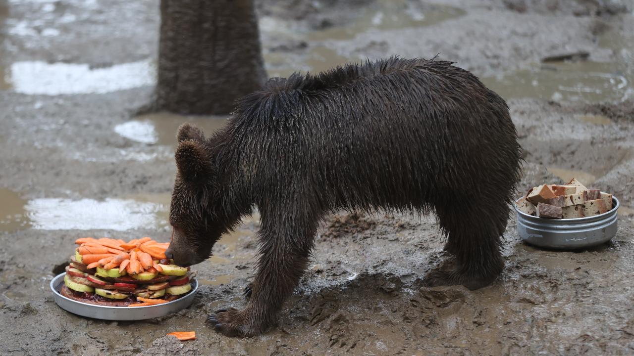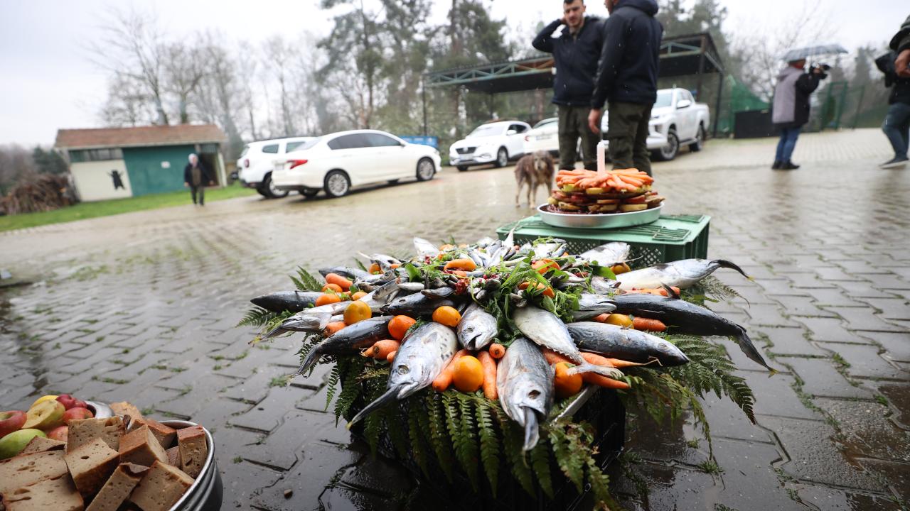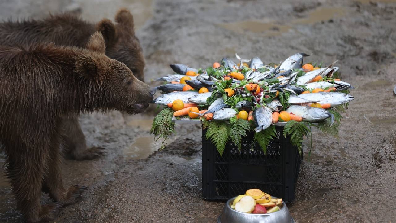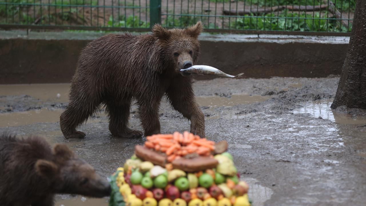 Temsili doğum günü kutlamasında, balık, reçel, sebze, meyve ve besin değerli yüksek çeşitli ürünlerle hazırlanan pasta görünümlü yiyecekler, özel olarak ayılara verildi.