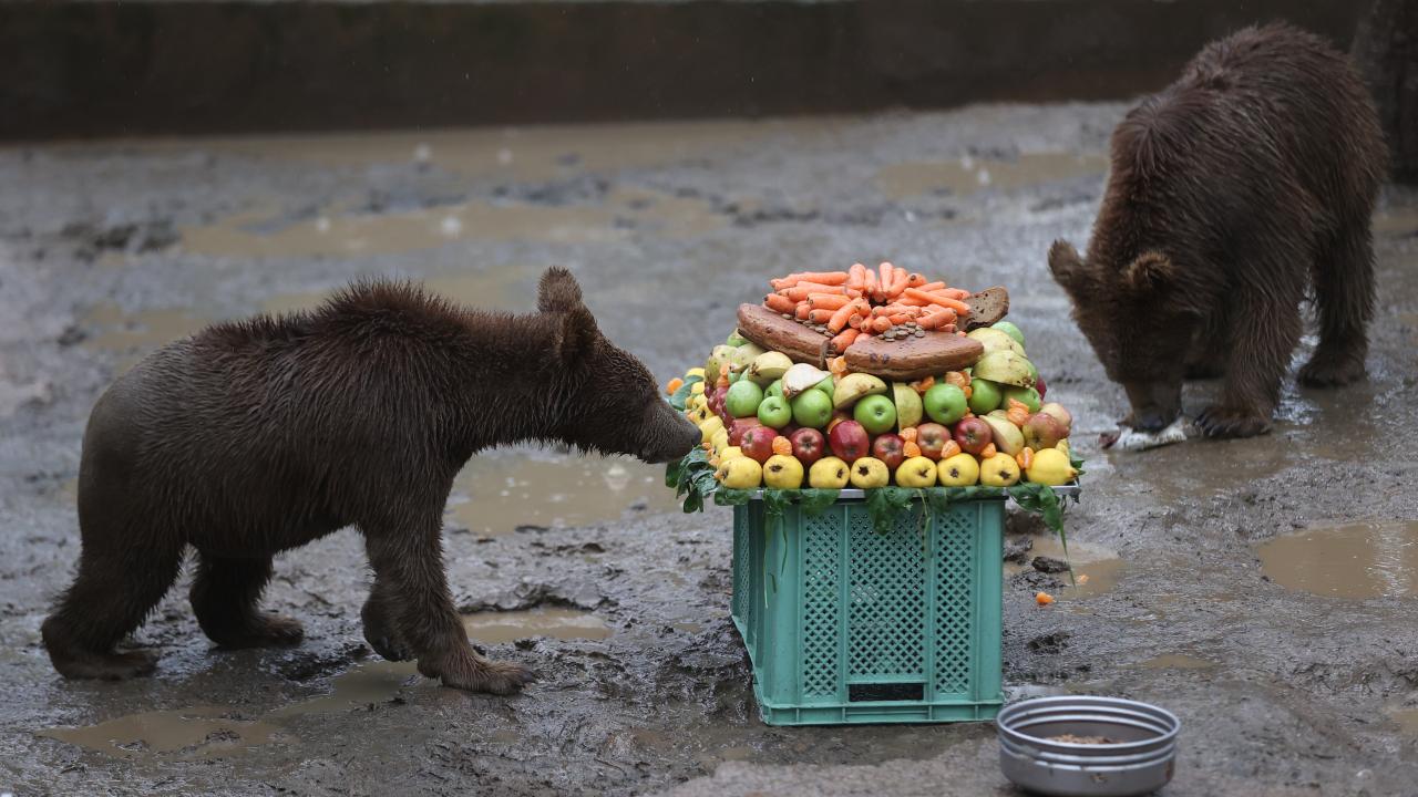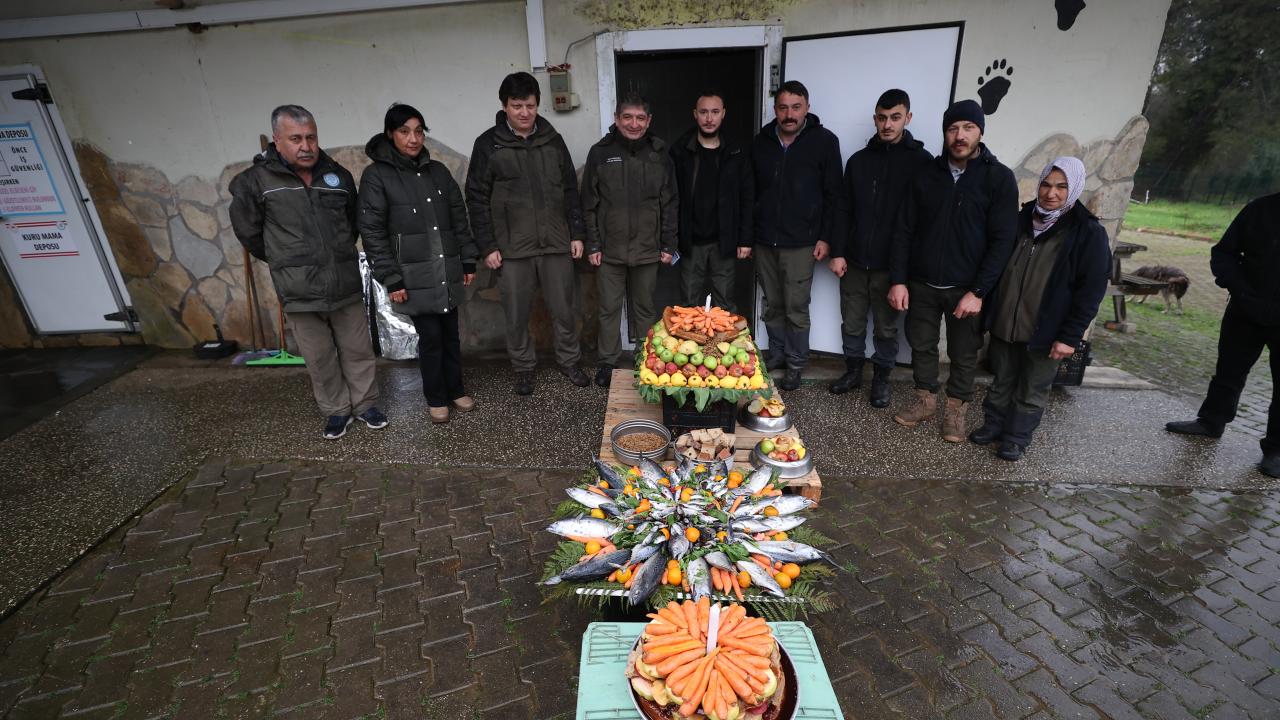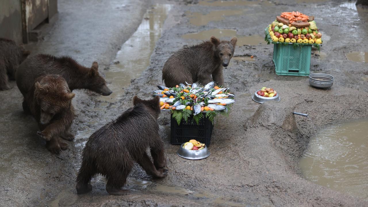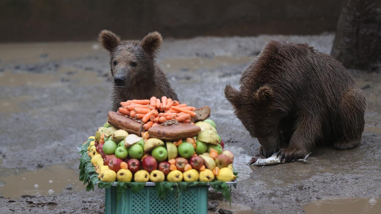 Temsili doğum günü kutlamasında, balık, reçel, sebze, meyve ve besin değerli yüksek çeşitli ürünlerle hazırlanan pasta görünümlü yiyecekler, özel olarak ayılara verildi.