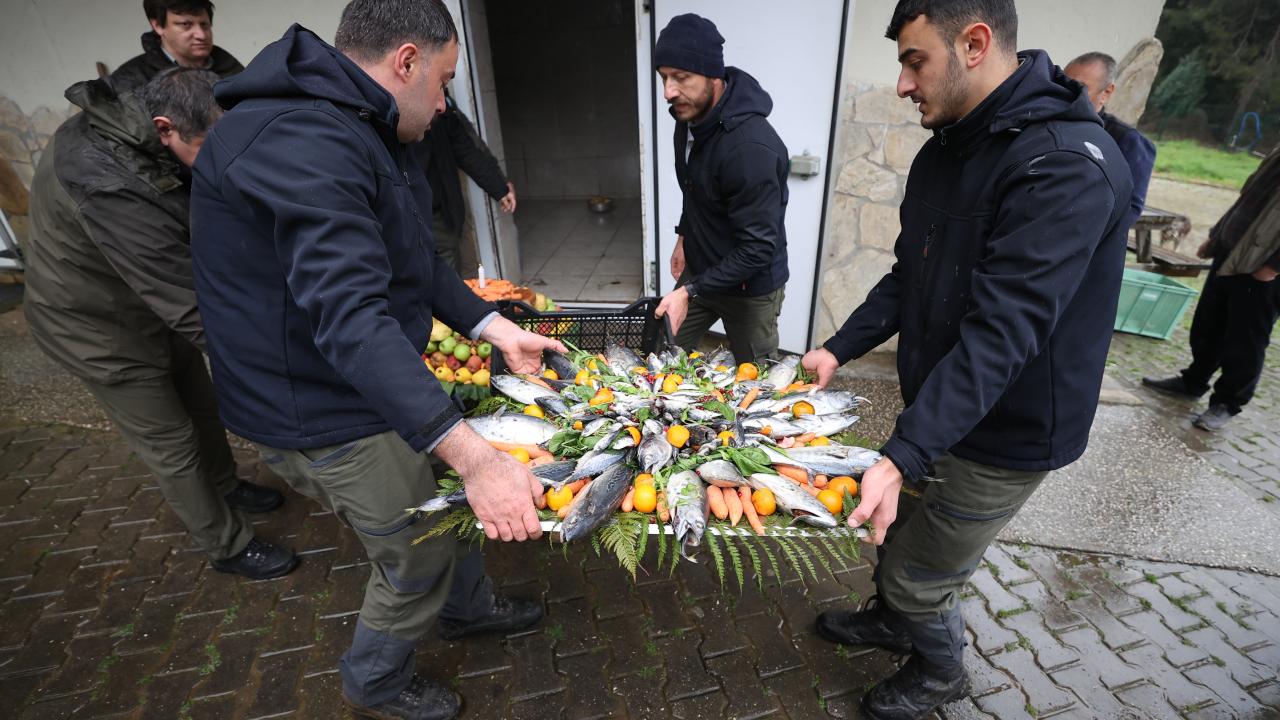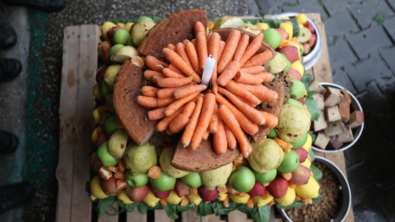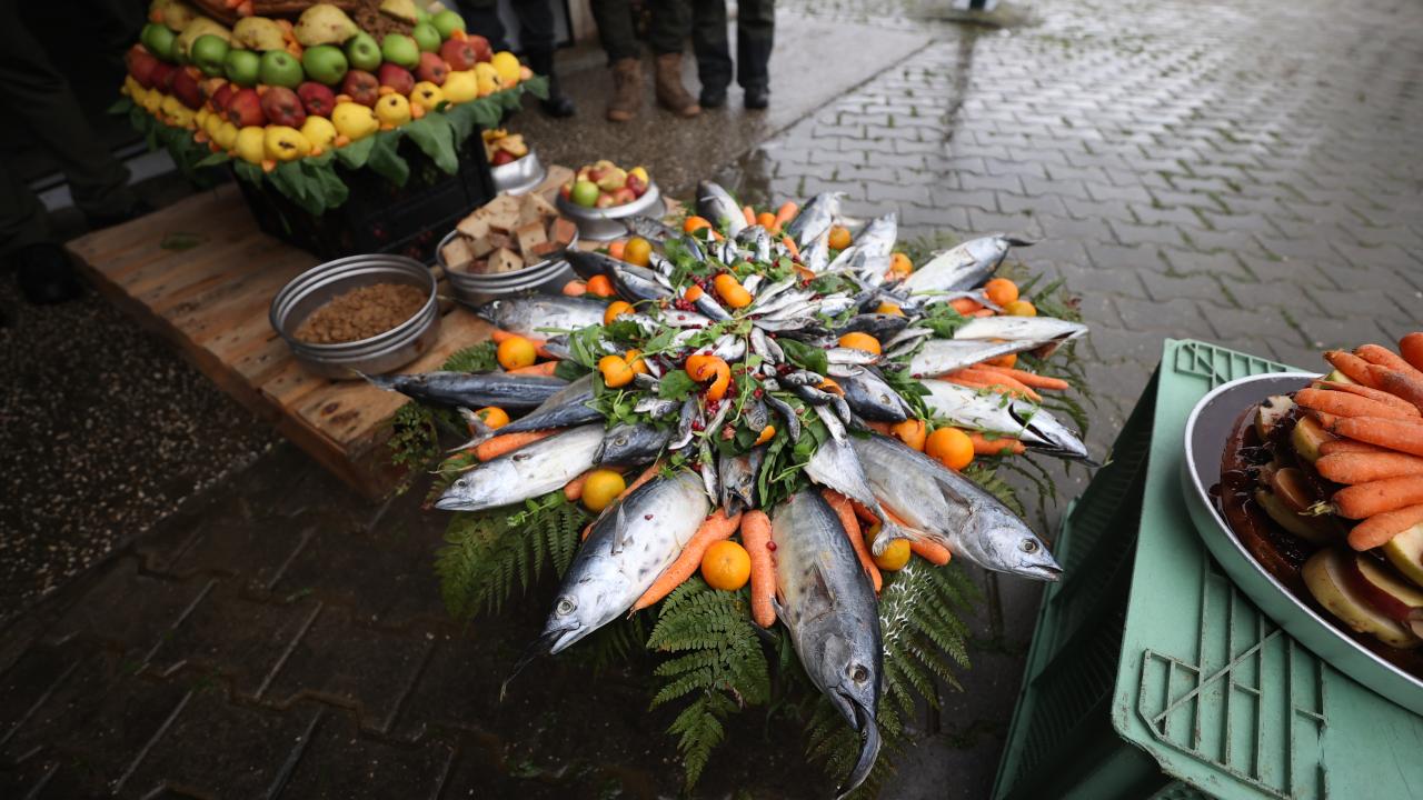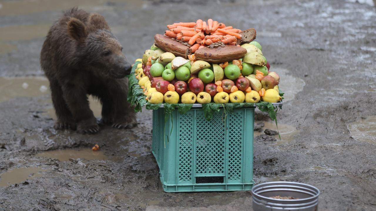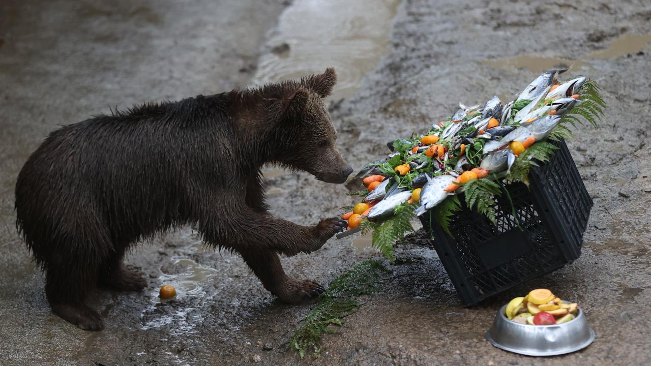 Temsili doğum günü kutlamasında, balık, reçel, sebze, meyve ve besin değerli yüksek çeşitli ürünlerle hazırlanan pasta görünümlü yiyecekler, özel olarak ayılara verildi.