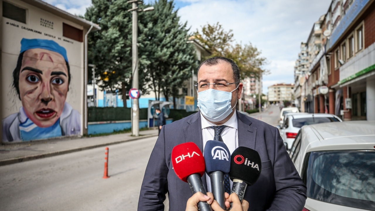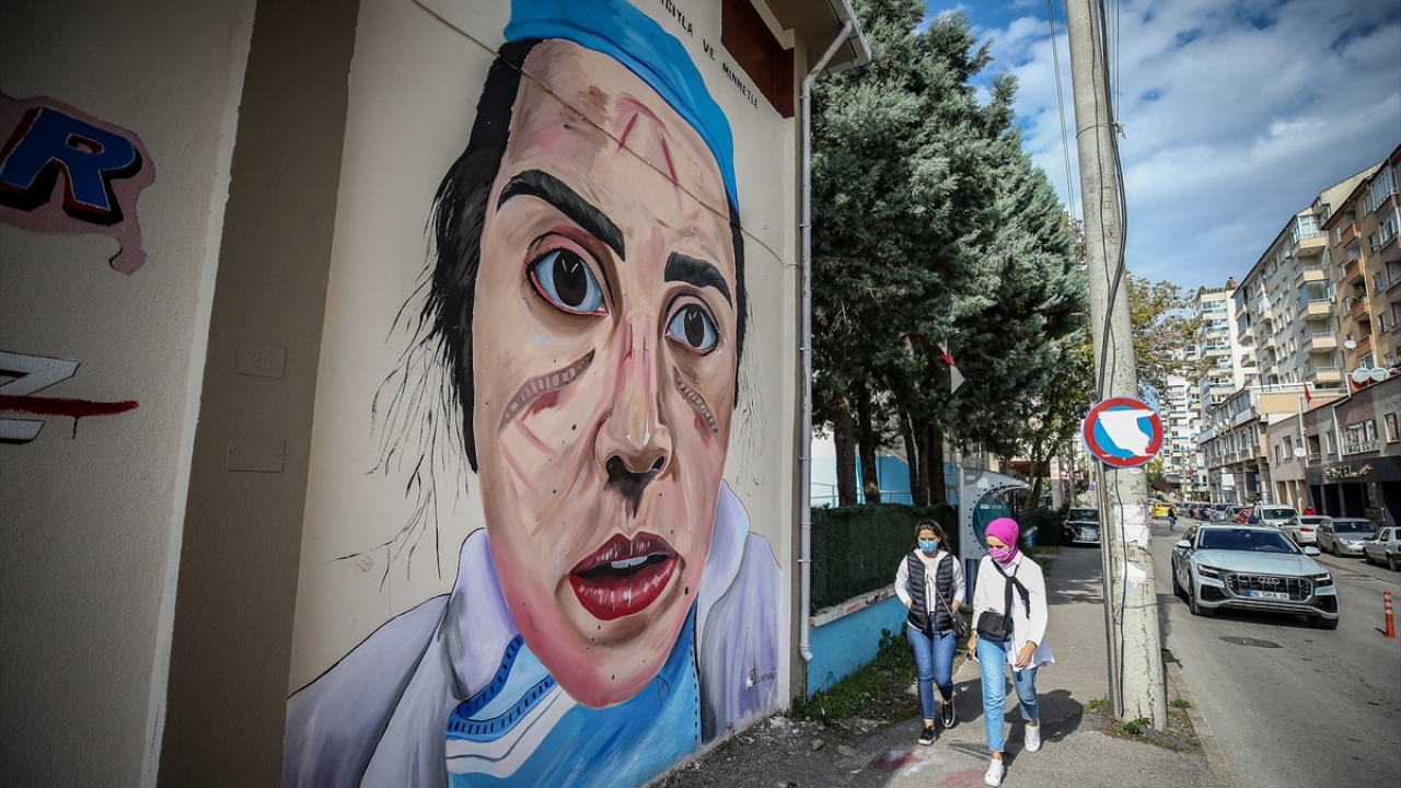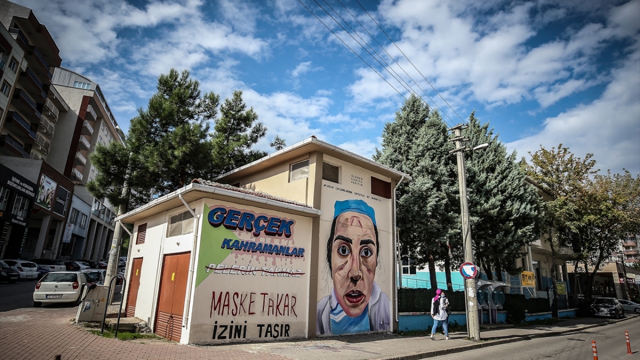 Bursa'da, kentteki bazı trafolara, sağlık çalışanlarının yeni tip koronavirüs (Covid-19) sürecindeki çalışmalarda maskeden kaynaklı yara olan yüzleri resmedildi.