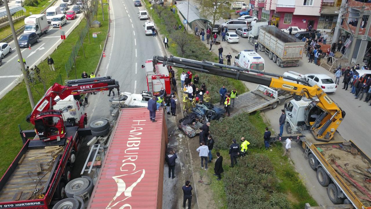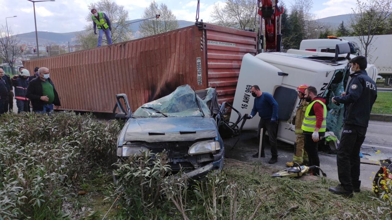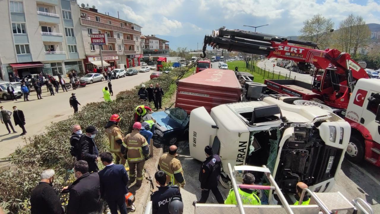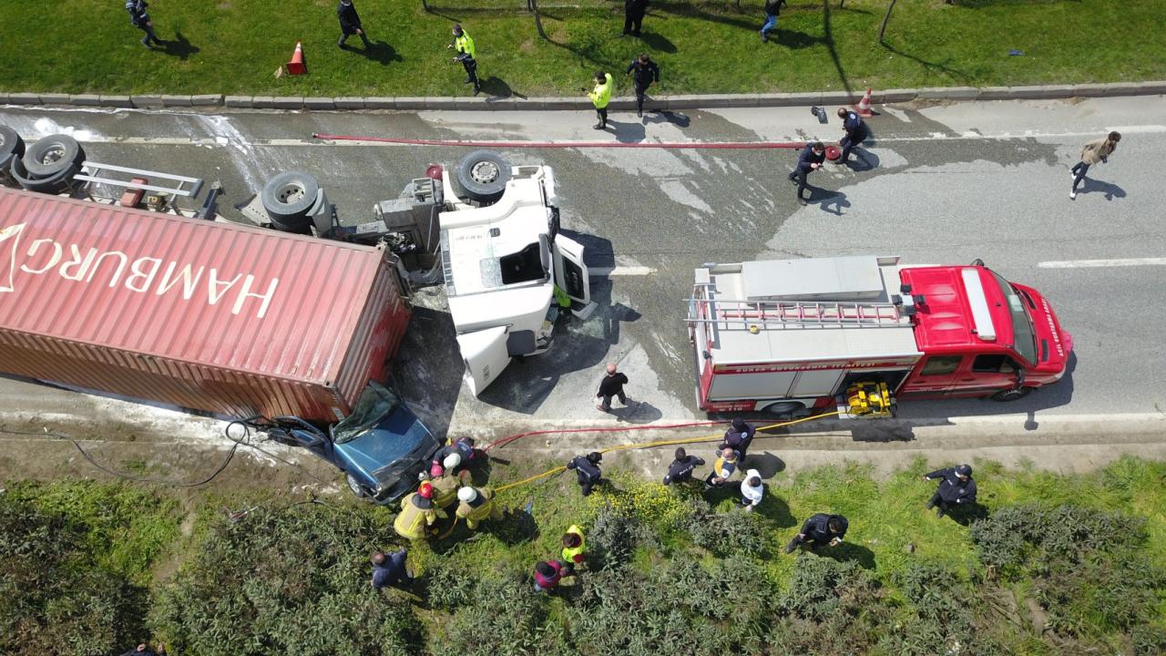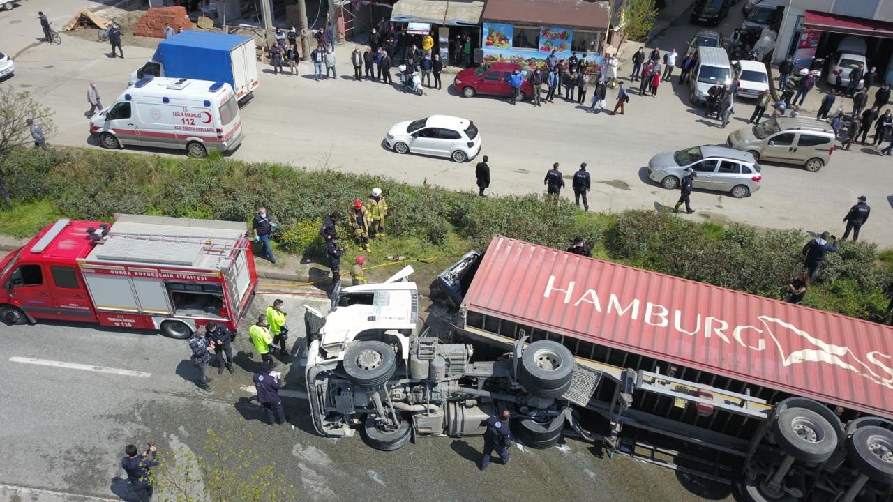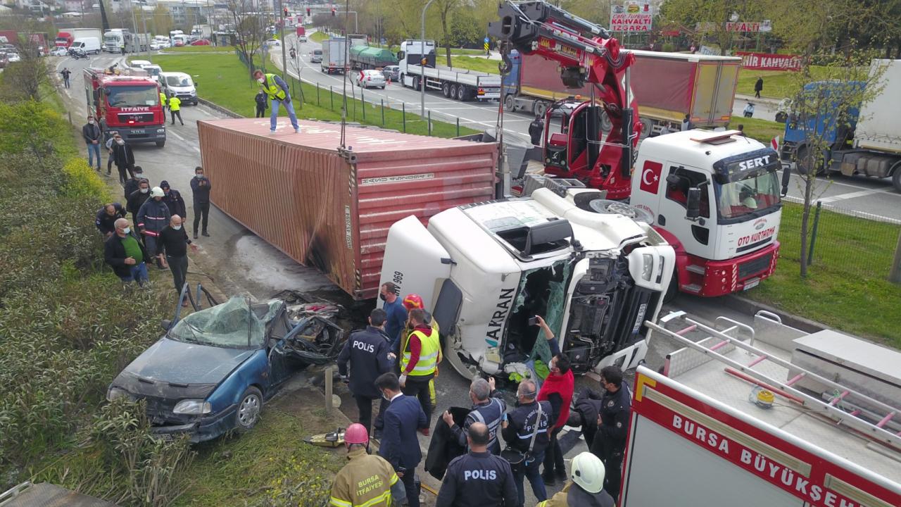 Bursa'nın Orhangazi ilçesinde kontrolden çıkan tır, aynı yönde seyir eden otomobilin üzerine devrildi. Tırın altında kalan otomobilin alev alması sonucu sürücü hayatını kaybetti. Kaza sebebiyle Bursa-Yalova karayolu bir süreliğine ulaşıma kapandı.